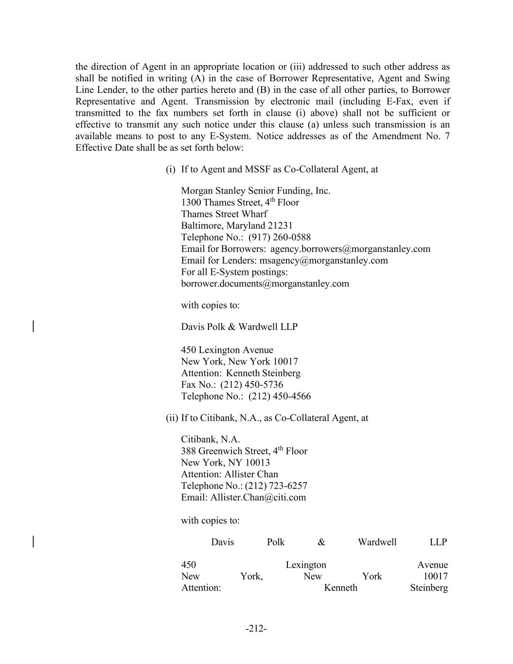 -212- the direction of Agent in an appropriate location or (iii) addressed to such other address as shall be notified in writing (A) in the case of Borrower Representative, Agent and Swing Line Lender, to the other parties hereto and (B) in the case of all other parties, to Borrower Representative and Agent. Transmission by electronic mail (including E-Fax, even if transmitted to the fax numbers set forth in clause (i) above) shall not be sufficient or effective to transmit any such notice under this clause (a) unless such transmission is an available means to post to any E-System. Notice addresses as of the Amendment No. 7 Effective Date shall be as set forth below: (i) If to Agent and MSSF as Co-Collateral Agent, at Morgan Stanley Senior Funding, Inc. 1300 Thames Street, 4th Floor Thames Street Wharf Baltimore, Maryland 21231 Telephone No.: (917) 260-0588 Email for Borrowers: agency.borrowers@morganstanley.com Email for Lenders: msagency@morganstanley.com For all E-System postings: borrower.documents@morganstanley.com with copies to: Davis Polk & Wardwell LLP 450 Lexington Avenue New York, New York 10017 Attention: Kenneth Steinberg Fax No.: (212) 450-5736 Telephone No.: (212) 450-4566 (ii) If to Citibank, N.A., as Co-Collateral Agent, at Citibank, N.A. 388 Greenwich Street, 4th Floor New York, NY 10013 Attention: Allister Chan Telephone No.: (212) 723-6257 Email: Allister.Chan@citi.com with copies to: Davis Polk & Wardwell LLP 450 Lexington Avenue New York, New York 10017 Attention: Kenneth Steinberg