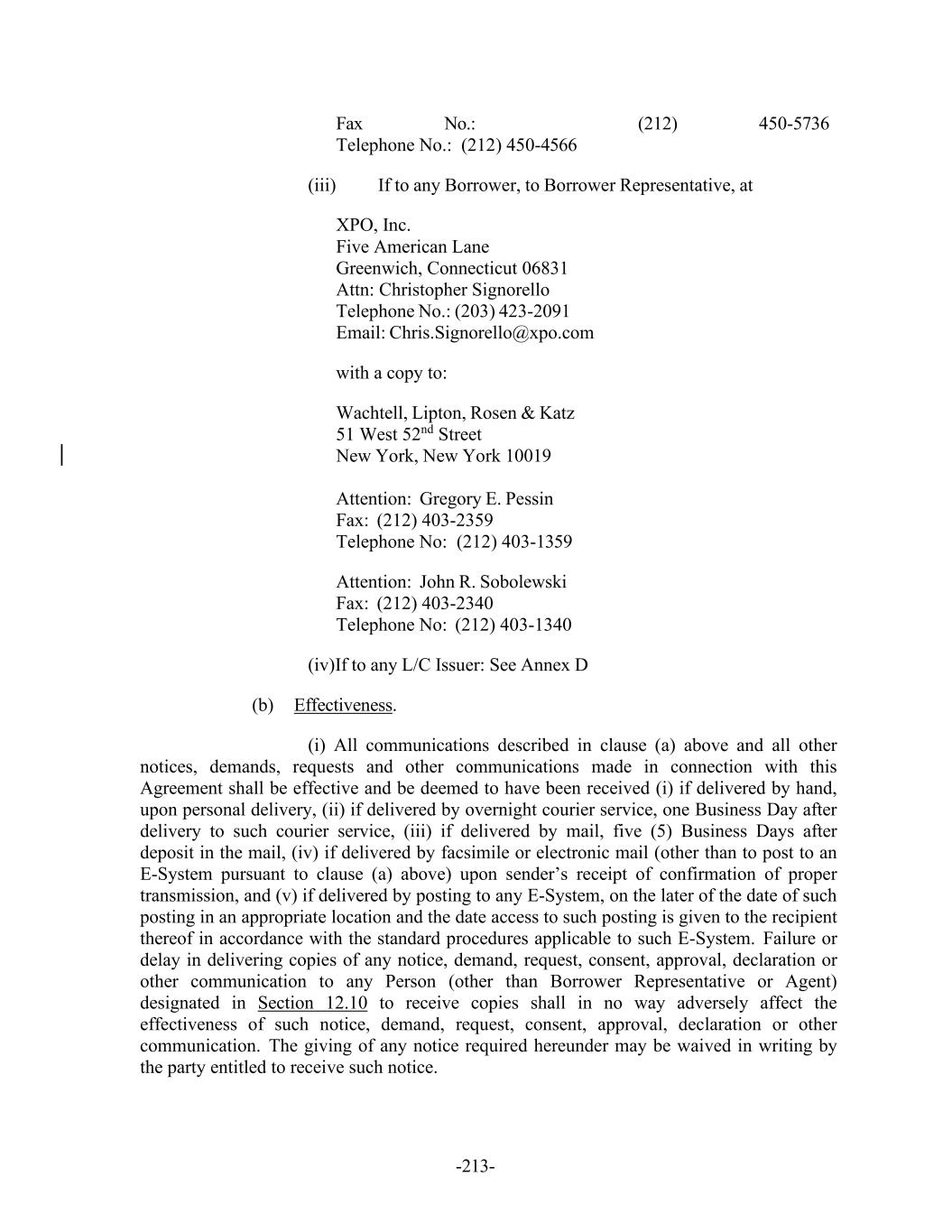 -213- Fax No.: (212) 450-5736 Telephone No.: (212) 450-4566 (iii) If to any Borrower, to Borrower Representative, at XPO, Inc. Five American Lane Greenwich, Connecticut 06831 Attn: Christopher Signorello Telephone No.: (203) 423-2091 Email: Chris.Signorello@xpo.com with a copy to: Wachtell, Lipton, Rosen & Katz 51 West 52nd Street New York, New York 10019 Attention: Gregory E. Pessin Fax: (212) 403-2359 Telephone No: (212) 403-1359 Attention: John R. Sobolewski Fax: (212) 403-2340 Telephone No: (212) 403-1340 (iv)If to any L/C Issuer: See Annex D (b) Effectiveness. (i) All communications described in clause (a) above and all other notices, demands, requests and other communications made in connection with this Agreement shall be effective and be deemed to have been received (i) if delivered by hand, upon personal delivery, (ii) if delivered by overnight courier service, one Business Day after delivery to such courier service, (iii) if delivered by mail, five (5) Business Days after deposit in the mail, (iv) if delivered by facsimile or electronic mail (other than to post to an E-System pursuant to clause (a) above) upon sender’s receipt of confirmation of proper transmission, and (v) if delivered by posting to any E-System, on the later of the date of such posting in an appropriate location and the date access to such posting is given to the recipient thereof in accordance with the standard procedures applicable to such E-System. Failure or delay in delivering copies of any notice, demand, request, consent, approval, declaration or other communication to any Person (other than Borrower Representative or Agent) designated in Section 12.10 to receive copies shall in no way adversely affect the effectiveness of such notice, demand, request, consent, approval, declaration or other communication. The giving of any notice required hereunder may be waived in writing by the party entitled to receive such notice.