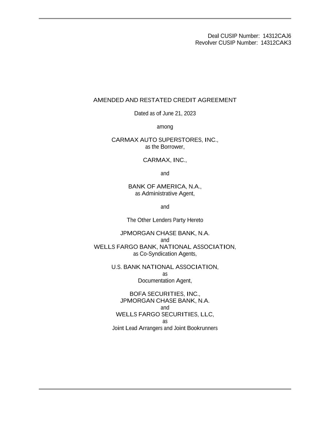 Deal CUSIP Number: 14312CAJ6 Revolver CUSIP Number: 14312CAK3 AMENDED AND RESTATED CREDIT AGREEMENT Dated as of June 21, 2023 among CARMAX AUTO SUPERSTORES, INC., as the Borrower, CARMAX, INC., and BANK OF AMERICA, N.A., as Administrative Agent, and The Other Lenders Party Hereto JPMORGAN CHASE BANK, N.A. and WELLS FARGO BANK, NATIONAL ASSOCIATION, as Co-Syndication Agents, U.S. BANK NATIONAL ASSOCIATION, as Documentation Agent, BOFA SECURITIES, INC., JPMORGAN CHASE BANK, N.A. and WELLS FARGO SECURITIES, LLC, as Joint Lead Arrangers and Joint Bookrunners