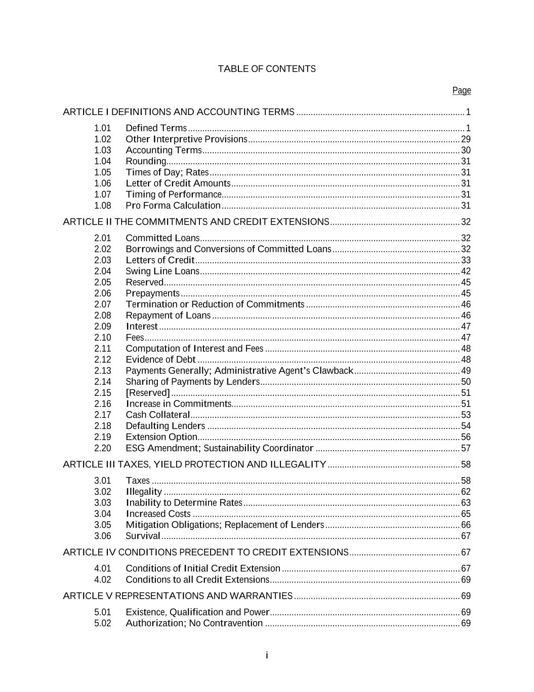 i TABLE OF CONTENTS Page ARTICLE I DEFINITIONS AND ACCOUNTING TERMS ...................................................................... 1 1.01 Defined Terms ................................................................................................................... 1 1.02 Other Interpretive Provisions ........................................................................................ 29 1.03 Accounting Terms ........................................................................................................... 30 1.04 Rounding.......................................................................................................................... 31 1.05 Times of Day; Rates ........................................................................................................ 31 1.06 Letter of Credit Amounts ............................................................................................... 31 1.07 Timing of Performance................................................................................................... 31 1.08 Pro Forma Calculation ................................................................................................... 31 ARTICLE II THE COMMITMENTS AND CREDIT EXTENSIONS ...................................................... 32 2.01 Committed Loans ............................................................................................................ 32 2.02 Borrowings and Conversions of Committed Loans ..................................................... 32 2.03 Letters of Credit .............................................................................................................. 33 2.04 Swing Line Loans ............................................................................................................ 42 2.05 Reserved ........................................................................................................................... 45 2.06 Prepayments .................................................................................................................... 45 2.07 Termination or Reduction of Commitments ................................................................ 46 2.08 Repayment of Loans ....................................................................................................... 46 2.09 Interest ............................................................................................................................. 47 2.10 Fees ................................................................................................................................... 47 2.11 Computation of Interest and Fees ................................................................................. 48 2.12 Evidence of Debt ............................................................................................................. 48 2.13 Payments Generally; Administrative Agent’s Clawback ............................................ 49 2.14 Sharing of Payments by Lenders ................................................................................... 50 2.15 [Reserved] ........................................................................................................................ 51 2.16 Increase in Commitments............................................................................................... 51 2.17 Cash Collateral ................................................................................................................ 53 2.18 Defaulting Lenders ......................................................................................................... 54 2.19 Extension Option. ............................................................................................................ 56 2.20 ESG Amendment; Sustainability Coordinator ............................................................ 57 ARTICLE III TAXES, YIELD PROTECTION AND ILLEGALITY ....................................................... 58 3.01 Taxes ................................................................................................................................ 58 3.02 Illegality ........................................................................................................................... 62 3.03 Inability to Determine Rates .......................................................................................... 63 3.04 Increased Costs ............................................................................................................... 65 3.05 Mitigation Obligations; Replacement of Lenders ........................................................ 66 3.06 Survival ............................................................................................................................ 67 ARTICLE IV CONDITIONS PRECEDENT TO CREDIT EXTENSIONS .............................................. 67 4.01 Conditions of Initial Credit Extension .......................................................................... 67 4.02 Conditions to all Credit Extensions ............................................................................... 69 ARTICLE V REPRESENTATIONS AND WARRANTIES ..................................................................... 69 5.01 Existence, Qualification and Power ............................................................................... 69 5.02 Authorization; No Contravention ................................................................................. 69