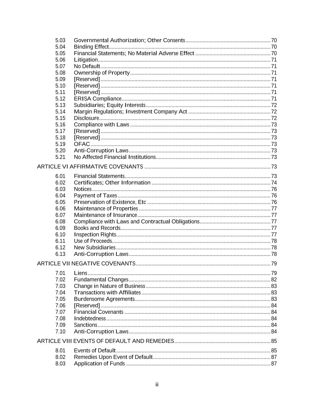 ii 5.03 Governmental Authorization; Other Consents ............................................................ 70 5.04 Binding Effect .................................................................................................................. 70 5.05 Financial Statements; No Material Adverse Effect ..................................................... 70 5.06 Litigation.......................................................................................................................... 71 5.07 No Default ........................................................................................................................ 71 5.08 Ownership of Property ................................................................................................... 71 5.09 [Reserved] ........................................................................................................................ 71 5.10 [Reserved] ........................................................................................................................ 71 5.11 [Reserved] ........................................................................................................................ 71 5.12 ERISA Compliance ......................................................................................................... 71 5.13 Subsidiaries; Equity Interests ........................................................................................ 72 5.14 Margin Regulations; Investment Company Act .......................................................... 72 5.15 Disclosure ......................................................................................................................... 72 5.16 Compliance with Laws ................................................................................................... 73 5.17 [Reserved] ........................................................................................................................ 73 5.18 [Reserved] ........................................................................................................................ 73 5.19 OFAC ............................................................................................................................... 73 5.20 Anti-Corruption Laws .................................................................................................... 73 5.21 No Affected Financial Institutions. ................................................................................ 73 ARTICLE VI AFFIRMATIVE COVENANTS ......................................................................................... 73 6.01 Financial Statements ....................................................................................................... 73 6.02 Certificates; Other Information .................................................................................... 74 6.03 Notices .............................................................................................................................. 76 6.04 Payment of Taxes ............................................................................................................ 76 6.05 Preservation of Existence, Etc ....................................................................................... 76 6.06 Maintenance of Properties ............................................................................................. 77 6.07 Maintenance of Insurance .............................................................................................. 77 6.08 Compliance with Laws and Contractual Obligations .................................................. 77 6.09 Books and Records .......................................................................................................... 77 6.10 Inspection Rights ............................................................................................................. 77 6.11 Use of Proceeds ................................................................................................................ 78 6.12 New Subsidiaries ............................................................................................................. 78 6.13 Anti-Corruption Laws .................................................................................................... 78 ARTICLE VII NEGATIVE COVENANTS ............................................................................................... 79 7.01 Liens ................................................................................................................................. 79 7.02 Fundamental Changes .................................................................................................... 82 7.03 Change in Nature of Business ........................................................................................ 83 7.04 Transactions with Affiliates ........................................................................................... 83 7.05 Burdensome Agreements................................................................................................ 83 7.06 [Reserved] ........................................................................................................................ 84 7.07 Financial Covenants ....................................................................................................... 84 7.08 Indebtedness .................................................................................................................... 84 7.09 Sanctions .......................................................................................................................... 84 7.10 Anti-Corruption Laws .................................................................................................... 84 ARTICLE VIII EVENTS OF DEFAULT AND REMEDIES .................................................................... 85 8.01 Events of Default ...............................................................
