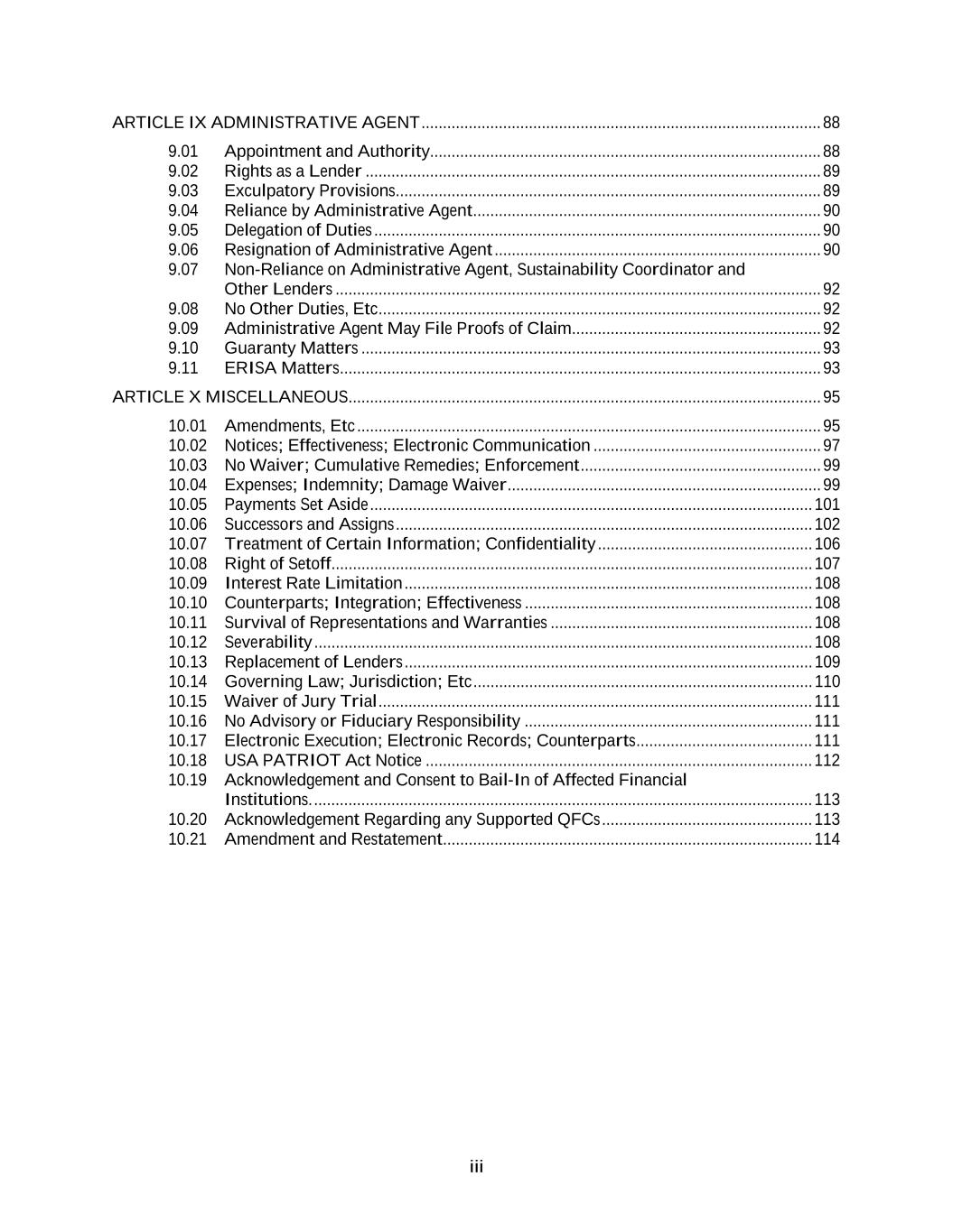 iii ARTICLE IX ADMINISTRATIVE AGENT ............................................................................................. 88 9.01 Appointment and Authority........................................................................................... 88 9.02 Rights as a Lender .......................................................................................................... 89 9.03 Exculpatory Provisions ................................................................................................... 89 9.04 Reliance by Administrative Agent ................................................................................. 90 9.05 Delegation of Duties ........................................................................................................ 90 9.06 Resignation of Administrative Agent ............................................................................ 90 9.07 Non-Reliance on Administrative Agent, Sustainability Coordinator and Other Lenders ................................................................................................................. 92 9.08 No Other Duties, Etc ....................................................................................................... 92 9.09 Administrative Agent May File Proofs of Claim .......................................................... 92 9.10 Guaranty Matters ........................................................................................................... 93 9.11 ERISA Matters ................................................................................................................ 93 ARTICLE X MISCELLANEOUS.............................................................................................................. 95 10.01 Amendments, Etc ............................................................................................................ 95 10.02 Notices; Effectiveness; Electronic Communication ..................................................... 97 10.03 No Waiver; Cumulative Remedies; Enforcement ........................................................ 99 10.04 Expenses; Indemnity; Damage Waiver ......................................................................... 99 10.05 Payments Set Aside ....................................................................................................... 101 10.06 Successors and Assigns ................................................................................................. 102 10.07 Treatment of Certain Information; Confidentiality .................................................. 106 10.08 Right of Setoff ................................................................................................................ 107 10.09 Interest Rate Limitation ............................................................................................... 108 10.10 Counterparts; Integration; Effectiveness ................................................................... 108 10.11 Survival of Representations and Warranties ............................................................. 108 10.12 Severability .................................................................................................................... 108 10.13 Replacement of Lenders ............................................................................................... 109 10.14 Governing Law; Jurisdiction; Etc ............................................................................... 110 10.15 Waiver of Jury Trial ..................................................................................................... 111 10.16 No Advisory or Fiduciary Responsibility ................................................................... 111 10.17 Electronic Execution; Electronic Records; Counterparts ......................................... 111 10.18 USA PATRIOT Act Notice .......................................................................................... 112 10.19 Acknowledgement and Consent to Bail-In of Affected Financial Institutions. .................................................................................................................... 113 10.20 Acknowledgement Regarding any Supported QFCs ................................................. 113 10.21 Amendment and Restatement ...................................................................................... 114