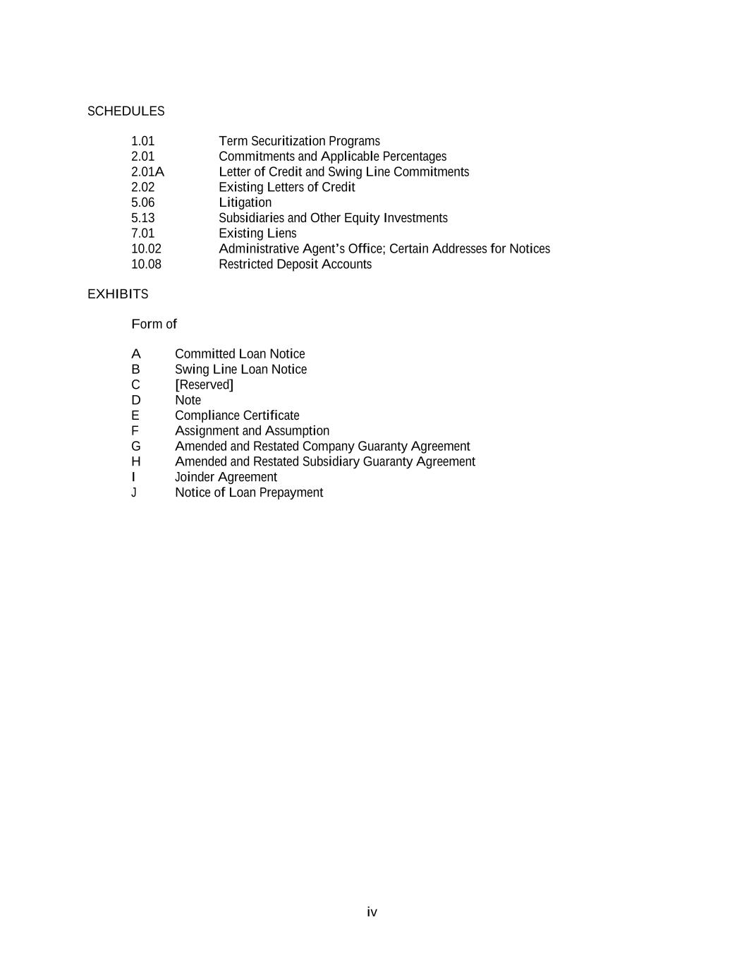 iv SCHEDULES 1.01 Term Securitization Programs 2.01 Commitments and Applicable Percentages 2.01A Letter of Credit and Swing Line Commitments 2.02 Existing Letters of Credit 5.06 Litigation 5.13 Subsidiaries and Other Equity Investments 7.01 Existing Liens 10.02 Administrative Agent’s Office; Certain Addresses for Notices 10.08 Restricted Deposit Accounts EXHIBITS Form of A Committed Loan Notice B Swing Line Loan Notice C [Reserved] D Note E Compliance Certificate F Assignment and Assumption G Amended and Restated Company Guaranty Agreement H Amended and Restated Subsidiary Guaranty Agreement I Joinder Agreement J Notice of Loan Prepayment