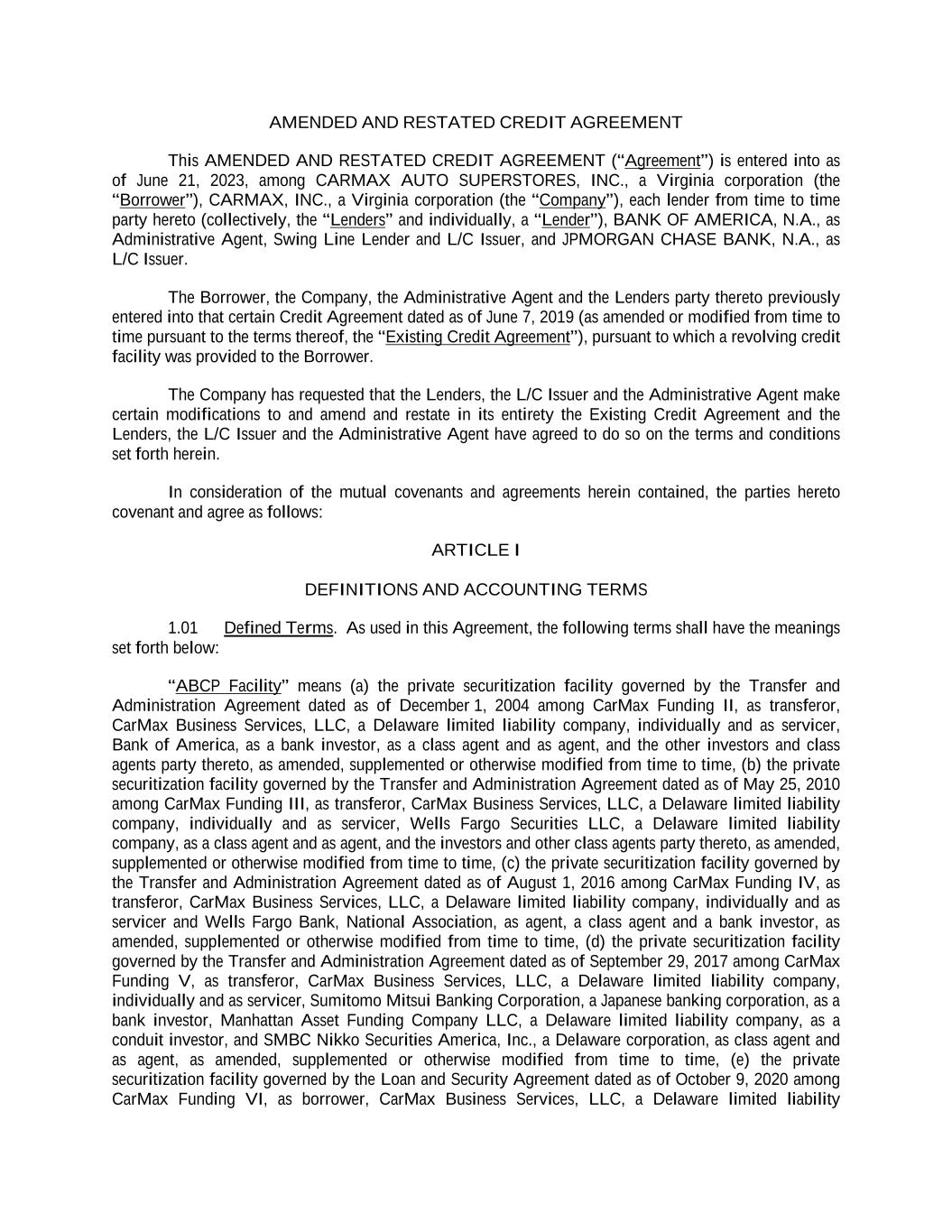 AMENDED AND RESTATED CREDIT AGREEMENT This AMENDED AND RESTATED CREDIT AGREEMENT (“Agreement”) is entered into as of June 21, 2023, among CARMAX AUTO SUPERSTORES, INC., a Virginia corporation (the “Borrower”), CARMAX, INC., a Virginia corporation (the “Company”), each lender from time to time party hereto (collectively, the “Lenders” and individually, a “Lender”), BANK OF AMERICA, N.A., as Administrative Agent, Swing Line Lender and L/C Issuer, and JPMORGAN CHASE BANK, N.A., as L/C Issuer. The Borrower, the Company, the Administrative Agent and the Lenders party thereto previously entered into that certain Credit Agreement dated as of June 7, 2019 (as amended or modified from time to time pursuant to the terms thereof, the “Existing Credit Agreement”), pursuant to which a revolving credit facility was provided to the Borrower. The Company has requested that the Lenders, the L/C Issuer and the Administrative Agent make certain modifications to and amend and restate in its entirety the Existing Credit Agreement and the Lenders, the L/C Issuer and the Administrative Agent have agreed to do so on the terms and conditions set forth herein. In consideration of the mutual covenants and agreements herein contained, the parties hereto covenant and agree as follows: ARTICLE I DEFINITIONS AND ACCOUNTING TERMS 1.01 Defined Terms. As used in this Agreement, the following terms shall have the meanings set forth below: “ABCP Facility” means (a) the private securitization facility governed by the Transfer and Administration Agreement dated as of December 1, 2004 among CarMax Funding II, as transferor, CarMax Business Services, LLC, a Delaware limited liability company, individually and as servicer, Bank of America, as a bank investor, as a class agent and as agent, and the other investors and class agents party thereto, as amended, supplemented or otherwise modified from time to time, (b) the private securitization facility governed by the Transfer and Administration Agreement dated as of May 25, 2010 among CarMax Funding III, as transferor, CarMax Business Services, LLC, a Delaware limited liability company, individually and as servicer, Wells Fargo Securities LLC, a Delaware limited liability company, as a class agent and as agent, and the investors and other class agents party thereto, as amended, supplemented or otherwise modified from time to time, (c) the private securitization facility governed by the Transfer and Administration Agreement dated as of August 1, 2016 among CarMax Funding IV, as transferor, CarMax Business Services, LLC, a Delaware limited liability company, individually and as servicer and Wells Fargo Bank, National Association, as agent, a class agent and a bank investor, as amended, supplemented or otherwise modified from time to time, (d) the private securitization facility governed by the Transfer and Administration Agreement dated as of September 29, 2017 among CarMax Funding V, as transferor, CarMax Business Services, LLC, a Delaware limited liability company, individually and as servicer, Sumitomo Mitsui Banking Corporation, a Japanese banking corporation, as a bank investor, Manhattan Asset Funding Company LLC, a Delaware limited liability company, as a conduit investor, and SMBC Nikko Securities America, Inc., a Delaware corporation, as class agent and as agent, as amended, supplemented or otherwise modified from time to time, (e) the private securitization facility governed by the Loan and Security Agreement dated as of October 9, 2020 among CarMax Funding VI, as borrower, CarMax Business Services, LLC, a Delaware limited liability