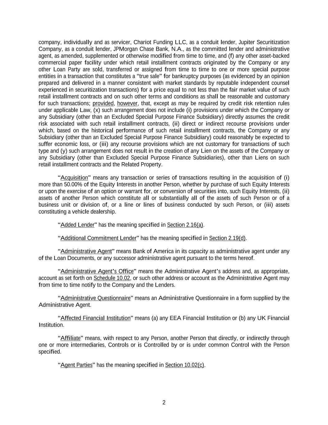 2 company, individually and as servicer, Chariot Funding LLC, as a conduit lender, Jupiter Securitization Company, as a conduit lender, JPMorgan Chase Bank, N.A., as the committed lender and administrative agent, as amended, supplemented or otherwise modified from time to time, and (f) any other asset-backed commercial paper facility under which retail installment contracts originated by the Company or any other Loan Party are sold, transferred or assigned from time to time to one or more special purpose entities in a transaction that constitutes a “true sale” for bankruptcy purposes (as evidenced by an opinion prepared and delivered in a manner consistent with market standards by reputable independent counsel experienced in securitization transactions) for a price equal to not less than the fair market value of such retail installment contracts and on such other terms and conditions as shall be reasonable and customary for such transactions; provided, however, that, except as may be required by credit risk retention rules under applicable Law, (x) such arrangement does not include (i) provisions under which the Company or any Subsidiary (other than an Excluded Special Purpose Finance Subsidiary) directly assumes the credit risk associated with such retail installment contracts, (ii) direct or indirect recourse provisions under which, based on the historical performance of such retail installment contracts, the Company or any Subsidiary (other than an Excluded Special Purpose Finance Subsidiary) could reasonably be expected to suffer economic loss, or (iii) any recourse provisions which are not customary for transactions of such type and (y) such arrangement does not result in the creation of any Lien on the assets of the Company or any Subsidiary (other than Excluded Special Purpose Finance Subsidiaries), other than Liens on such retail installment contracts and the Related Property. “Acquisition” means any transaction or series of transactions resulting in the acquisition of (i) more than 50.00% of the Equity Interests in another Person, whether by purchase of such Equity Interests or upon the exercise of an option or warrant for, or conversion of securities into, such Equity Interests, (ii) assets of another Person which constitute all or substantially all of the assets of such Person or of a business unit or division of, or a line or lines of business conducted by such Person, or (iii) assets constituting a vehicle dealership. “Added Lender” has the meaning specified in Section 2.16(a). “Additional Commitment Lender” has the meaning specified in Section 2.19(d). “Administrative Agent” means Bank of America in its capacity as administrative agent under any of the Loan Documents, or any successor administrative agent pursuant to the terms hereof. “Administrative Agent’s Office” means the Administrative Agent’s address and, as appropriate, account as set forth on Schedule 10.02, or such other address or account as the Administrative Agent may from time to time notify to the Company and the Lenders. “Administrative Questionnaire” means an Administrative Questionnaire in a form supplied by the Administrative Agent. “Affected Financial Institution” means (a) any EEA Financial Institution or (b) any UK Financial Institution. “Affiliate” means, with respect to any Person, another Person that directly, or indirectly through one or more intermediaries, Controls or is Controlled by or is under common Control with the Person specified. “Agent Parties” has the meaning specified in Section 10.02(c).