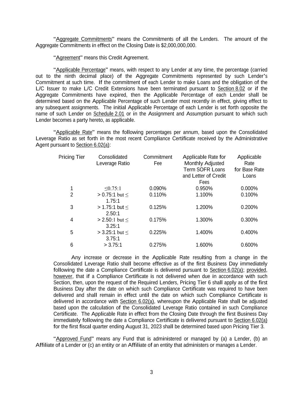 3 “Aggregate Commitments” means the Commitments of all the Lenders. The amount of the Aggregate Commitments in effect on the Closing Date is $2,000,000,000. “Agreement” means this Credit Agreement. “Applicable Percentage” means, with respect to any Lender at any time, the percentage (carried out to the ninth decimal place) of the Aggregate Commitments represented by such Lender’s Commitment at such time. If the commitment of each Lender to make Loans and the obligation of the L/C Issuer to make L/C Credit Extensions have been terminated pursuant to Section 8.02 or if the Aggregate Commitments have expired, then the Applicable Percentage of each Lender shall be determined based on the Applicable Percentage of such Lender most recently in effect, giving effect to any subsequent assignments. The initial Applicable Percentage of each Lender is set forth opposite the name of such Lender on Schedule 2.01 or in the Assignment and Assumption pursuant to which such Lender becomes a party hereto, as applicable. “Applicable Rate” means the following percentages per annum, based upon the Consolidated Leverage Ratio as set forth in the most recent Compliance Certificate received by the Administrative Agent pursuant to Section 6.02(a): Pricing Tier Consolidated Leverage Ratio Commitment Fee Applicable Rate for Monthly Adjusted Term SOFR Loans and Letter of Credit Fees Applicable Rate for Base Rate Loans 1 ≤0.75:1 0.090% 0.950% 0.000% 2 > 0.75:1 but ≤ 1.75:1 0.110% 1.100% 0.100% 3 > 1.75:1 but ≤ 2.50:1 0.125% 1.200% 0.200% 4 > 2.50:1 but ≤ 3.25:1 0.175% 1.300% 0.300% 5 > 3.25:1 but ≤ 3.75:1 0.225% 1.400% 0.400% 6 > 3.75:1 0.275% 1.600% 0.600% Any increase or decrease in the Applicable Rate resulting from a change in the Consolidated Leverage Ratio shall become effective as of the first Business Day immediately following the date a Compliance Certificate is delivered pursuant to Section 6.02(a); provided, however, that if a Compliance Certificate is not delivered when due in accordance with such Section, then, upon the request of the Required Lenders, Pricing Tier 6 shall apply as of the first Business Day after the date on which such Compliance Certificate was required to have been delivered and shall remain in effect until the date on which such Compliance Certificate is delivered in accordance with Section 6.02(a), whereupon the Applicable Rate shall be adjusted based upon the calculation of the Consolidated Leverage Ratio contained in such Compliance Certificate. The Applicable Rate in effect from the Closing Date through the first Business Day immediately following the date a Compliance Certificate is delivered pursuant to Section 6.02(a) for the first fiscal quarter ending August 31, 2023 shall be determined based upon Pricing Tier 3. “Approved Fund” means any Fund that is administered or managed by (a) a Lender, (b) an Affiliate of a Lender or (c) an entity or an Affiliate of an entity that administers or manages a Lender.