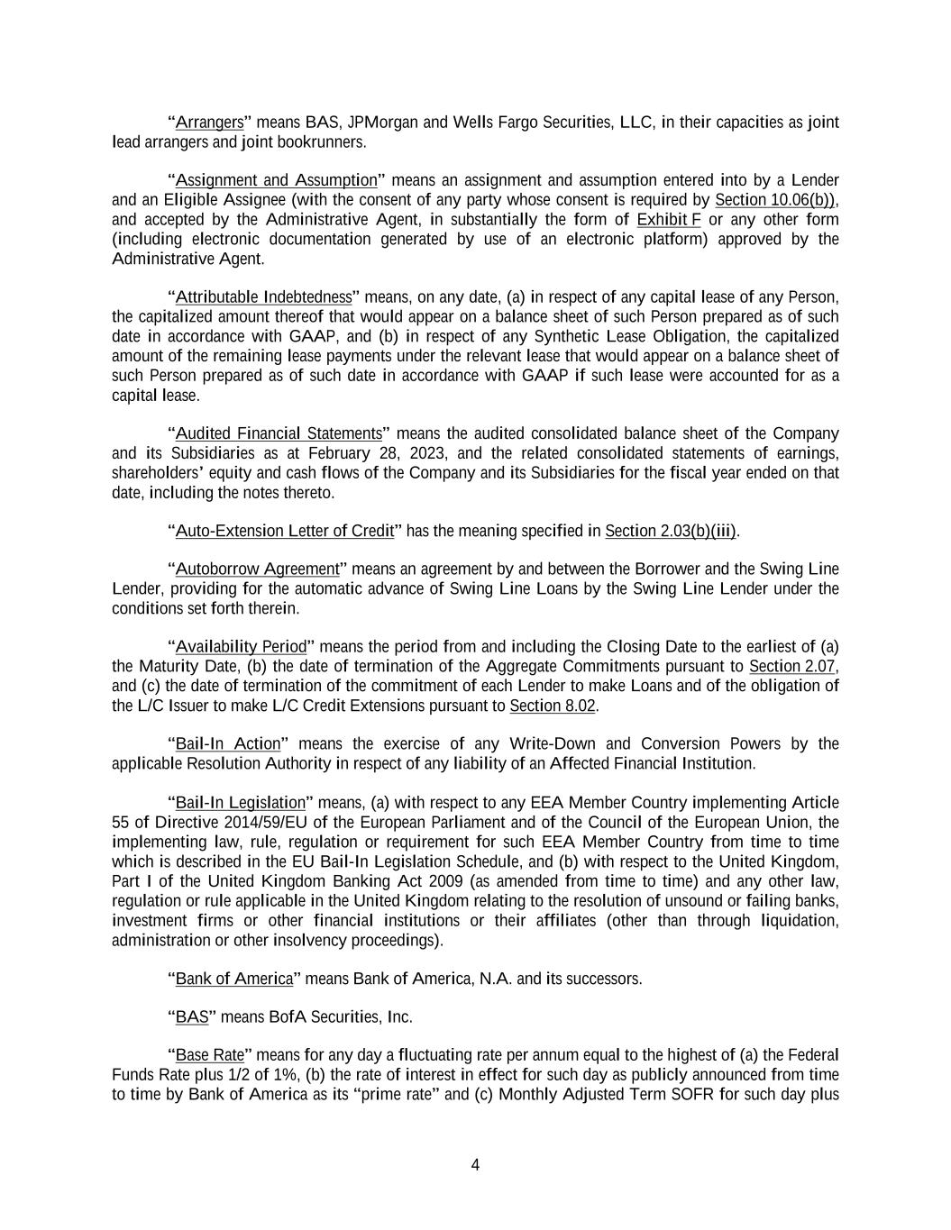 4 “Arrangers” means BAS, JPMorgan and Wells Fargo Securities, LLC, in their capacities as joint lead arrangers and joint bookrunners. “Assignment and Assumption” means an assignment and assumption entered into by a Lender and an Eligible Assignee (with the consent of any party whose consent is required by Section 10.06(b)), and accepted by the Administrative Agent, in substantially the form of Exhibit F or any other form (including electronic documentation generated by use of an electronic platform) approved by the Administrative Agent. “Attributable Indebtedness” means, on any date, (a) in respect of any capital lease of any Person, the capitalized amount thereof that would appear on a balance sheet of such Person prepared as of such date in accordance with GAAP, and (b) in respect of any Synthetic Lease Obligation, the capitalized amount of the remaining lease payments under the relevant lease that would appear on a balance sheet of such Person prepared as of such date in accordance with GAAP if such lease were accounted for as a capital lease. “Audited Financial Statements” means the audited consolidated balance sheet of the Company and its Subsidiaries as at February 28, 2023, and the related consolidated statements of earnings, shareholders’ equity and cash flows of the Company and its Subsidiaries for the fiscal year ended on that date, including the notes thereto. “Auto-Extension Letter of Credit” has the meaning specified in Section 2.03(b)(iii). “Autoborrow Agreement” means an agreement by and between the Borrower and the Swing Line Lender, providing for the automatic advance of Swing Line Loans by the Swing Line Lender under the conditions set forth therein. “Availability Period” means the period from and including the Closing Date to the earliest of (a) the Maturity Date, (b) the date of termination of the Aggregate Commitments pursuant to Section 2.07, and (c) the date of termination of the commitment of each Lender to make Loans and of the obligation of the L/C Issuer to make L/C Credit Extensions pursuant to Section 8.02. “Bail-In Action” means the exercise of any Write-Down and Conversion Powers by the applicable Resolution Authority in respect of any liability of an Affected Financial Institution. “Bail-In Legislation” means, (a) with respect to any EEA Member Country implementing Article 55 of Directive 2014/59/EU of the European Parliament and of the Council of the European Union, the implementing law, rule, regulation or requirement for such EEA Member Country from time to time which is described in the EU Bail-In Legislation Schedule, and (b) with respect to the United Kingdom, Part I of the United Kingdom Banking Act 2009 (as amended from time to time) and any other law, regulation or rule applicable in the United Kingdom relating to the resolution of unsound or failing banks, investment firms or other financial institutions or their affiliates (other than through liquidation, administration or other insolvency proceedings). “Bank of America” means Bank of America, N.A. and its successors. “BAS” means BofA Securities, Inc. “Base Rate” means for any day a fluctuating rate per annum equal to the highest of (a) the Federal Funds Rate plus 1/2 of 1%, (b) the rate of interest in effect for such day as publicly announced from time to time by Bank of America as its “prime rate” and (c) Monthly Adjusted Term SOFR for such day plus