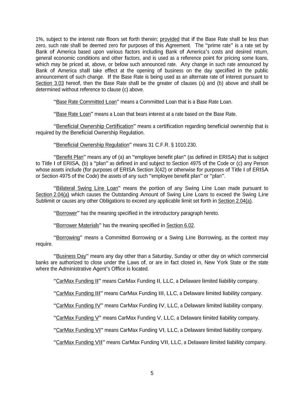 5 1%, subject to the interest rate floors set forth therein; provided that if the Base Rate shall be less than zero, such rate shall be deemed zero for purposes of this Agreement. The “prime rate” is a rate set by Bank of America based upon various factors including Bank of America’s costs and desired return, general economic conditions and other factors, and is used as a reference point for pricing some loans, which may be priced at, above, or below such announced rate. Any change in such rate announced by Bank of America shall take effect at the opening of business on the day specified in the public announcement of such change. If the Base Rate is being used as an alternate rate of interest pursuant to Section 3.03 hereof, then the Base Rate shall be the greater of clauses (a) and (b) above and shall be determined without reference to clause (c) above. “Base Rate Committed Loan” means a Committed Loan that is a Base Rate Loan. “Base Rate Loan” means a Loan that bears interest at a rate based on the Base Rate. “Beneficial Ownership Certification” means a certification regarding beneficial ownership that is required by the Beneficial Ownership Regulation. “Beneficial Ownership Regulation” means 31 C.F.R. § 1010.230. “Benefit Plan” means any of (a) an “employee benefit plan” (as defined in ERISA) that is subject to Title I of ERISA, (b) a “plan” as defined in and subject to Section 4975 of the Code or (c) any Person whose assets include (for purposes of ERISA Section 3(42) or otherwise for purposes of Title I of ERISA or Section 4975 of the Code) the assets of any such “employee benefit plan” or “plan”. “Bilateral Swing Line Loan” means the portion of any Swing Line Loan made pursuant to Section 2.04(a) which causes the Outstanding Amount of Swing Line Loans to exceed the Swing Line Sublimit or causes any other Obligations to exceed any applicable limit set forth in Section 2.04(a). “Borrower” has the meaning specified in the introductory paragraph hereto. “Borrower Materials” has the meaning specified in Section 6.02. “Borrowing” means a Committed Borrowing or a Swing Line Borrowing, as the context may require. “Business Day” means any day other than a Saturday, Sunday or other day on which commercial banks are authorized to close under the Laws of, or are in fact closed in, New York State or the state where the Administrative Agent’s Office is located. “CarMax Funding II” means CarMax Funding II, LLC, a Delaware limited liability company. “CarMax Funding III” means CarMax Funding III, LLC, a Delaware limited liability company. “CarMax Funding IV” means CarMax Funding IV, LLC, a Delaware limited liability company. “CarMax Funding V” means CarMax Funding V, LLC, a Delaware limited liability company. “CarMax Funding VI” means CarMax Funding VI, LLC, a Delaware limited liability company. “CarMax Funding VII” means CarMax Funding VII, LLC, a Delaware limited liability company.