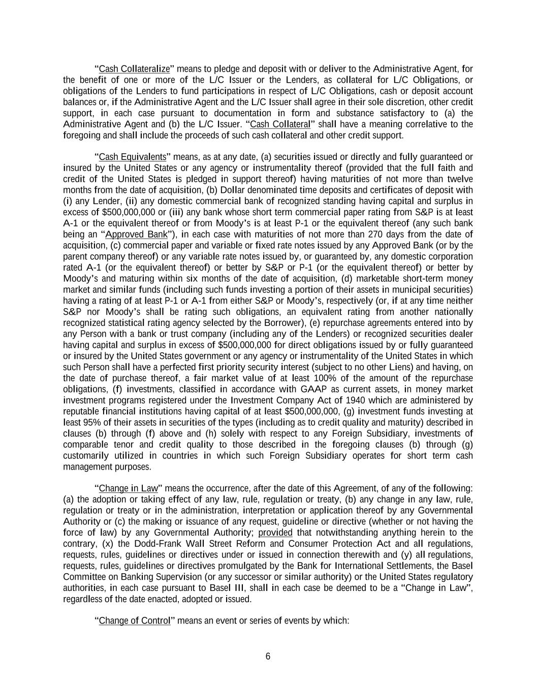6 “Cash Collateralize” means to pledge and deposit with or deliver to the Administrative Agent, for the benefit of one or more of the L/C Issuer or the Lenders, as collateral for L/C Obligations, or obligations of the Lenders to fund participations in respect of L/C Obligations, cash or deposit account balances or, if the Administrative Agent and the L/C Issuer shall agree in their sole discretion, other credit support, in each case pursuant to documentation in form and substance satisfactory to (a) the Administrative Agent and (b) the L/C Issuer. “Cash Collateral” shall have a meaning correlative to the foregoing and shall include the proceeds of such cash collateral and other credit support. “Cash Equivalents” means, as at any date, (a) securities issued or directly and fully guaranteed or insured by the United States or any agency or instrumentality thereof (provided that the full faith and credit of the United States is pledged in support thereof) having maturities of not more than twelve months from the date of acquisition, (b) Dollar denominated time deposits and certificates of deposit with (i) any Lender, (ii) any domestic commercial bank of recognized standing having capital and surplus in excess of $500,000,000 or (iii) any bank whose short term commercial paper rating from S&P is at least A-1 or the equivalent thereof or from Moody’s is at least P-1 or the equivalent thereof (any such bank being an “Approved Bank”), in each case with maturities of not more than 270 days from the date of acquisition, (c) commercial paper and variable or fixed rate notes issued by any Approved Bank (or by the parent company thereof) or any variable rate notes issued by, or guaranteed by, any domestic corporation rated A-1 (or the equivalent thereof) or better by S&P or P-1 (or the equivalent thereof) or better by Moody’s and maturing within six months of the date of acquisition, (d) marketable short-term money market and similar funds (including such funds investing a portion of their assets in municipal securities) having a rating of at least P-1 or A-1 from either S&P or Moody’s, respectively (or, if at any time neither S&P nor Moody’s shall be rating such obligations, an equivalent rating from another nationally recognized statistical rating agency selected by the Borrower), (e) repurchase agreements entered into by any Person with a bank or trust company (including any of the Lenders) or recognized securities dealer having capital and surplus in excess of $500,000,000 for direct obligations issued by or fully guaranteed or insured by the United States government or any agency or instrumentality of the United States in which such Person shall have a perfected first priority security interest (subject to no other Liens) and having, on the date of purchase thereof, a fair market value of at least 100% of the amount of the repurchase obligations, (f) investments, classified in accordance with GAAP as current assets, in money market investment programs registered under the Investment Company Act of 1940 which are administered by reputable financial institutions having capital of at least $500,000,000, (g) investment funds investing at least 95% of their assets in securities of the types (including as to credit quality and maturity) described in clauses (b) through (f) above and (h) solely with respect to any Foreign Subsidiary, investments of comparable tenor and credit quality to those described in the foregoing clauses (b) through (g) customarily utilized in countries in which such Foreign Subsidiary operates for short term cash management purposes. “Change in Law” means the occurrence, after the date of this Agreement, of any of the following: (a) the adoption or taking effect of any law, rule, regulation or treaty, (b) any change in any law, rule, regulation or treaty or in the administration, interpretation or application thereof by any Governmental Authority or (c) the making or issuance of any request, guideline or directive (whether or not having the force of law) by any Governmental Authority; provided that notwithstanding anything herein to the contrary, (x) the Dodd-Frank Wall Street Reform and Consumer Protection Act and all regulations, requests, rules, guidelines or directives under or issued in connection therewith and (y) all regulations, requests, rules, guidelines or directives promulgated by the Bank for International Settlements, the Basel Committee on Banking Supervision (or any successor or similar authority) or the United States regulatory authorities, in each case pursuant to Basel III, shall in each case be deemed to be a “Change in Law”, regardless of the date enacted, adopted or issued. “Change of Control” means an event or series of events by which: