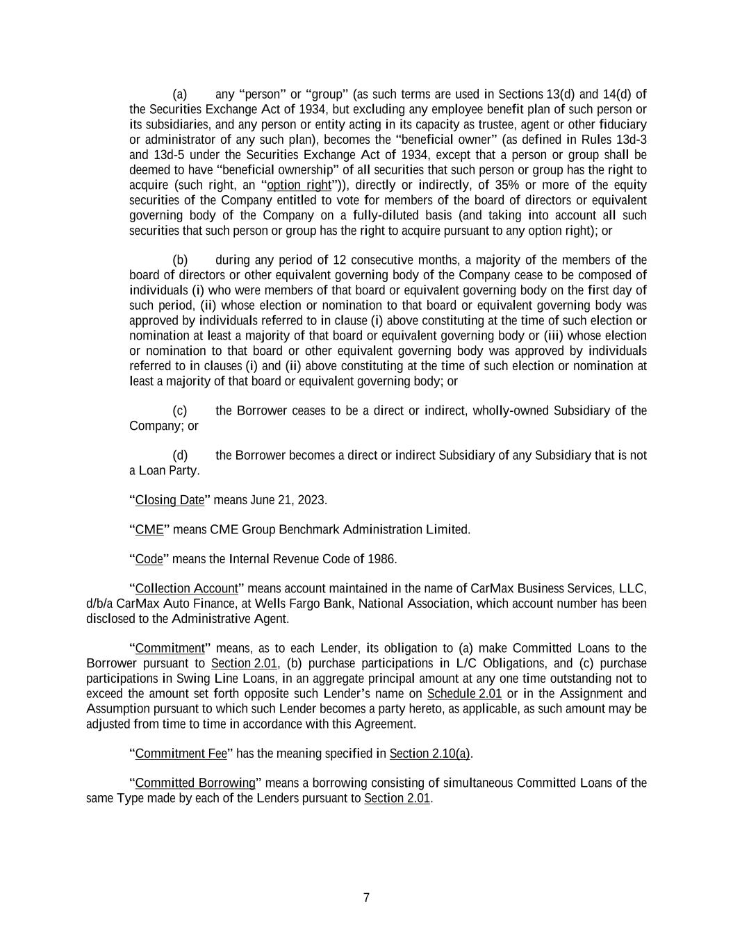7 (a) any “person” or “group” (as such terms are used in Sections 13(d) and 14(d) of the Securities Exchange Act of 1934, but excluding any employee benefit plan of such person or its subsidiaries, and any person or entity acting in its capacity as trustee, agent or other fiduciary or administrator of any such plan), becomes the “beneficial owner” (as defined in Rules 13d-3 and 13d-5 under the Securities Exchange Act of 1934, except that a person or group shall be deemed to have “beneficial ownership” of all securities that such person or group has the right to acquire (such right, an “option right”)), directly or indirectly, of 35% or more of the equity securities of the Company entitled to vote for members of the board of directors or equivalent governing body of the Company on a fully-diluted basis (and taking into account all such securities that such person or group has the right to acquire pursuant to any option right); or (b) during any period of 12 consecutive months, a majority of the members of the board of directors or other equivalent governing body of the Company cease to be composed of individuals (i) who were members of that board or equivalent governing body on the first day of such period, (ii) whose election or nomination to that board or equivalent governing body was approved by individuals referred to in clause (i) above constituting at the time of such election or nomination at least a majority of that board or equivalent governing body or (iii) whose election or nomination to that board or other equivalent governing body was approved by individuals referred to in clauses (i) and (ii) above constituting at the time of such election or nomination at least a majority of that board or equivalent governing body; or (c) the Borrower ceases to be a direct or indirect, wholly-owned Subsidiary of the Company; or (d) the Borrower becomes a direct or indirect Subsidiary of any Subsidiary that is not a Loan Party. “Closing Date” means June 21, 2023. “CME” means CME Group Benchmark Administration Limited. “Code” means the Internal Revenue Code of 1986. “Collection Account” means account maintained in the name of CarMax Business Services, LLC, d/b/a CarMax Auto Finance, at Wells Fargo Bank, National Association, which account number has been disclosed to the Administrative Agent. “Commitment” means, as to each Lender, its obligation to (a) make Committed Loans to the Borrower pursuant to Section 2.01, (b) purchase participations in L/C Obligations, and (c) purchase participations in Swing Line Loans, in an aggregate principal amount at any one time outstanding not to exceed the amount set forth opposite such Lender’s name on Schedule 2.01 or in the Assignment and Assumption pursuant to which such Lender becomes a party hereto, as applicable, as such amount may be adjusted from time to time in accordance with this Agreement. “Commitment Fee” has the meaning specified in Section 2.10(a). “Committed Borrowing” means a borrowing consisting of simultaneous Committed Loans of the same Type made by each of the Lenders pursuant to Section 2.01.