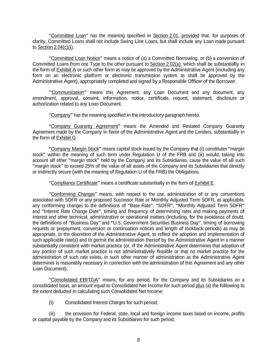 8 “Committed Loan” has the meaning specified in Section 2.01, provided that, for purposes of clarity, Committed Loans shall not include Swing Line Loans, but shall include any Loan made pursuant to Section 2.04(c)(i). “Committed Loan Notice” means a notice of (a) a Committed Borrowing, or (b) a conversion of Committed Loans from one Type to the other pursuant to Section 2.02(a), which shall be substantially in the form of Exhibit A or such other form as may be approved by the Administrative Agent (including any form on an electronic platform or electronic transmission system as shall be approved by the Administrative Agent), appropriately completed and signed by a Responsible Officer of the Borrower. “Communication” means this Agreement, any Loan Document and any document, any amendment, approval, consent, information, notice, certificate, request, statement, disclosure or authorization related to any Loan Document. “Company” has the meaning specified in the introductory paragraph hereto. “Company Guaranty Agreement” means the Amended and Restated Company Guaranty Agreement made by the Company in favor of the Administrative Agent and the Lenders, substantially in the form of Exhibit G. “Company Margin Stock” means capital stock issued by the Company that (i) constitutes “margin stock” within the meaning of such term under Regulation U of the FRB and (ii) would, taking into account all other “margin stock” held by the Company and its Subsidiaries, cause the value of all such “margin stock” to exceed 25% of the value of all assets of the Company and its Subsidiaries that directly or indirectly secure (with the meaning of Regulation U of the FRB) the Obligations. “Compliance Certificate” means a certificate substantially in the form of Exhibit E. “Conforming Changes” means, with respect to the use, administration of or any conventions associated with SOFR or any proposed Successor Rate or Monthly Adjusted Term SOFR, as applicable, any conforming changes to the definitions of “Base Rate”, “SOFR”, “Monthly Adjusted Term SOFR” and “Interest Rate Change Date”, timing and frequency of determining rates and making payments of interest and other technical, administrative or operational matters (including, for the avoidance of doubt, the definitions of “Business Day” and “U.S. Government Securities Business Day”, timing of borrowing requests or prepayment, conversion or continuation notices and length of lookback periods) as may be appropriate, in the discretion of the Administrative Agent, to reflect the adoption and implementation of such applicable rate(s) and to permit the administration thereof by the Administrative Agent in a manner substantially consistent with market practice (or, if the Administrative Agent determines that adoption of any portion of such market practice is not administratively feasible or that no market practice for the administration of such rate exists, in such other manner of administration as the Administrative Agent determines is reasonably necessary in connection with the administration of this Agreement and any other Loan Document). “Consolidated EBITDA” means, for any period, for the Company and its Subsidiaries on a consolidated basis, an amount equal to Consolidated Net Income for such period plus (a) the following to the extent deducted in calculating such Consolidated Net Income: (i) Consolidated Interest Charges for such period; (ii) the provision for Federal, state, local and foreign income taxes based on income, profits or capital payable by the Company and its Subsidiaries for such period;