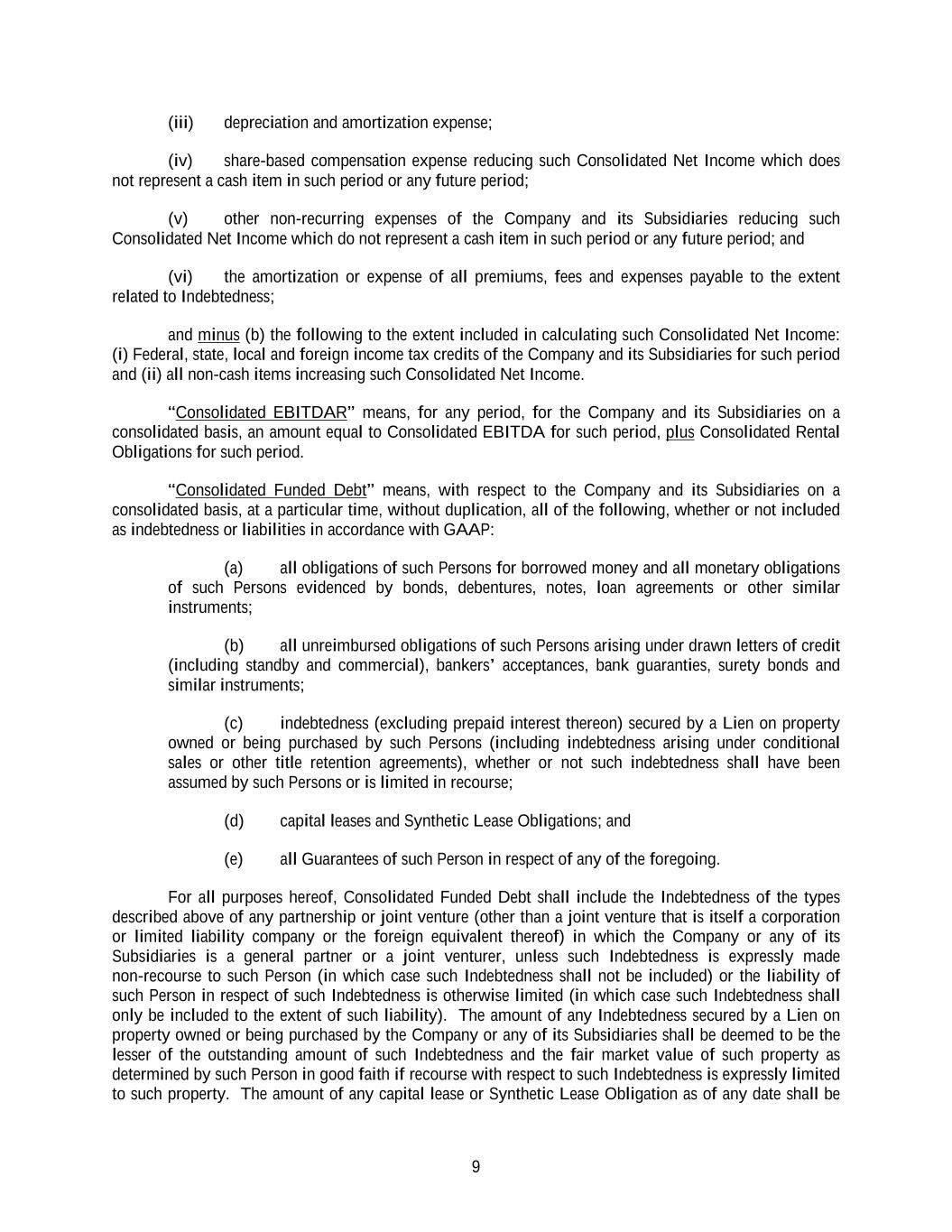 9 (iii) depreciation and amortization expense; (iv) share-based compensation expense reducing such Consolidated Net Income which does not represent a cash item in such period or any future period; (v) other non-recurring expenses of the Company and its Subsidiaries reducing such Consolidated Net Income which do not represent a cash item in such period or any future period; and (vi) the amortization or expense of all premiums, fees and expenses payable to the extent related to Indebtedness; and minus (b) the following to the extent included in calculating such Consolidated Net Income: (i) Federal, state, local and foreign income tax credits of the Company and its Subsidiaries for such period and (ii) all non-cash items increasing such Consolidated Net Income. “Consolidated EBITDAR” means, for any period, for the Company and its Subsidiaries on a consolidated basis, an amount equal to Consolidated EBITDA for such period, plus Consolidated Rental Obligations for such period. “Consolidated Funded Debt” means, with respect to the Company and its Subsidiaries on a consolidated basis, at a particular time, without duplication, all of the following, whether or not included as indebtedness or liabilities in accordance with GAAP: (a) all obligations of such Persons for borrowed money and all monetary obligations of such Persons evidenced by bonds, debentures, notes, loan agreements or other similar instruments; (b) all unreimbursed obligations of such Persons arising under drawn letters of credit (including standby and commercial), bankers’ acceptances, bank guaranties, surety bonds and similar instruments; (c) indebtedness (excluding prepaid interest thereon) secured by a Lien on property owned or being purchased by such Persons (including indebtedness arising under conditional sales or other title retention agreements), whether or not such indebtedness shall have been assumed by such Persons or is limited in recourse; (d) capital leases and Synthetic Lease Obligations; and (e) all Guarantees of such Person in respect of any of the foregoing. For all purposes hereof, Consolidated Funded Debt shall include the Indebtedness of the types described above of any partnership or joint venture (other than a joint venture that is itself a corporation or limited liability company or the foreign equivalent thereof) in which the Company or any of its Subsidiaries is a general partner or a joint venturer, unless such Indebtedness is expressly made non-recourse to such Person (in which case such Indebtedness shall not be included) or the liability of such Person in respect of such Indebtedness is otherwise limited (in which case such Indebtedness shall only be included to the extent of such liability). The amount of any Indebtedness secured by a Lien on property owned or being purchased by the Company or any of its Subsidiaries shall be deemed to be the lesser of the outstanding amount of such Indebtedness and the fair market value of such property as determined by such Person in good faith if recourse with respect to such Indebtedness is expressly limited to such property. The amount of any capital lease or Synthetic Lease Obligation as of any date shall be