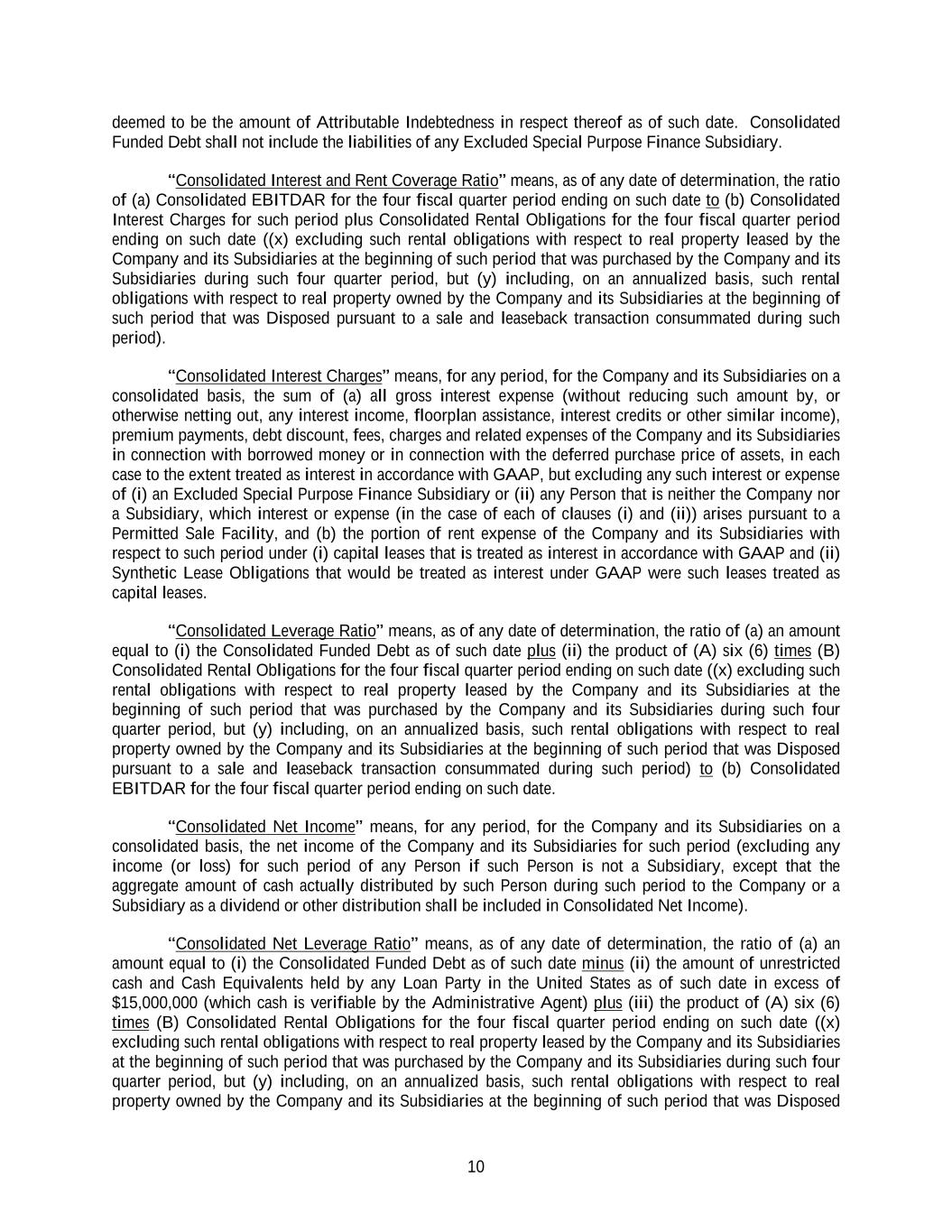 10 deemed to be the amount of Attributable Indebtedness in respect thereof as of such date. Consolidated Funded Debt shall not include the liabilities of any Excluded Special Purpose Finance Subsidiary. “Consolidated Interest and Rent Coverage Ratio” means, as of any date of determination, the ratio of (a) Consolidated EBITDAR for the four fiscal quarter period ending on such date to (b) Consolidated Interest Charges for such period plus Consolidated Rental Obligations for the four fiscal quarter period ending on such date ((x) excluding such rental obligations with respect to real property leased by the Company and its Subsidiaries at the beginning of such period that was purchased by the Company and its Subsidiaries during such four quarter period, but (y) including, on an annualized basis, such rental obligations with respect to real property owned by the Company and its Subsidiaries at the beginning of such period that was Disposed pursuant to a sale and leaseback transaction consummated during such period). “Consolidated Interest Charges” means, for any period, for the Company and its Subsidiaries on a consolidated basis, the sum of (a) all gross interest expense (without reducing such amount by, or otherwise netting out, any interest income, floorplan assistance, interest credits or other similar income), premium payments, debt discount, fees, charges and related expenses of the Company and its Subsidiaries in connection with borrowed money or in connection with the deferred purchase price of assets, in each case to the extent treated as interest in accordance with GAAP, but excluding any such interest or expense of (i) an Excluded Special Purpose Finance Subsidiary or (ii) any Person that is neither the Company nor a Subsidiary, which interest or expense (in the case of each of clauses (i) and (ii)) arises pursuant to a Permitted Sale Facility, and (b) the portion of rent expense of the Company and its Subsidiaries with respect to such period under (i) capital leases that is treated as interest in accordance with GAAP and (ii) Synthetic Lease Obligations that would be treated as interest under GAAP were such leases treated as capital leases. “Consolidated Leverage Ratio” means, as of any date of determination, the ratio of (a) an amount equal to (i) the Consolidated Funded Debt as of such date plus (ii) the product of (A) six (6) times (B) Consolidated Rental Obligations for the four fiscal quarter period ending on such date ((x) excluding such rental obligations with respect to real property leased by the Company and its Subsidiaries at the beginning of such period that was purchased by the Company and its Subsidiaries during such four quarter period, but (y) including, on an annualized basis, such rental obligations with respect to real property owned by the Company and its Subsidiaries at the beginning of such period that was Disposed pursuant to a sale and leaseback transaction consummated during such period) to (b) Consolidated EBITDAR for the four fiscal quarter period ending on such date. “Consolidated Net Income” means, for any period, for the Company and its Subsidiaries on a consolidated basis, the net income of the Company and its Subsidiaries for such period (excluding any income (or loss) for such period of any Person if such Person is not a Subsidiary, except that the aggregate amount of cash actually distributed by such Person during such period to the Company or a Subsidiary as a dividend or other distribution shall be included in Consolidated Net Income). “Consolidated Net Leverage Ratio” means, as of any date of determination, the ratio of (a) an amount equal to (i) the Consolidated Funded Debt as of such date minus (ii) the amount of unrestricted cash and Cash Equivalents held by any Loan Party in the United States as of such date in excess of $15,000,000 (which cash is verifiable by the Administrative Agent) plus (iii) the product of (A) six (6) times (B) Consolidated Rental Obligations for the four fiscal quarter period ending on such date ((x) excluding such rental obligations with respect to real property leased by the Company and its Subsidiaries at the beginning of such period that was purchased by the Company and its Subsidiaries during such four quarter period, but (y) including, on an annualized basis, such rental obligations with respect to real property owned by the Company and its Subsidiaries at the beginning of such period that was Disposed