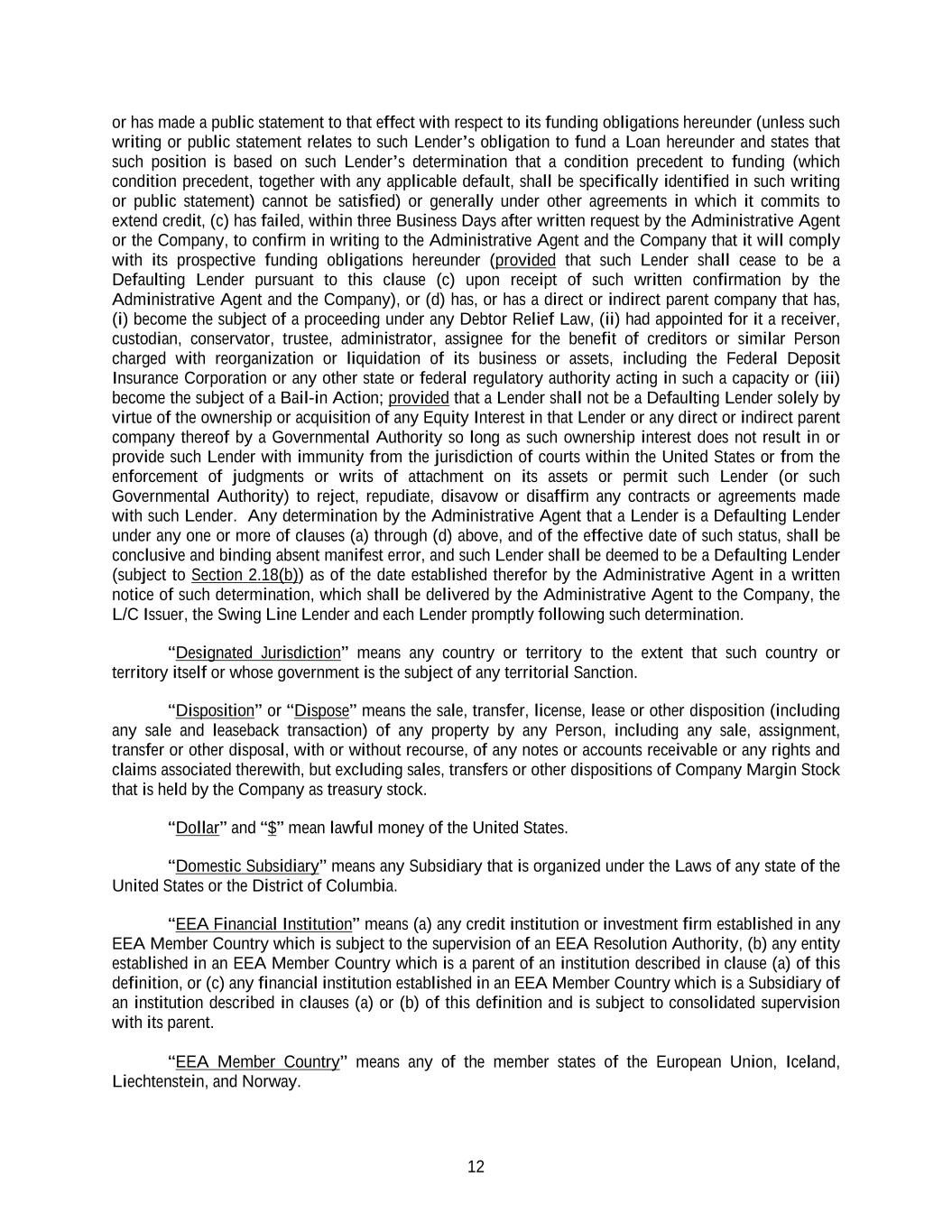 12 or has made a public statement to that effect with respect to its funding obligations hereunder (unless such writing or public statement relates to such Lender’s obligation to fund a Loan hereunder and states that such position is based on such Lender’s determination that a condition precedent to funding (which condition precedent, together with any applicable default, shall be specifically identified in such writing or public statement) cannot be satisfied) or generally under other agreements in which it commits to extend credit, (c) has failed, within three Business Days after written request by the Administrative Agent or the Company, to confirm in writing to the Administrative Agent and the Company that it will comply with its prospective funding obligations hereunder (provided that such Lender shall cease to be a Defaulting Lender pursuant to this clause (c) upon receipt of such written confirmation by the Administrative Agent and the Company), or (d) has, or has a direct or indirect parent company that has, (i) become the subject of a proceeding under any Debtor Relief Law, (ii) had appointed for it a receiver, custodian, conservator, trustee, administrator, assignee for the benefit of creditors or similar Person charged with reorganization or liquidation of its business or assets, including the Federal Deposit Insurance Corporation or any other state or federal regulatory authority acting in such a capacity or (iii) become the subject of a Bail-in Action; provided that a Lender shall not be a Defaulting Lender solely by virtue of the ownership or acquisition of any Equity Interest in that Lender or any direct or indirect parent company thereof by a Governmental Authority so long as such ownership interest does not result in or provide such Lender with immunity from the jurisdiction of courts within the United States or from the enforcement of judgments or writs of attachment on its assets or permit such Lender (or such Governmental Authority) to reject, repudiate, disavow or disaffirm any contracts or agreements made with such Lender. Any determination by the Administrative Agent that a Lender is a Defaulting Lender under any one or more of clauses (a) through (d) above, and of the effective date of such status, shall be conclusive and binding absent manifest error, and such Lender shall be deemed to be a Defaulting Lender (subject to Section 2.18(b)) as of the date established therefor by the Administrative Agent in a written notice of such determination, which shall be delivered by the Administrative Agent to the Company, the L/C Issuer, the Swing Line Lender and each Lender promptly following such determination. “Designated Jurisdiction” means any country or territory to the extent that such country or territory itself or whose government is the subject of any territorial Sanction. “Disposition” or “Dispose” means the sale, transfer, license, lease or other disposition (including any sale and leaseback transaction) of any property by any Person, including any sale, assignment, transfer or other disposal, with or without recourse, of any notes or accounts receivable or any rights and claims associated therewith, but excluding sales, transfers or other dispositions of Company Margin Stock that is held by the Company as treasury stock. “Dollar” and “$” mean lawful money of the United States. “Domestic Subsidiary” means any Subsidiary that is organized under the Laws of any state of the United States or the District of Columbia. “EEA Financial Institution” means (a) any credit institution or investment firm established in any EEA Member Country which is subject to the supervision of an EEA Resolution Authority, (b) any entity established in an EEA Member Country which is a parent of an institution described in clause (a) of this definition, or (c) any financial institution established in an EEA Member Country which is a Subsidiary of an institution described in clauses (a) or (b) of this definition and is subject to consolidated supervision with its parent. “EEA Member Country” means any of the member states of the European Union, Iceland, Liechtenstein, and Norway.