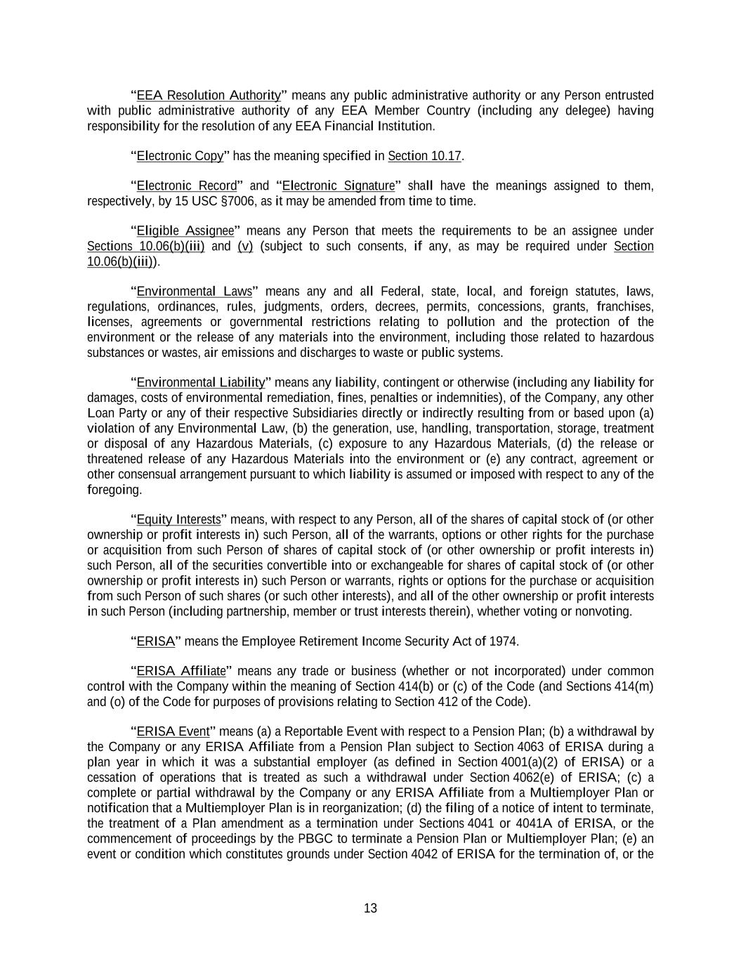 13 “EEA Resolution Authority” means any public administrative authority or any Person entrusted with public administrative authority of any EEA Member Country (including any delegee) having responsibility for the resolution of any EEA Financial Institution. “Electronic Copy” has the meaning specified in Section 10.17. “Electronic Record” and “Electronic Signature” shall have the meanings assigned to them, respectively, by 15 USC §7006, as it may be amended from time to time. “Eligible Assignee” means any Person that meets the requirements to be an assignee under Sections 10.06(b)(iii) and (v) (subject to such consents, if any, as may be required under Section 10.06(b)(iii)). “Environmental Laws” means any and all Federal, state, local, and foreign statutes, laws, regulations, ordinances, rules, judgments, orders, decrees, permits, concessions, grants, franchises, licenses, agreements or governmental restrictions relating to pollution and the protection of the environment or the release of any materials into the environment, including those related to hazardous substances or wastes, air emissions and discharges to waste or public systems. “Environmental Liability” means any liability, contingent or otherwise (including any liability for damages, costs of environmental remediation, fines, penalties or indemnities), of the Company, any other Loan Party or any of their respective Subsidiaries directly or indirectly resulting from or based upon (a) violation of any Environmental Law, (b) the generation, use, handling, transportation, storage, treatment or disposal of any Hazardous Materials, (c) exposure to any Hazardous Materials, (d) the release or threatened release of any Hazardous Materials into the environment or (e) any contract, agreement or other consensual arrangement pursuant to which liability is assumed or imposed with respect to any of the foregoing. “Equity Interests” means, with respect to any Person, all of the shares of capital stock of (or other ownership or profit interests in) such Person, all of the warrants, options or other rights for the purchase or acquisition from such Person of shares of capital stock of (or other ownership or profit interests in) such Person, all of the securities convertible into or exchangeable for shares of capital stock of (or other ownership or profit interests in) such Person or warrants, rights or options for the purchase or acquisition from such Person of such shares (or such other interests), and all of the other ownership or profit interests in such Person (including partnership, member or trust interests therein), whether voting or nonvoting. “ERISA” means the Employee Retirement Income Security Act of 1974. “ERISA Affiliate” means any trade or business (whether or not incorporated) under common control with the Company within the meaning of Section 414(b) or (c) of the Code (and Sections 414(m) and (o) of the Code for purposes of provisions relating to Section 412 of the Code). “ERISA Event” means (a) a Reportable Event with respect to a Pension Plan; (b) a withdrawal by the Company or any ERISA Affiliate from a Pension Plan subject to Section 4063 of ERISA during a plan year in which it was a substantial employer (as defined in Section 4001(a)(2) of ERISA) or a cessation of operations that is treated as such a withdrawal under Section 4062(e) of ERISA; (c) a complete or partial withdrawal by the Company or any ERISA Affiliate from a Multiemployer Plan or notification that a Multiemployer Plan is in reorganization; (d) the filing of a notice of intent to terminate, the treatment of a Plan amendment as a termination under Sections 4041 or 4041A of ERISA, or the commencement of proceedings by the PBGC to terminate a Pension Plan or Multiemployer Plan; (e) an event or condition which constitutes grounds under Section 4042 of ERISA for the termination of, or the