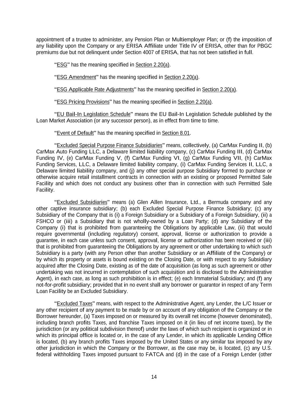 14 appointment of a trustee to administer, any Pension Plan or Multiemployer Plan; or (f) the imposition of any liability upon the Company or any ERISA Affiliate under Title IV of ERISA, other than for PBGC premiums due but not delinquent under Section 4007 of ERISA, that has not been satisfied in full. “ESG” has the meaning specified in Section 2.20(a). “ESG Amendment” has the meaning specified in Section 2.20(a). “ESG Applicable Rate Adjustments” has the meaning specified in Section 2.20(a). “ESG Pricing Provisions” has the meaning specified in Section 2.20(a). “EU Bail-In Legislation Schedule” means the EU Bail-In Legislation Schedule published by the Loan Market Association (or any successor person), as in effect from time to time. “Event of Default” has the meaning specified in Section 8.01. “Excluded Special Purpose Finance Subsidiaries” means, collectively, (a) CarMax Funding II, (b) CarMax Auto Funding LLC, a Delaware limited liability company, (c) CarMax Funding III, (d) CarMax Funding IV, (e) CarMax Funding V, (f) CarMax Funding VI, (g) CarMax Funding VII, (h) CarMax Funding Services, LLC, a Delaware limited liability company, (i) CarMax Funding Services II, LLC, a Delaware limited liability company, and (j) any other special purpose Subsidiary formed to purchase or otherwise acquire retail installment contracts in connection with an existing or proposed Permitted Sale Facility and which does not conduct any business other than in connection with such Permitted Sale Facility. “Excluded Subsidiaries” means (a) Glen Allen Insurance, Ltd., a Bermuda company and any other captive insurance subsidiary; (b) each Excluded Special Purpose Finance Subsidiary; (c) any Subsidiary of the Company that is (i) a Foreign Subsidiary or a Subsidiary of a Foreign Subsidiary, (ii) a FSHCO or (iii) a Subsidiary that is not wholly-owned by a Loan Party; (d) any Subsidiary of the Company (i) that is prohibited from guaranteeing the Obligations by applicable Law, (ii) that would require governmental (including regulatory) consent, approval, license or authorization to provide a guarantee, in each case unless such consent, approval, license or authorization has been received or (iii) that is prohibited from guaranteeing the Obligations by any agreement or other undertaking to which such Subsidiary is a party (with any Person other than another Subsidiary or an Affiliate of the Company) or by which its property or assets is bound existing on the Closing Date, or with respect to any Subsidiary acquired after the Closing Date, existing as of the date of acquisition (as long as such agreement or other undertaking was not incurred in contemplation of such acquisition and is disclosed to the Administrative Agent), in each case, as long as such prohibition is in effect; (e) each Immaterial Subsidiary; and (f) any not-for-profit subsidiary; provided that in no event shall any borrower or guarantor in respect of any Term Loan Facility be an Excluded Subsidiary. “Excluded Taxes” means, with respect to the Administrative Agent, any Lender, the L/C Issuer or any other recipient of any payment to be made by or on account of any obligation of the Company or the Borrower hereunder, (a) Taxes imposed on or measured by its overall net income (however denominated), including branch profits Taxes, and franchise Taxes imposed on it (in lieu of net income taxes), by the jurisdiction (or any political subdivision thereof) under the laws of which such recipient is organized or in which its principal office is located or, in the case of any Lender, in which its applicable Lending Office is located, (b) any branch profits Taxes imposed by the United States or any similar tax imposed by any other jurisdiction in which the Company or the Borrower, as the case may be, is located, (c) any U.S. federal withholding Taxes imposed pursuant to FATCA and (d) in the case of a Foreign Lender (other