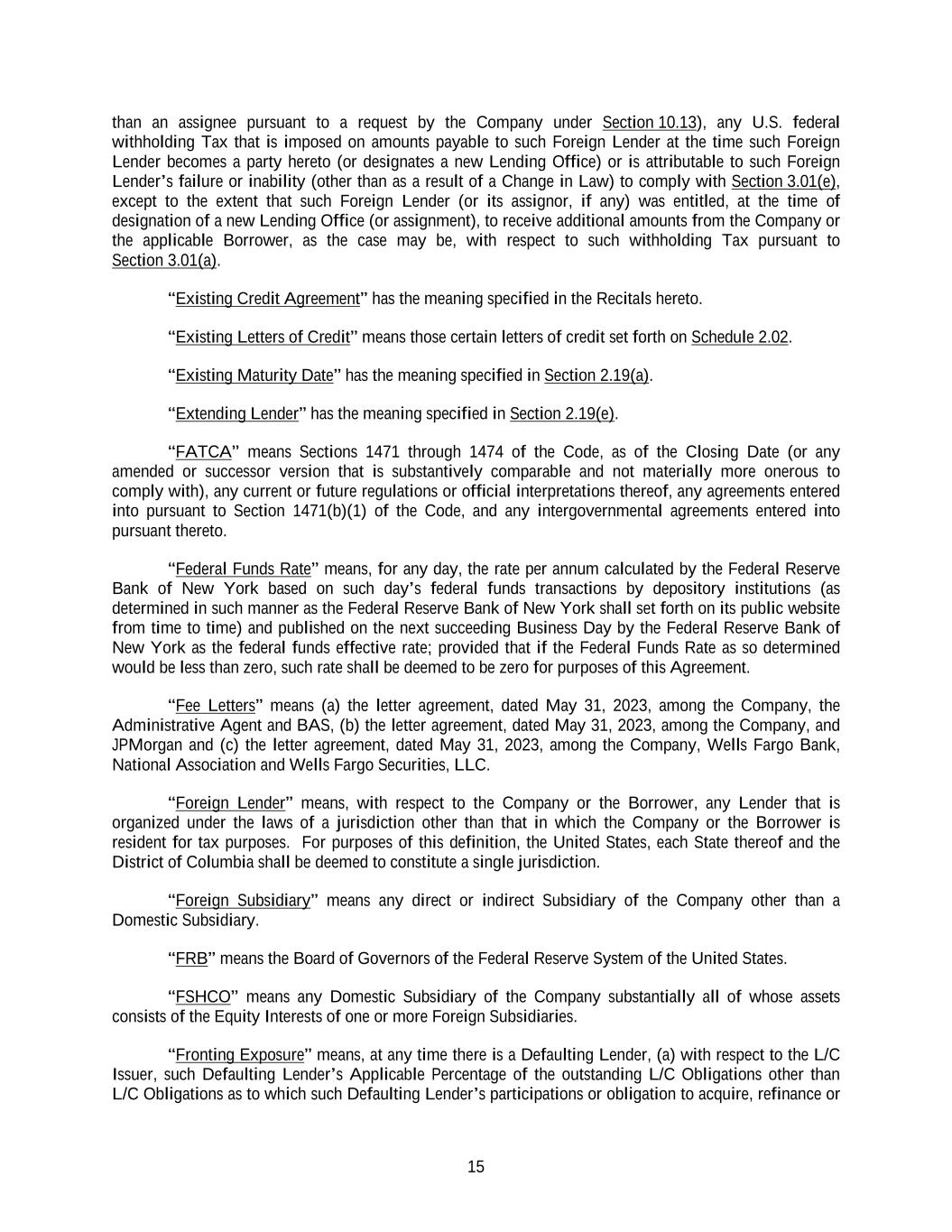15 than an assignee pursuant to a request by the Company under Section 10.13), any U.S. federal withholding Tax that is imposed on amounts payable to such Foreign Lender at the time such Foreign Lender becomes a party hereto (or designates a new Lending Office) or is attributable to such Foreign Lender’s failure or inability (other than as a result of a Change in Law) to comply with Section 3.01(e), except to the extent that such Foreign Lender (or its assignor, if any) was entitled, at the time of designation of a new Lending Office (or assignment), to receive additional amounts from the Company or the applicable Borrower, as the case may be, with respect to such withholding Tax pursuant to Section 3.01(a). “Existing Credit Agreement” has the meaning specified in the Recitals hereto. “Existing Letters of Credit” means those certain letters of credit set forth on Schedule 2.02. “Existing Maturity Date” has the meaning specified in Section 2.19(a). “Extending Lender” has the meaning specified in Section 2.19(e). “FATCA” means Sections 1471 through 1474 of the Code, as of the Closing Date (or any amended or successor version that is substantively comparable and not materially more onerous to comply with), any current or future regulations or official interpretations thereof, any agreements entered into pursuant to Section 1471(b)(1) of the Code, and any intergovernmental agreements entered into pursuant thereto. “Federal Funds Rate” means, for any day, the rate per annum calculated by the Federal Reserve Bank of New York based on such day’s federal funds transactions by depository institutions (as determined in such manner as the Federal Reserve Bank of New York shall set forth on its public website from time to time) and published on the next succeeding Business Day by the Federal Reserve Bank of New York as the federal funds effective rate; provided that if the Federal Funds Rate as so determined would be less than zero, such rate shall be deemed to be zero for purposes of this Agreement. “Fee Letters” means (a) the letter agreement, dated May 31, 2023, among the Company, the Administrative Agent and BAS, (b) the letter agreement, dated May 31, 2023, among the Company, and JPMorgan and (c) the letter agreement, dated May 31, 2023, among the Company, Wells Fargo Bank, National Association and Wells Fargo Securities, LLC. “Foreign Lender” means, with respect to the Company or the Borrower, any Lender that is organized under the laws of a jurisdiction other than that in which the Company or the Borrower is resident for tax purposes. For purposes of this definition, the United States, each State thereof and the District of Columbia shall be deemed to constitute a single jurisdiction. “Foreign Subsidiary” means any direct or indirect Subsidiary of the Company other than a Domestic Subsidiary. “FRB” means the Board of Governors of the Federal Reserve System of the United States. “FSHCO” means any Domestic Subsidiary of the Company substantially all of whose assets consists of the Equity Interests of one or more Foreign Subsidiaries. “Fronting Exposure” means, at any time there is a Defaulting Lender, (a) with respect to the L/C Issuer, such Defaulting Lender’s Applicable Percentage of the outstanding L/C Obligations other than L/C Obligations as to which such Defaulting Lender’s participations or obligation to acquire, refinance or