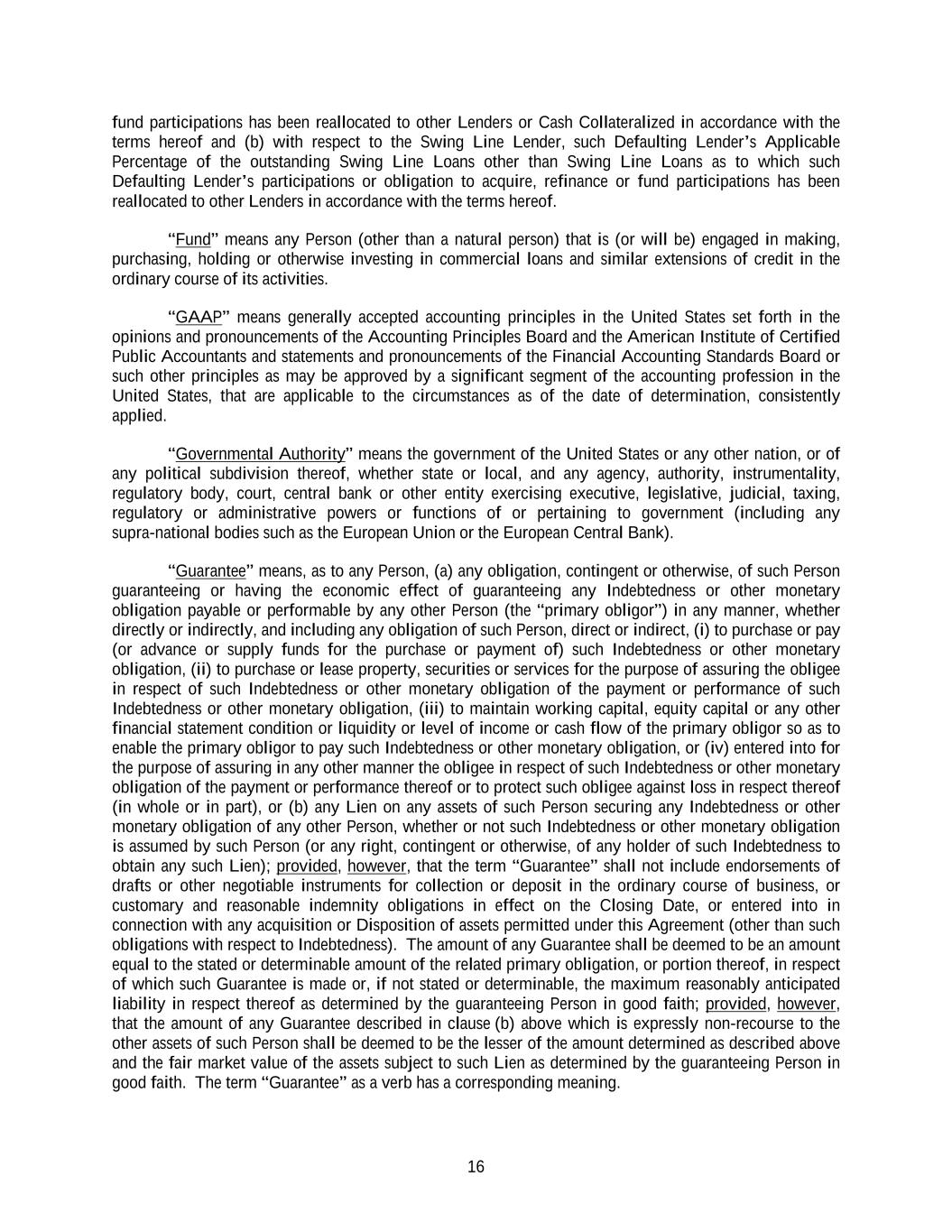 16 fund participations has been reallocated to other Lenders or Cash Collateralized in accordance with the terms hereof and (b) with respect to the Swing Line Lender, such Defaulting Lender’s Applicable Percentage of the outstanding Swing Line Loans other than Swing Line Loans as to which such Defaulting Lender’s participations or obligation to acquire, refinance or fund participations has been reallocated to other Lenders in accordance with the terms hereof. “Fund” means any Person (other than a natural person) that is (or will be) engaged in making, purchasing, holding or otherwise investing in commercial loans and similar extensions of credit in the ordinary course of its activities. “GAAP” means generally accepted accounting principles in the United States set forth in the opinions and pronouncements of the Accounting Principles Board and the American Institute of Certified Public Accountants and statements and pronouncements of the Financial Accounting Standards Board or such other principles as may be approved by a significant segment of the accounting profession in the United States, that are applicable to the circumstances as of the date of determination, consistently applied. “Governmental Authority” means the government of the United States or any other nation, or of any political subdivision thereof, whether state or local, and any agency, authority, instrumentality, regulatory body, court, central bank or other entity exercising executive, legislative, judicial, taxing, regulatory or administrative powers or functions of or pertaining to government (including any supra-national bodies such as the European Union or the European Central Bank). “Guarantee” means, as to any Person, (a) any obligation, contingent or otherwise, of such Person guaranteeing or having the economic effect of guaranteeing any Indebtedness or other monetary obligation payable or performable by any other Person (the “primary obligor”) in any manner, whether directly or indirectly, and including any obligation of such Person, direct or indirect, (i) to purchase or pay (or advance or supply funds for the purchase or payment of) such Indebtedness or other monetary obligation, (ii) to purchase or lease property, securities or services for the purpose of assuring the obligee in respect of such Indebtedness or other monetary obligation of the payment or performance of such Indebtedness or other monetary obligation, (iii) to maintain working capital, equity capital or any other financial statement condition or liquidity or level of income or cash flow of the primary obligor so as to enable the primary obligor to pay such Indebtedness or other monetary obligation, or (iv) entered into for the purpose of assuring in any other manner the obligee in respect of such Indebtedness or other monetary obligation of the payment or performance thereof or to protect such obligee against loss in respect thereof (in whole or in part), or (b) any Lien on any assets of such Person securing any Indebtedness or other monetary obligation of any other Person, whether or not such Indebtedness or other monetary obligation is assumed by such Person (or any right, contingent or otherwise, of any holder of such Indebtedness to obtain any such Lien); provided, however, that the term “Guarantee” shall not include endorsements of drafts or other negotiable instruments for collection or deposit in the ordinary course of business, or customary and reasonable indemnity obligations in effect on the Closing Date, or entered into in connection with any acquisition or Disposition of assets permitted under this Agreement (other than such obligations with respect to Indebtedness). The amount of any Guarantee shall be deemed to be an amount equal to the stated or determinable amount of the related primary obligation, or portion thereof, in respect of which such Guarantee is made or, if not stated or determinable, the maximum reasonably anticipated liability in respect thereof as determined by the guaranteeing Person in good faith; provided, however, that the amount of any Guarantee described in clause (b) above which is expressly non-recourse to the other assets of such Person shall be deemed to be the lesser of the amount determined as described above and the fair market value of the assets subject to such Lien as determined by the guaranteeing Person in good faith. The term “Guarantee” as a verb has a corresponding meaning.