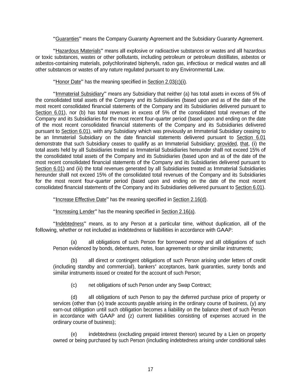 17 “Guaranties” means the Company Guaranty Agreement and the Subsidiary Guaranty Agreement. “Hazardous Materials” means all explosive or radioactive substances or wastes and all hazardous or toxic substances, wastes or other pollutants, including petroleum or petroleum distillates, asbestos or asbestos-containing materials, polychlorinated biphenyls, radon gas, infectious or medical wastes and all other substances or wastes of any nature regulated pursuant to any Environmental Law. “Honor Date” has the meaning specified in Section 2.03(c)(i). “Immaterial Subsidiary” means any Subsidiary that neither (a) has total assets in excess of 5% of the consolidated total assets of the Company and its Subsidiaries (based upon and as of the date of the most recent consolidated financial statements of the Company and its Subsidiaries delivered pursuant to Section 6.01), nor (b) has total revenues in excess of 5% of the consolidated total revenues of the Company and its Subsidiaries for the most recent four-quarter period (based upon and ending on the date of the most recent consolidated financial statements of the Company and its Subsidiaries delivered pursuant to Section 6.01), with any Subsidiary which was previously an Immaterial Subsidiary ceasing to be an Immaterial Subsidiary on the date financial statements delivered pursuant to Section 6.01 demonstrate that such Subsidiary ceases to qualify as an Immaterial Subsidiary; provided, that, (i) the total assets held by all Subsidiaries treated as Immaterial Subsidiaries hereunder shall not exceed 15% of the consolidated total assets of the Company and its Subsidiaries (based upon and as of the date of the most recent consolidated financial statements of the Company and its Subsidiaries delivered pursuant to Section 6.01) and (ii) the total revenues generated by all Subsidiaries treated as Immaterial Subsidiaries hereunder shall not exceed 15% of the consolidated total revenues of the Company and its Subsidiaries for the most recent four-quarter period (based upon and ending on the date of the most recent consolidated financial statements of the Company and its Subsidiaries delivered pursuant to Section 6.01). “Increase Effective Date” has the meaning specified in Section 2.16(d). “Increasing Lender” has the meaning specified in Section 2.16(a). “Indebtedness” means, as to any Person at a particular time, without duplication, all of the following, whether or not included as indebtedness or liabilities in accordance with GAAP: (a) all obligations of such Person for borrowed money and all obligations of such Person evidenced by bonds, debentures, notes, loan agreements or other similar instruments; (b) all direct or contingent obligations of such Person arising under letters of credit (including standby and commercial), bankers’ acceptances, bank guaranties, surety bonds and similar instruments issued or created for the account of such Person; (c) net obligations of such Person under any Swap Contract; (d) all obligations of such Person to pay the deferred purchase price of property or services (other than (x) trade accounts payable arising in the ordinary course of business, (y) any earn-out obligation until such obligation becomes a liability on the balance sheet of such Person in accordance with GAAP and (z) current liabilities consisting of expenses accrued in the ordinary course of business); (e) indebtedness (excluding prepaid interest thereon) secured by a Lien on property owned or being purchased by such Person (including indebtedness arising under conditional sales