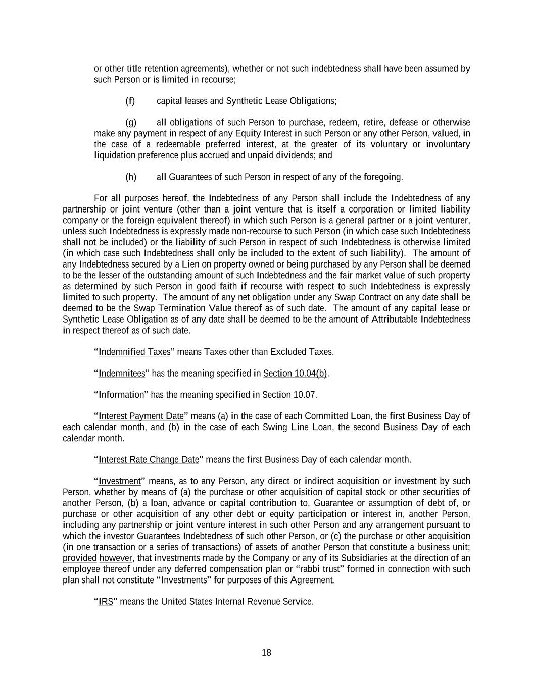 18 or other title retention agreements), whether or not such indebtedness shall have been assumed by such Person or is limited in recourse; (f) capital leases and Synthetic Lease Obligations; (g) all obligations of such Person to purchase, redeem, retire, defease or otherwise make any payment in respect of any Equity Interest in such Person or any other Person, valued, in the case of a redeemable preferred interest, at the greater of its voluntary or involuntary liquidation preference plus accrued and unpaid dividends; and (h) all Guarantees of such Person in respect of any of the foregoing. For all purposes hereof, the Indebtedness of any Person shall include the Indebtedness of any partnership or joint venture (other than a joint venture that is itself a corporation or limited liability company or the foreign equivalent thereof) in which such Person is a general partner or a joint venturer, unless such Indebtedness is expressly made non-recourse to such Person (in which case such Indebtedness shall not be included) or the liability of such Person in respect of such Indebtedness is otherwise limited (in which case such Indebtedness shall only be included to the extent of such liability). The amount of any Indebtedness secured by a Lien on property owned or being purchased by any Person shall be deemed to be the lesser of the outstanding amount of such Indebtedness and the fair market value of such property as determined by such Person in good faith if recourse with respect to such Indebtedness is expressly limited to such property. The amount of any net obligation under any Swap Contract on any date shall be deemed to be the Swap Termination Value thereof as of such date. The amount of any capital lease or Synthetic Lease Obligation as of any date shall be deemed to be the amount of Attributable Indebtedness in respect thereof as of such date. “Indemnified Taxes” means Taxes other than Excluded Taxes. “Indemnitees” has the meaning specified in Section 10.04(b). “Information” has the meaning specified in Section 10.07. “Interest Payment Date” means (a) in the case of each Committed Loan, the first Business Day of each calendar month, and (b) in the case of each Swing Line Loan, the second Business Day of each calendar month. “Interest Rate Change Date” means the first Business Day of each calendar month. “Investment” means, as to any Person, any direct or indirect acquisition or investment by such Person, whether by means of (a) the purchase or other acquisition of capital stock or other securities of another Person, (b) a loan, advance or capital contribution to, Guarantee or assumption of debt of, or purchase or other acquisition of any other debt or equity participation or interest in, another Person, including any partnership or joint venture interest in such other Person and any arrangement pursuant to which the investor Guarantees Indebtedness of such other Person, or (c) the purchase or other acquisition (in one transaction or a series of transactions) of assets of another Person that constitute a business unit; provided however, that investments made by the Company or any of its Subsidiaries at the direction of an employee thereof under any deferred compensation plan or “rabbi trust” formed in connection with such plan shall not constitute “Investments” for purposes of this Agreement. “IRS” means the United States Internal Revenue Service.