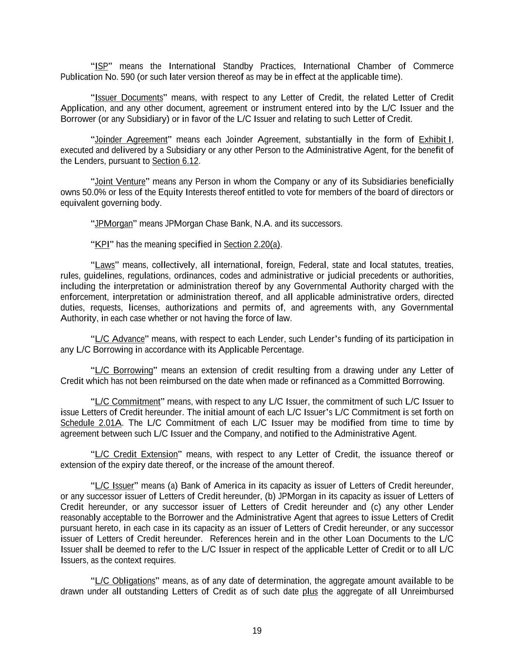 19 “ISP” means the International Standby Practices, International Chamber of Commerce Publication No. 590 (or such later version thereof as may be in effect at the applicable time). “Issuer Documents” means, with respect to any Letter of Credit, the related Letter of Credit Application, and any other document, agreement or instrument entered into by the L/C Issuer and the Borrower (or any Subsidiary) or in favor of the L/C Issuer and relating to such Letter of Credit. “Joinder Agreement” means each Joinder Agreement, substantially in the form of Exhibit I, executed and delivered by a Subsidiary or any other Person to the Administrative Agent, for the benefit of the Lenders, pursuant to Section 6.12. “Joint Venture” means any Person in whom the Company or any of its Subsidiaries beneficially owns 50.0% or less of the Equity Interests thereof entitled to vote for members of the board of directors or equivalent governing body. “JPMorgan” means JPMorgan Chase Bank, N.A. and its successors. “KPI” has the meaning specified in Section 2.20(a). “Laws” means, collectively, all international, foreign, Federal, state and local statutes, treaties, rules, guidelines, regulations, ordinances, codes and administrative or judicial precedents or authorities, including the interpretation or administration thereof by any Governmental Authority charged with the enforcement, interpretation or administration thereof, and all applicable administrative orders, directed duties, requests, licenses, authorizations and permits of, and agreements with, any Governmental Authority, in each case whether or not having the force of law. “L/C Advance” means, with respect to each Lender, such Lender’s funding of its participation in any L/C Borrowing in accordance with its Applicable Percentage. “L/C Borrowing” means an extension of credit resulting from a drawing under any Letter of Credit which has not been reimbursed on the date when made or refinanced as a Committed Borrowing. “L/C Commitment” means, with respect to any L/C Issuer, the commitment of such L/C Issuer to issue Letters of Credit hereunder. The initial amount of each L/C Issuer’s L/C Commitment is set forth on Schedule 2.01A. The L/C Commitment of each L/C Issuer may be modified from time to time by agreement between such L/C Issuer and the Company, and notified to the Administrative Agent. “L/C Credit Extension” means, with respect to any Letter of Credit, the issuance thereof or extension of the expiry date thereof, or the increase of the amount thereof. “L/C Issuer” means (a) Bank of America in its capacity as issuer of Letters of Credit hereunder, or any successor issuer of Letters of Credit hereunder, (b) JPMorgan in its capacity as issuer of Letters of Credit hereunder, or any successor issuer of Letters of Credit hereunder and (c) any other Lender reasonably acceptable to the Borrower and the Administrative Agent that agrees to issue Letters of Credit pursuant hereto, in each case in its capacity as an issuer of Letters of Credit hereunder, or any successor issuer of Letters of Credit hereunder. References herein and in the other Loan Documents to the L/C Issuer shall be deemed to refer to the L/C Issuer in respect of the applicable Letter of Credit or to all L/C Issuers, as the context requires. “L/C Obligations” means, as of any date of determination, the aggregate amount available to be drawn under all outstanding Letters of Credit as of such date plus the aggregate of all Unreimbursed