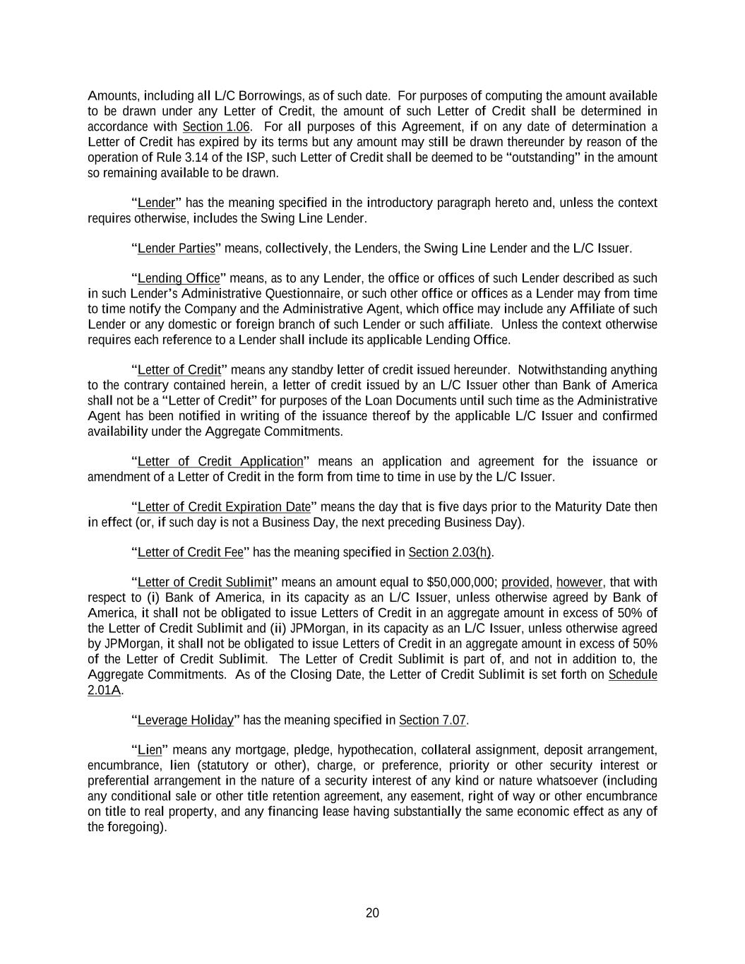 20 Amounts, including all L/C Borrowings, as of such date. For purposes of computing the amount available to be drawn under any Letter of Credit, the amount of such Letter of Credit shall be determined in accordance with Section 1.06. For all purposes of this Agreement, if on any date of determination a Letter of Credit has expired by its terms but any amount may still be drawn thereunder by reason of the operation of Rule 3.14 of the ISP, such Letter of Credit shall be deemed to be “outstanding” in the amount so remaining available to be drawn. “Lender” has the meaning specified in the introductory paragraph hereto and, unless the context requires otherwise, includes the Swing Line Lender. “Lender Parties” means, collectively, the Lenders, the Swing Line Lender and the L/C Issuer. “Lending Office” means, as to any Lender, the office or offices of such Lender described as such in such Lender’s Administrative Questionnaire, or such other office or offices as a Lender may from time to time notify the Company and the Administrative Agent, which office may include any Affiliate of such Lender or any domestic or foreign branch of such Lender or such affiliate. Unless the context otherwise requires each reference to a Lender shall include its applicable Lending Office. “Letter of Credit” means any standby letter of credit issued hereunder. Notwithstanding anything to the contrary contained herein, a letter of credit issued by an L/C Issuer other than Bank of America shall not be a “Letter of Credit” for purposes of the Loan Documents until such time as the Administrative Agent has been notified in writing of the issuance thereof by the applicable L/C Issuer and confirmed availability under the Aggregate Commitments. “Letter of Credit Application” means an application and agreement for the issuance or amendment of a Letter of Credit in the form from time to time in use by the L/C Issuer. “Letter of Credit Expiration Date” means the day that is five days prior to the Maturity Date then in effect (or, if such day is not a Business Day, the next preceding Business Day). “Letter of Credit Fee” has the meaning specified in Section 2.03(h). “Letter of Credit Sublimit” means an amount equal to $50,000,000; provided, however, that with respect to (i) Bank of America, in its capacity as an L/C Issuer, unless otherwise agreed by Bank of America, it shall not be obligated to issue Letters of Credit in an aggregate amount in excess of 50% of the Letter of Credit Sublimit and (ii) JPMorgan, in its capacity as an L/C Issuer, unless otherwise agreed by JPMorgan, it shall not be obligated to issue Letters of Credit in an aggregate amount in excess of 50% of the Letter of Credit Sublimit. The Letter of Credit Sublimit is part of, and not in addition to, the Aggregate Commitments. As of the Closing Date, the Letter of Credit Sublimit is set forth on Schedule 2.01A. “Leverage Holiday” has the meaning specified in Section 7.07. “Lien” means any mortgage, pledge, hypothecation, collateral assignment, deposit arrangement, encumbrance, lien (statutory or other), charge, or preference, priority or other security interest or preferential arrangement in the nature of a security interest of any kind or nature whatsoever (including any conditional sale or other title retention agreement, any easement, right of way or other encumbrance on title to real property, and any financing lease having substantially the same economic effect as any of the foregoing).