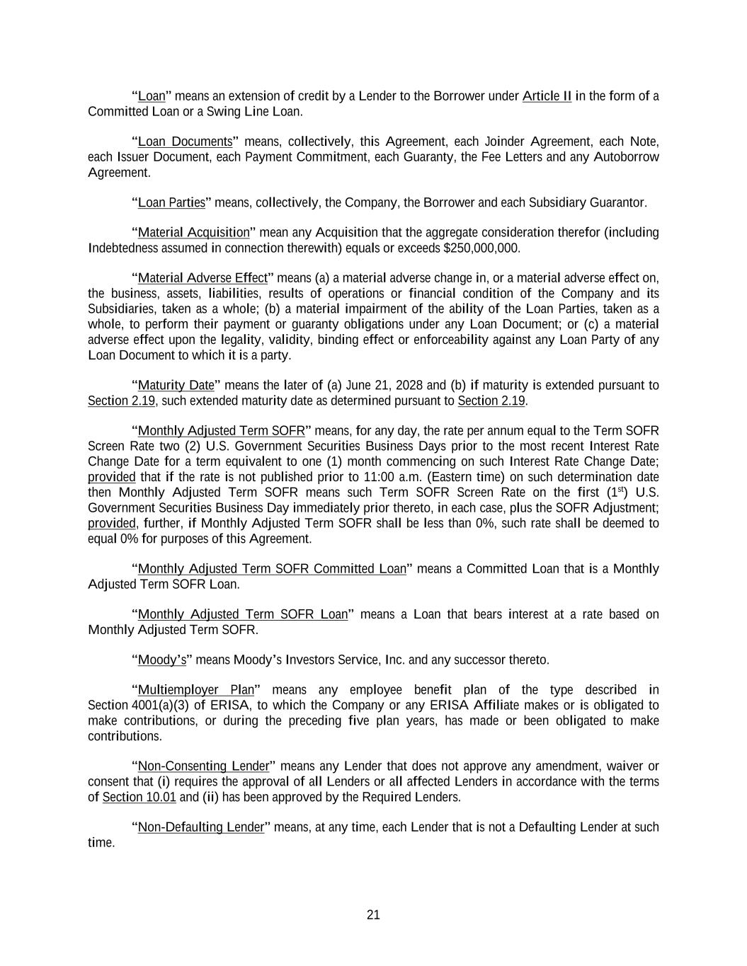 21 “Loan” means an extension of credit by a Lender to the Borrower under Article II in the form of a Committed Loan or a Swing Line Loan. “Loan Documents” means, collectively, this Agreement, each Joinder Agreement, each Note, each Issuer Document, each Payment Commitment, each Guaranty, the Fee Letters and any Autoborrow Agreement. “Loan Parties” means, collectively, the Company, the Borrower and each Subsidiary Guarantor. “Material Acquisition” mean any Acquisition that the aggregate consideration therefor (including Indebtedness assumed in connection therewith) equals or exceeds $250,000,000. “Material Adverse Effect” means (a) a material adverse change in, or a material adverse effect on, the business, assets, liabilities, results of operations or financial condition of the Company and its Subsidiaries, taken as a whole; (b) a material impairment of the ability of the Loan Parties, taken as a whole, to perform their payment or guaranty obligations under any Loan Document; or (c) a material adverse effect upon the legality, validity, binding effect or enforceability against any Loan Party of any Loan Document to which it is a party. “Maturity Date” means the later of (a) June 21, 2028 and (b) if maturity is extended pursuant to Section 2.19, such extended maturity date as determined pursuant to Section 2.19. “Monthly Adjusted Term SOFR” means, for any day, the rate per annum equal to the Term SOFR Screen Rate two (2) U.S. Government Securities Business Days prior to the most recent Interest Rate Change Date for a term equivalent to one (1) month commencing on such Interest Rate Change Date; provided that if the rate is not published prior to 11:00 a.m. (Eastern time) on such determination date then Monthly Adjusted Term SOFR means such Term SOFR Screen Rate on the first (1st) U.S. Government Securities Business Day immediately prior thereto, in each case, plus the SOFR Adjustment; provided, further, if Monthly Adjusted Term SOFR shall be less than 0%, such rate shall be deemed to equal 0% for purposes of this Agreement. “Monthly Adjusted Term SOFR Committed Loan” means a Committed Loan that is a Monthly Adjusted Term SOFR Loan. “Monthly Adjusted Term SOFR Loan” means a Loan that bears interest at a rate based on Monthly Adjusted Term SOFR. “Moody’s” means Moody’s Investors Service, Inc. and any successor thereto. “Multiemployer Plan” means any employee benefit plan of the type described in Section 4001(a)(3) of ERISA, to which the Company or any ERISA Affiliate makes or is obligated to make contributions, or during the preceding five plan years, has made or been obligated to make contributions. “Non-Consenting Lender” means any Lender that does not approve any amendment, waiver or consent that (i) requires the approval of all Lenders or all affected Lenders in accordance with the terms of Section 10.01 and (ii) has been approved by the Required Lenders. “Non-Defaulting Lender” means, at any time, each Lender that is not a Defaulting Lender at such time.