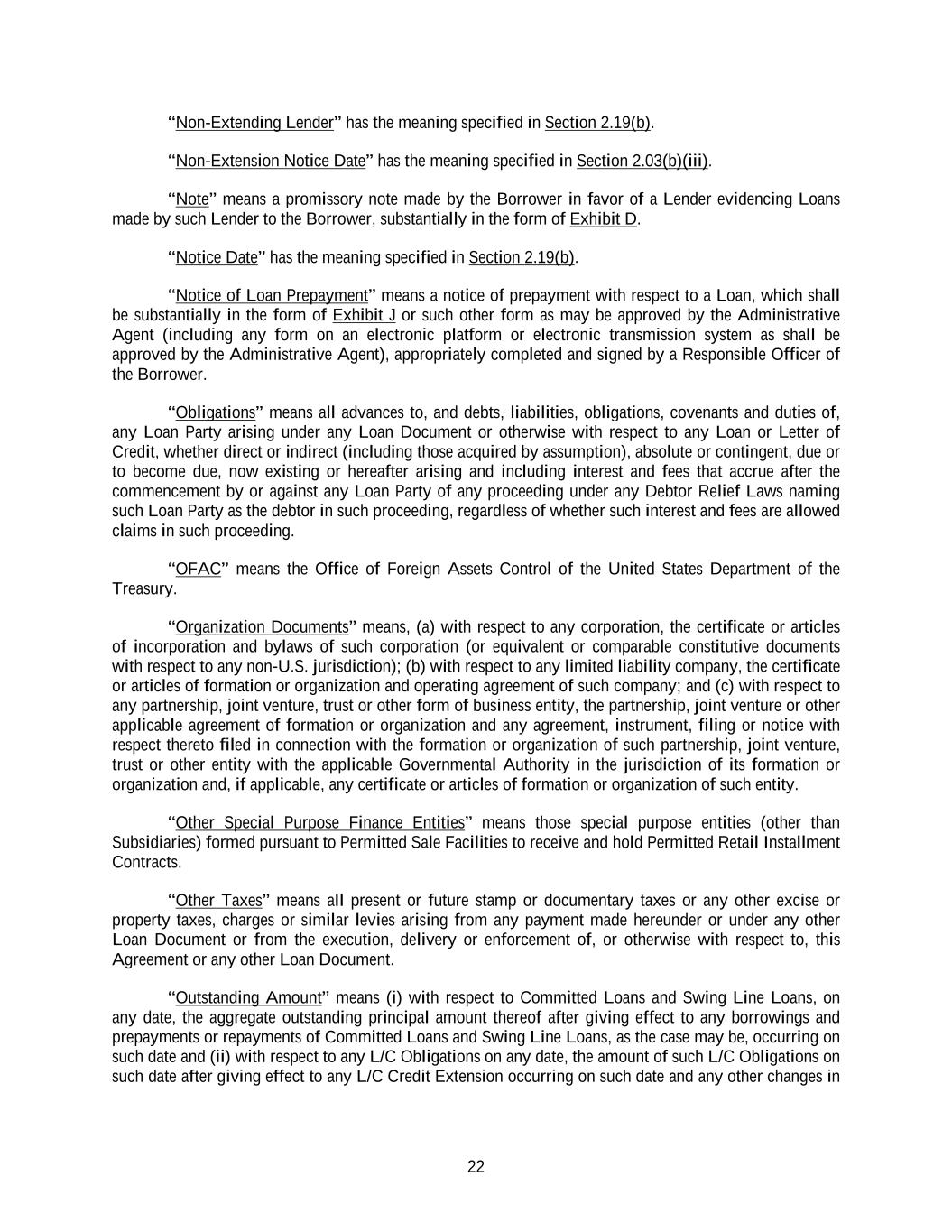 22 “Non-Extending Lender” has the meaning specified in Section 2.19(b). “Non-Extension Notice Date” has the meaning specified in Section 2.03(b)(iii). “Note” means a promissory note made by the Borrower in favor of a Lender evidencing Loans made by such Lender to the Borrower, substantially in the form of Exhibit D. “Notice Date” has the meaning specified in Section 2.19(b). “Notice of Loan Prepayment” means a notice of prepayment with respect to a Loan, which shall be substantially in the form of Exhibit J or such other form as may be approved by the Administrative Agent (including any form on an electronic platform or electronic transmission system as shall be approved by the Administrative Agent), appropriately completed and signed by a Responsible Officer of the Borrower. “Obligations” means all advances to, and debts, liabilities, obligations, covenants and duties of, any Loan Party arising under any Loan Document or otherwise with respect to any Loan or Letter of Credit, whether direct or indirect (including those acquired by assumption), absolute or contingent, due or to become due, now existing or hereafter arising and including interest and fees that accrue after the commencement by or against any Loan Party of any proceeding under any Debtor Relief Laws naming such Loan Party as the debtor in such proceeding, regardless of whether such interest and fees are allowed claims in such proceeding. “OFAC” means the Office of Foreign Assets Control of the United States Department of the Treasury. “Organization Documents” means, (a) with respect to any corporation, the certificate or articles of incorporation and bylaws of such corporation (or equivalent or comparable constitutive documents with respect to any non-U.S. jurisdiction); (b) with respect to any limited liability company, the certificate or articles of formation or organization and operating agreement of such company; and (c) with respect to any partnership, joint venture, trust or other form of business entity, the partnership, joint venture or other applicable agreement of formation or organization and any agreement, instrument, filing or notice with respect thereto filed in connection with the formation or organization of such partnership, joint venture, trust or other entity with the applicable Governmental Authority in the jurisdiction of its formation or organization and, if applicable, any certificate or articles of formation or organization of such entity. “Other Special Purpose Finance Entities” means those special purpose entities (other than Subsidiaries) formed pursuant to Permitted Sale Facilities to receive and hold Permitted Retail Installment Contracts. “Other Taxes” means all present or future stamp or documentary taxes or any other excise or property taxes, charges or similar levies arising from any payment made hereunder or under any other Loan Document or from the execution, delivery or enforcement of, or otherwise with respect to, this Agreement or any other Loan Document. “Outstanding Amount” means (i) with respect to Committed Loans and Swing Line Loans, on any date, the aggregate outstanding principal amount thereof after giving effect to any borrowings and prepayments or repayments of Committed Loans and Swing Line Loans, as the case may be, occurring on such date and (ii) with respect to any L/C Obligations on any date, the amount of such L/C Obligations on such date after giving effect to any L/C Credit Extension occurring on such date and any other changes in
