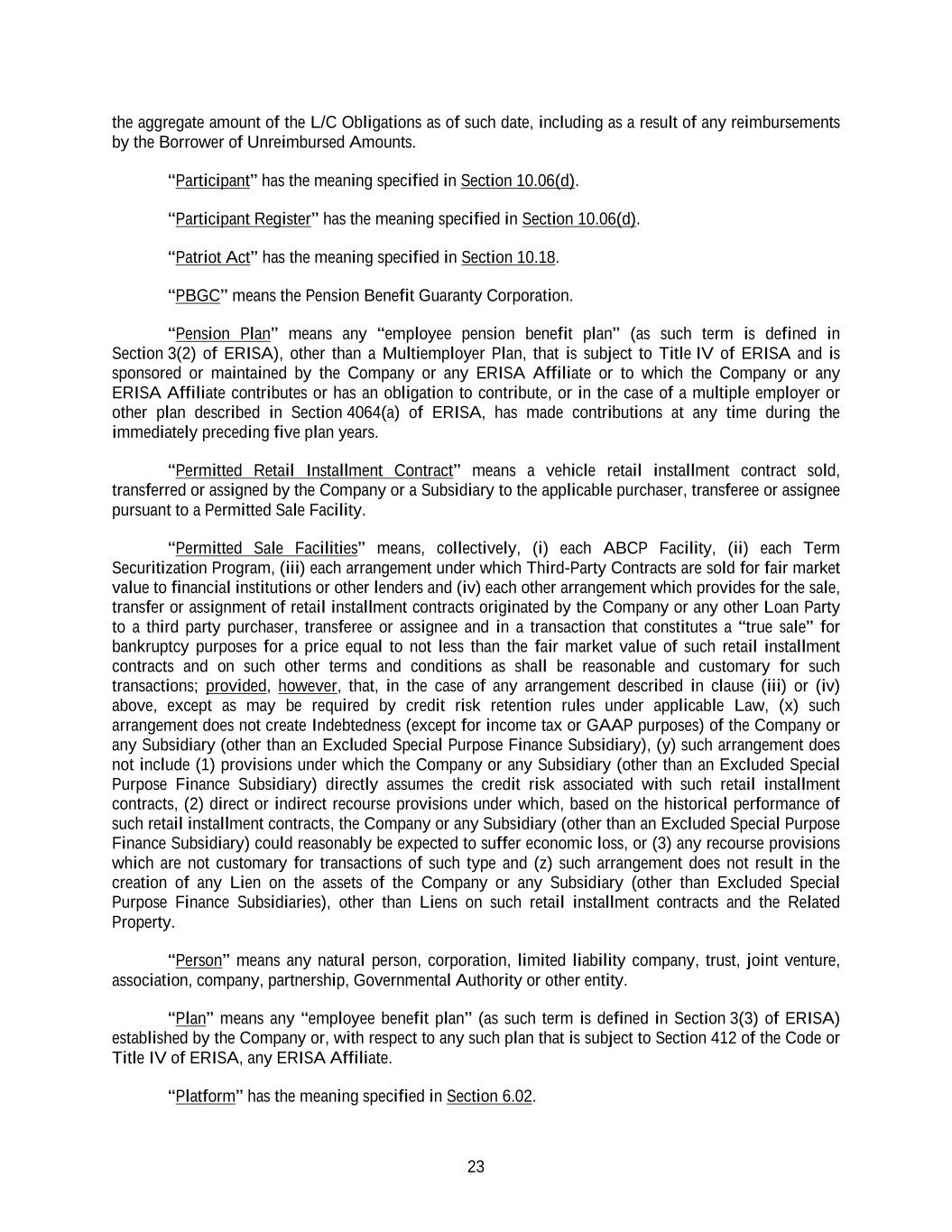 23 the aggregate amount of the L/C Obligations as of such date, including as a result of any reimbursements by the Borrower of Unreimbursed Amounts. “Participant” has the meaning specified in Section 10.06(d). “Participant Register” has the meaning specified in Section 10.06(d). “Patriot Act” has the meaning specified in Section 10.18. “PBGC” means the Pension Benefit Guaranty Corporation. “Pension Plan” means any “employee pension benefit plan” (as such term is defined in Section 3(2) of ERISA), other than a Multiemployer Plan, that is subject to Title IV of ERISA and is sponsored or maintained by the Company or any ERISA Affiliate or to which the Company or any ERISA Affiliate contributes or has an obligation to contribute, or in the case of a multiple employer or other plan described in Section 4064(a) of ERISA, has made contributions at any time during the immediately preceding five plan years. “Permitted Retail Installment Contract” means a vehicle retail installment contract sold, transferred or assigned by the Company or a Subsidiary to the applicable purchaser, transferee or assignee pursuant to a Permitted Sale Facility. “Permitted Sale Facilities” means, collectively, (i) each ABCP Facility, (ii) each Term Securitization Program, (iii) each arrangement under which Third-Party Contracts are sold for fair market value to financial institutions or other lenders and (iv) each other arrangement which provides for the sale, transfer or assignment of retail installment contracts originated by the Company or any other Loan Party to a third party purchaser, transferee or assignee and in a transaction that constitutes a “true sale” for bankruptcy purposes for a price equal to not less than the fair market value of such retail installment contracts and on such other terms and conditions as shall be reasonable and customary for such transactions; provided, however, that, in the case of any arrangement described in clause (iii) or (iv) above, except as may be required by credit risk retention rules under applicable Law, (x) such arrangement does not create Indebtedness (except for income tax or GAAP purposes) of the Company or any Subsidiary (other than an Excluded Special Purpose Finance Subsidiary), (y) such arrangement does not include (1) provisions under which the Company or any Subsidiary (other than an Excluded Special Purpose Finance Subsidiary) directly assumes the credit risk associated with such retail installment contracts, (2) direct or indirect recourse provisions under which, based on the historical performance of such retail installment contracts, the Company or any Subsidiary (other than an Excluded Special Purpose Finance Subsidiary) could reasonably be expected to suffer economic loss, or (3) any recourse provisions which are not customary for transactions of such type and (z) such arrangement does not result in the creation of any Lien on the assets of the Company or any Subsidiary (other than Excluded Special Purpose Finance Subsidiaries), other than Liens on such retail installment contracts and the Related Property. “Person” means any natural person, corporation, limited liability company, trust, joint venture, association, company, partnership, Governmental Authority or other entity. “Plan” means any “employee benefit plan” (as such term is defined in Section 3(3) of ERISA) established by the Company or, with respect to any such plan that is subject to Section 412 of the Code or Title IV of ERISA, any ERISA Affiliate. “Platform” has the meaning specified in Section 6.02.