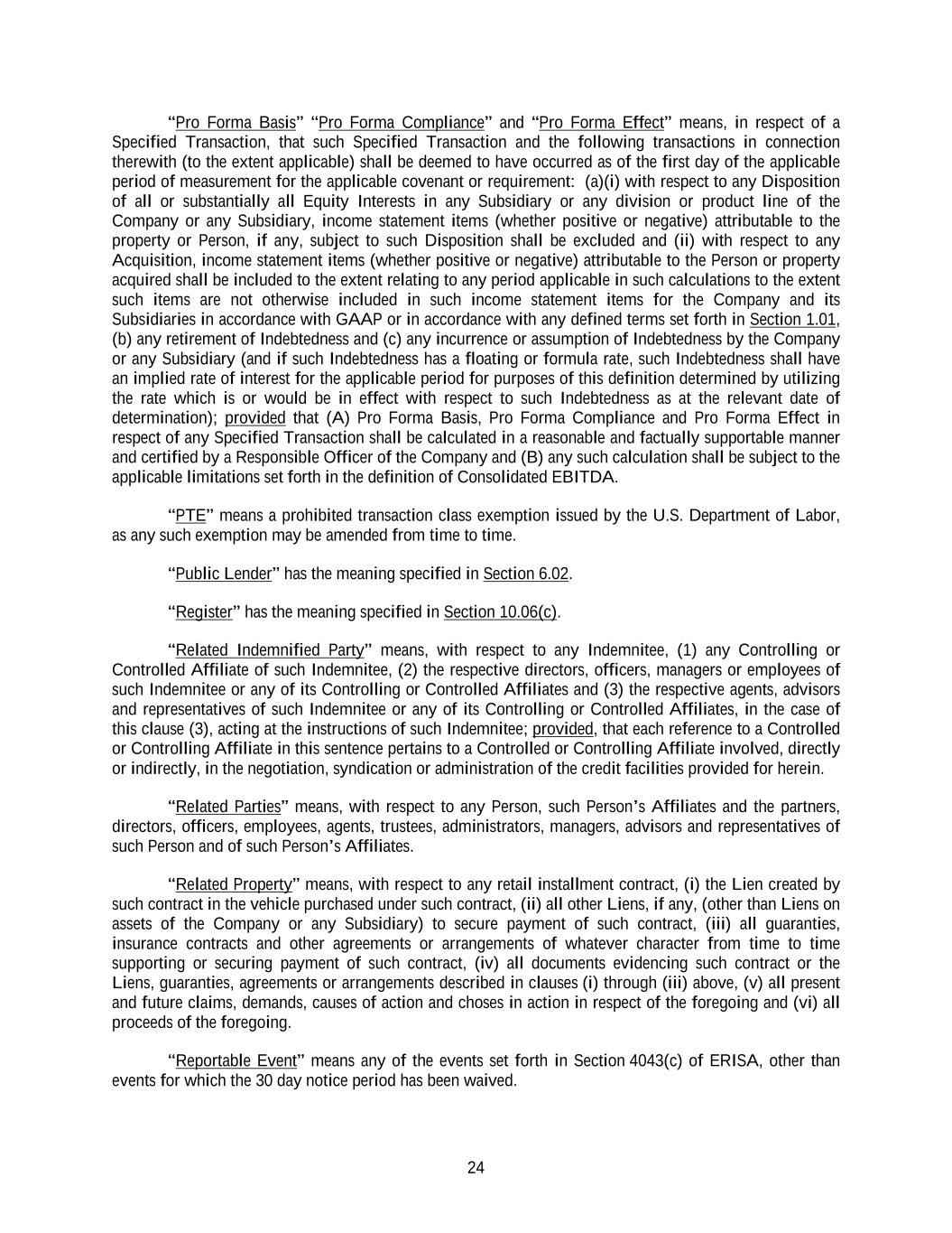 24 “Pro Forma Basis” “Pro Forma Compliance” and “Pro Forma Effect” means, in respect of a Specified Transaction, that such Specified Transaction and the following transactions in connection therewith (to the extent applicable) shall be deemed to have occurred as of the first day of the applicable period of measurement for the applicable covenant or requirement: (a)(i) with respect to any Disposition of all or substantially all Equity Interests in any Subsidiary or any division or product line of the Company or any Subsidiary, income statement items (whether positive or negative) attributable to the property or Person, if any, subject to such Disposition shall be excluded and (ii) with respect to any Acquisition, income statement items (whether positive or negative) attributable to the Person or property acquired shall be included to the extent relating to any period applicable in such calculations to the extent such items are not otherwise included in such income statement items for the Company and its Subsidiaries in accordance with GAAP or in accordance with any defined terms set forth in Section 1.01, (b) any retirement of Indebtedness and (c) any incurrence or assumption of Indebtedness by the Company or any Subsidiary (and if such Indebtedness has a floating or formula rate, such Indebtedness shall have an implied rate of interest for the applicable period for purposes of this definition determined by utilizing the rate which is or would be in effect with respect to such Indebtedness as at the relevant date of determination); provided that (A) Pro Forma Basis, Pro Forma Compliance and Pro Forma Effect in respect of any Specified Transaction shall be calculated in a reasonable and factually supportable manner and certified by a Responsible Officer of the Company and (B) any such calculation shall be subject to the applicable limitations set forth in the definition of Consolidated EBITDA. “PTE” means a prohibited transaction class exemption issued by the U.S. Department of Labor, as any such exemption may be amended from time to time. “Public Lender” has the meaning specified in Section 6.02. “Register” has the meaning specified in Section 10.06(c). “Related Indemnified Party” means, with respect to any Indemnitee, (1) any Controlling or Controlled Affiliate of such Indemnitee, (2) the respective directors, officers, managers or employees of such Indemnitee or any of its Controlling or Controlled Affiliates and (3) the respective agents, advisors and representatives of such Indemnitee or any of its Controlling or Controlled Affiliates, in the case of this clause (3), acting at the instructions of such Indemnitee; provided, that each reference to a Controlled or Controlling Affiliate in this sentence pertains to a Controlled or Controlling Affiliate involved, directly or indirectly, in the negotiation, syndication or administration of the credit facilities provided for herein. “Related Parties” means, with respect to any Person, such Person’s Affiliates and the partners, directors, officers, employees, agents, trustees, administrators, managers, advisors and representatives of such Person and of such Person’s Affiliates. “Related Property” means, with respect to any retail installment contract, (i) the Lien created by such contract in the vehicle purchased under such contract, (ii) all other Liens, if any, (other than Liens on assets of the Company or any Subsidiary) to secure payment of such contract, (iii) all guaranties, insurance contracts and other agreements or arrangements of whatever character from time to time supporting or securing payment of such contract, (iv) all documents evidencing such contract or the Liens, guaranties, agreements or arrangements described in clauses (i) through (iii) above, (v) all present and future claims, demands, causes of action and choses in action in respect of the foregoing and (vi) all proceeds of the foregoing. “Reportable Event” means any of the events set forth in Section 4043(c) of ERISA, other than events for which the 30 day notice period has been waived.