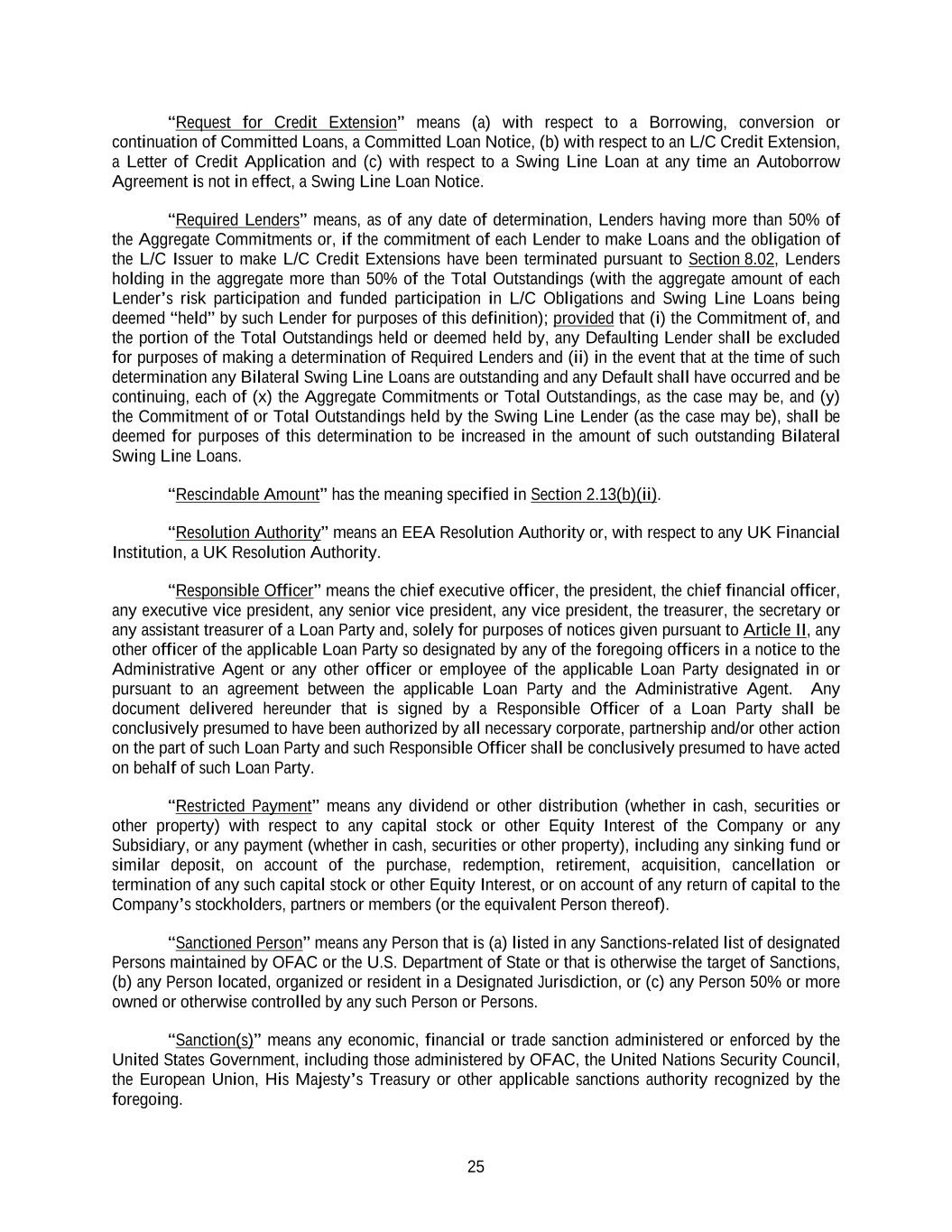 25 “Request for Credit Extension” means (a) with respect to a Borrowing, conversion or continuation of Committed Loans, a Committed Loan Notice, (b) with respect to an L/C Credit Extension, a Letter of Credit Application and (c) with respect to a Swing Line Loan at any time an Autoborrow Agreement is not in effect, a Swing Line Loan Notice. “Required Lenders” means, as of any date of determination, Lenders having more than 50% of the Aggregate Commitments or, if the commitment of each Lender to make Loans and the obligation of the L/C Issuer to make L/C Credit Extensions have been terminated pursuant to Section 8.02, Lenders holding in the aggregate more than 50% of the Total Outstandings (with the aggregate amount of each Lender’s risk participation and funded participation in L/C Obligations and Swing Line Loans being deemed “held” by such Lender for purposes of this definition); provided that (i) the Commitment of, and the portion of the Total Outstandings held or deemed held by, any Defaulting Lender shall be excluded for purposes of making a determination of Required Lenders and (ii) in the event that at the time of such determination any Bilateral Swing Line Loans are outstanding and any Default shall have occurred and be continuing, each of (x) the Aggregate Commitments or Total Outstandings, as the case may be, and (y) the Commitment of or Total Outstandings held by the Swing Line Lender (as the case may be), shall be deemed for purposes of this determination to be increased in the amount of such outstanding Bilateral Swing Line Loans. “Rescindable Amount” has the meaning specified in Section 2.13(b)(ii). “Resolution Authority” means an EEA Resolution Authority or, with respect to any UK Financial Institution, a UK Resolution Authority. “Responsible Officer” means the chief executive officer, the president, the chief financial officer, any executive vice president, any senior vice president, any vice president, the treasurer, the secretary or any assistant treasurer of a Loan Party and, solely for purposes of notices given pursuant to Article II, any other officer of the applicable Loan Party so designated by any of the foregoing officers in a notice to the Administrative Agent or any other officer or employee of the applicable Loan Party designated in or pursuant to an agreement between the applicable Loan Party and the Administrative Agent. Any document delivered hereunder that is signed by a Responsible Officer of a Loan Party shall be conclusively presumed to have been authorized by all necessary corporate, partnership and/or other action on the part of such Loan Party and such Responsible Officer shall be conclusively presumed to have acted on behalf of such Loan Party. “Restricted Payment” means any dividend or other distribution (whether in cash, securities or other property) with respect to any capital stock or other Equity Interest of the Company or any Subsidiary, or any payment (whether in cash, securities or other property), including any sinking fund or similar deposit, on account of the purchase, redemption, retirement, acquisition, cancellation or termination of any such capital stock or other Equity Interest, or on account of any return of capital to the Company’s stockholders, partners or members (or the equivalent Person thereof). “Sanctioned Person” means any Person that is (a) listed in any Sanctions-related list of designated Persons maintained by OFAC or the U.S. Department of State or that is otherwise the target of Sanctions, (b) any Person located, organized or resident in a Designated Jurisdiction, or (c) any Person 50% or more owned or otherwise controlled by any such Person or Persons. “Sanction(s)” means any economic, financial or trade sanction administered or enforced by the United States Government, including those administered by OFAC, the United Nations Security Council, the European Union, His Majesty’s Treasury or other applicable sanctions authority recognized by the foregoing.