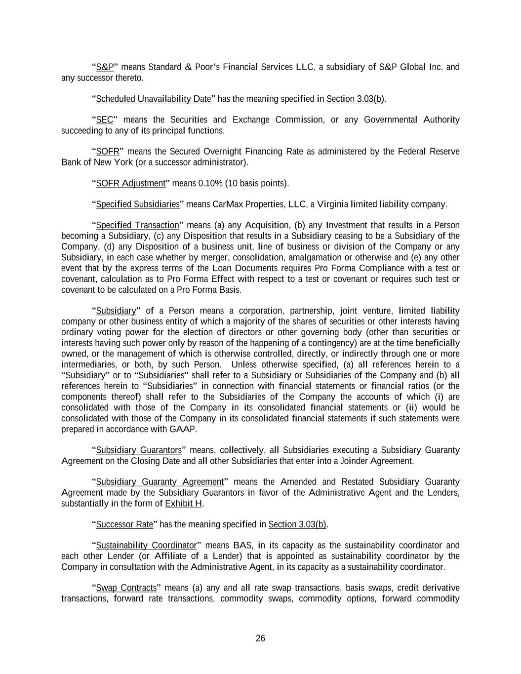 26 “S&P” means Standard & Poor’s Financial Services LLC, a subsidiary of S&P Global Inc. and any successor thereto. “Scheduled Unavailability Date” has the meaning specified in Section 3.03(b). “SEC” means the Securities and Exchange Commission, or any Governmental Authority succeeding to any of its principal functions. “SOFR” means the Secured Overnight Financing Rate as administered by the Federal Reserve Bank of New York (or a successor administrator). “SOFR Adjustment” means 0.10% (10 basis points). “Specified Subsidiaries” means CarMax Properties, LLC, a Virginia limited liability company. “Specified Transaction” means (a) any Acquisition, (b) any Investment that results in a Person becoming a Subsidiary, (c) any Disposition that results in a Subsidiary ceasing to be a Subsidiary of the Company, (d) any Disposition of a business unit, line of business or division of the Company or any Subsidiary, in each case whether by merger, consolidation, amalgamation or otherwise and (e) any other event that by the express terms of the Loan Documents requires Pro Forma Compliance with a test or covenant, calculation as to Pro Forma Effect with respect to a test or covenant or requires such test or covenant to be calculated on a Pro Forma Basis. “Subsidiary” of a Person means a corporation, partnership, joint venture, limited liability company or other business entity of which a majority of the shares of securities or other interests having ordinary voting power for the election of directors or other governing body (other than securities or interests having such power only by reason of the happening of a contingency) are at the time beneficially owned, or the management of which is otherwise controlled, directly, or indirectly through one or more intermediaries, or both, by such Person. Unless otherwise specified, (a) all references herein to a “Subsidiary” or to “Subsidiaries” shall refer to a Subsidiary or Subsidiaries of the Company and (b) all references herein to “Subsidiaries” in connection with financial statements or financial ratios (or the components thereof) shall refer to the Subsidiaries of the Company the accounts of which (i) are consolidated with those of the Company in its consolidated financial statements or (ii) would be consolidated with those of the Company in its consolidated financial statements if such statements were prepared in accordance with GAAP. “Subsidiary Guarantors” means, collectively, all Subsidiaries executing a Subsidiary Guaranty Agreement on the Closing Date and all other Subsidiaries that enter into a Joinder Agreement. “Subsidiary Guaranty Agreement” means the Amended and Restated Subsidiary Guaranty Agreement made by the Subsidiary Guarantors in favor of the Administrative Agent and the Lenders, substantially in the form of Exhibit H. “Successor Rate” has the meaning specified in Section 3.03(b). “Sustainability Coordinator” means BAS, in its capacity as the sustainability coordinator and each other Lender (or Affiliate of a Lender) that is appointed as sustainability coordinator by the Company in consultation with the Administrative Agent, in its capacity as a sustainability coordinator. “Swap Contracts” means (a) any and all rate swap transactions, basis swaps, credit derivative transactions, forward rate transactions, commodity swaps, commodity options, forward commodity