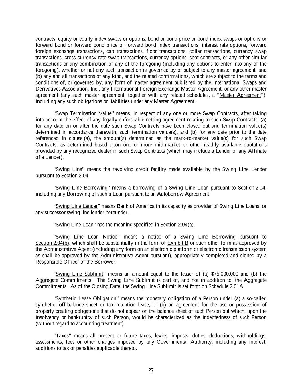 27 contracts, equity or equity index swaps or options, bond or bond price or bond index swaps or options or forward bond or forward bond price or forward bond index transactions, interest rate options, forward foreign exchange transactions, cap transactions, floor transactions, collar transactions, currency swap transactions, cross-currency rate swap transactions, currency options, spot contracts, or any other similar transactions or any combination of any of the foregoing (including any options to enter into any of the foregoing), whether or not any such transaction is governed by or subject to any master agreement, and (b) any and all transactions of any kind, and the related confirmations, which are subject to the terms and conditions of, or governed by, any form of master agreement published by the International Swaps and Derivatives Association, Inc., any International Foreign Exchange Master Agreement, or any other master agreement (any such master agreement, together with any related schedules, a “Master Agreement”), including any such obligations or liabilities under any Master Agreement. “Swap Termination Value” means, in respect of any one or more Swap Contracts, after taking into account the effect of any legally enforceable netting agreement relating to such Swap Contracts, (a) for any date on or after the date such Swap Contracts have been closed out and termination value(s) determined in accordance therewith, such termination value(s), and (b) for any date prior to the date referenced in clause (a), the amount(s) determined as the mark-to-market value(s) for such Swap Contracts, as determined based upon one or more mid-market or other readily available quotations provided by any recognized dealer in such Swap Contracts (which may include a Lender or any Affiliate of a Lender). “Swing Line” means the revolving credit facility made available by the Swing Line Lender pursuant to Section 2.04. “Swing Line Borrowing” means a borrowing of a Swing Line Loan pursuant to Section 2.04, including any Borrowing of such a Loan pursuant to an Autoborrow Agreement. “Swing Line Lender” means Bank of America in its capacity as provider of Swing Line Loans, or any successor swing line lender hereunder. “Swing Line Loan” has the meaning specified in Section 2.04(a). “Swing Line Loan Notice” means a notice of a Swing Line Borrowing pursuant to Section 2.04(b), which shall be substantially in the form of Exhibit B or such other form as approved by the Administrative Agent (including any form on an electronic platform or electronic transmission system as shall be approved by the Administrative Agent pursuant), appropriately completed and signed by a Responsible Officer of the Borrower. “Swing Line Sublimit” means an amount equal to the lesser of (a) $75,000,000 and (b) the Aggregate Commitments. The Swing Line Sublimit is part of, and not in addition to, the Aggregate Commitments. As of the Closing Date, the Swing Line Sublimit is set forth on Schedule 2.01A. “Synthetic Lease Obligation” means the monetary obligation of a Person under (a) a so-called synthetic, off-balance sheet or tax retention lease, or (b) an agreement for the use or possession of property creating obligations that do not appear on the balance sheet of such Person but which, upon the insolvency or bankruptcy of such Person, would be characterized as the indebtedness of such Person (without regard to accounting treatment). “Taxes” means all present or future taxes, levies, imposts, duties, deductions, withholdings, assessments, fees or other charges imposed by any Governmental Authority, including any interest, additions to tax or penalties applicable thereto.