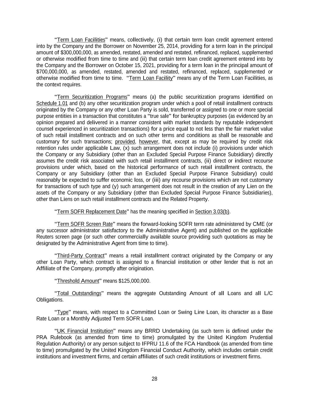 28 “Term Loan Facilities” means, collectively, (i) that certain term loan credit agreement entered into by the Company and the Borrower on November 25, 2014, providing for a term loan in the principal amount of $300,000,000, as amended, restated, amended and restated, refinanced, replaced, supplemented or otherwise modified from time to time and (ii) that certain term loan credit agreement entered into by the Company and the Borrower on October 15, 2021, providing for a term loan in the principal amount of $700,000,000, as amended, restated, amended and restated, refinanced, replaced, supplemented or otherwise modified from time to time. “Term Loan Facility” means any of the Term Loan Facilities, as the context requires. “Term Securitization Programs” means (a) the public securitization programs identified on Schedule 1.01 and (b) any other securitization program under which a pool of retail installment contracts originated by the Company or any other Loan Party is sold, transferred or assigned to one or more special purpose entities in a transaction that constitutes a “true sale” for bankruptcy purposes (as evidenced by an opinion prepared and delivered in a manner consistent with market standards by reputable independent counsel experienced in securitization transactions) for a price equal to not less than the fair market value of such retail installment contracts and on such other terms and conditions as shall be reasonable and customary for such transactions; provided, however, that, except as may be required by credit risk retention rules under applicable Law, (x) such arrangement does not include (i) provisions under which the Company or any Subsidiary (other than an Excluded Special Purpose Finance Subsidiary) directly assumes the credit risk associated with such retail installment contracts, (ii) direct or indirect recourse provisions under which, based on the historical performance of such retail installment contracts, the Company or any Subsidiary (other than an Excluded Special Purpose Finance Subsidiary) could reasonably be expected to suffer economic loss, or (iii) any recourse provisions which are not customary for transactions of such type and (y) such arrangement does not result in the creation of any Lien on the assets of the Company or any Subsidiary (other than Excluded Special Purpose Finance Subsidiaries), other than Liens on such retail installment contracts and the Related Property. “Term SOFR Replacement Date” has the meaning specified in Section 3.03(b). “Term SOFR Screen Rate” means the forward-looking SOFR term rate administered by CME (or any successor administrator satisfactory to the Administrative Agent) and published on the applicable Reuters screen page (or such other commercially available source providing such quotations as may be designated by the Administrative Agent from time to time). “Third-Party Contract” means a retail installment contract originated by the Company or any other Loan Party, which contract is assigned to a financial institution or other lender that is not an Affiliate of the Company, promptly after origination. “Threshold Amount” means $125,000,000. “Total Outstandings” means the aggregate Outstanding Amount of all Loans and all L/C Obligations. “Type” means, with respect to a Committed Loan or Swing Line Loan, its character as a Base Rate Loan or a Monthly Adjusted Term SOFR Loan. “UK Financial Institution” means any BRRD Undertaking (as such term is defined under the PRA Rulebook (as amended from time to time) promulgated by the United Kingdom Prudential Regulation Authority) or any person subject to IFPRU 11.6 of the FCA Handbook (as amended from time to time) promulgated by the United Kingdom Financial Conduct Authority, which includes certain credit institutions and investment firms, and certain affiliates of such credit institutions or investment firms.