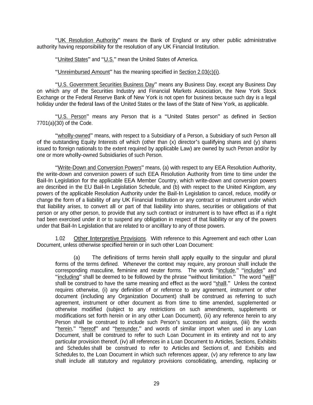 29 “UK Resolution Authority” means the Bank of England or any other public administrative authority having responsibility for the resolution of any UK Financial Institution. “United States” and “U.S.” mean the United States of America. “Unreimbursed Amount” has the meaning specified in Section 2.03(c)(i). “U.S. Government Securities Business Day” means any Business Day, except any Business Day on which any of the Securities Industry and Financial Markets Association, the New York Stock Exchange or the Federal Reserve Bank of New York is not open for business because such day is a legal holiday under the federal laws of the United States or the laws of the State of New York, as applicable. “U.S. Person” means any Person that is a “United States person” as defined in Section 7701(a)(30) of the Code. “wholly-owned” means, with respect to a Subsidiary of a Person, a Subsidiary of such Person all of the outstanding Equity Interests of which (other than (x) director’s qualifying shares and (y) shares issued to foreign nationals to the extent required by applicable Law) are owned by such Person and/or by one or more wholly-owned Subsidiaries of such Person. “Write-Down and Conversion Powers” means, (a) with respect to any EEA Resolution Authority, the write-down and conversion powers of such EEA Resolution Authority from time to time under the Bail-In Legislation for the applicable EEA Member Country, which write-down and conversion powers are described in the EU Bail-In Legislation Schedule, and (b) with respect to the United Kingdom, any powers of the applicable Resolution Authority under the Bail-In Legislation to cancel, reduce, modify or change the form of a liability of any UK Financial Institution or any contract or instrument under which that liability arises, to convert all or part of that liability into shares, securities or obligations of that person or any other person, to provide that any such contract or instrument is to have effect as if a right had been exercised under it or to suspend any obligation in respect of that liability or any of the powers under that Bail-In Legislation that are related to or ancillary to any of those powers. 1.02 Other Interpretive Provisions. With reference to this Agreement and each other Loan Document, unless otherwise specified herein or in such other Loan Document: (a) The definitions of terms herein shall apply equally to the singular and plural forms of the terms defined. Whenever the context may require, any pronoun shall include the corresponding masculine, feminine and neuter forms. The words “include,” “includes” and “including” shall be deemed to be followed by the phrase “without limitation.” The word “will” shall be construed to have the same meaning and effect as the word “shall.” Unless the context requires otherwise, (i) any definition of or reference to any agreement, instrument or other document (including any Organization Document) shall be construed as referring to such agreement, instrument or other document as from time to time amended, supplemented or otherwise modified (subject to any restrictions on such amendments, supplements or modifications set forth herein or in any other Loan Document), (ii) any reference herein to any Person shall be construed to include such Person’s successors and assigns, (iii) the words “herein,” “hereof” and “hereunder,” and words of similar import when used in any Loan Document, shall be construed to refer to such Loan Document in its entirety and not to any particular provision thereof, (iv) all references in a Loan Document to Articles, Sections, Exhibits and Schedules shall be construed to refer to Articles and Sections of, and Exhibits and Schedules to, the Loan Document in which such references appear, (v) any reference to any law shall include all statutory and regulatory provisions consolidating, amending, replacing or