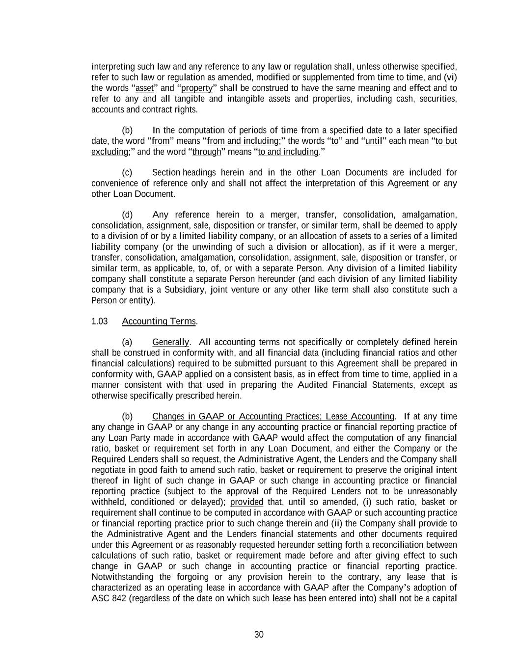 30 interpreting such law and any reference to any law or regulation shall, unless otherwise specified, refer to such law or regulation as amended, modified or supplemented from time to time, and (vi) the words “asset” and “property” shall be construed to have the same meaning and effect and to refer to any and all tangible and intangible assets and properties, including cash, securities, accounts and contract rights. (b) In the computation of periods of time from a specified date to a later specified date, the word “from” means “from and including;” the words “to” and “until” each mean “to but excluding;” and the word “through” means “to and including.” (c) Section headings herein and in the other Loan Documents are included for convenience of reference only and shall not affect the interpretation of this Agreement or any other Loan Document. (d) Any reference herein to a merger, transfer, consolidation, amalgamation, consolidation, assignment, sale, disposition or transfer, or similar term, shall be deemed to apply to a division of or by a limited liability company, or an allocation of assets to a series of a limited liability company (or the unwinding of such a division or allocation), as if it were a merger, transfer, consolidation, amalgamation, consolidation, assignment, sale, disposition or transfer, or similar term, as applicable, to, of, or with a separate Person. Any division of a limited liability company shall constitute a separate Person hereunder (and each division of any limited liability company that is a Subsidiary, joint venture or any other like term shall also constitute such a Person or entity). 1.03 Accounting Terms. (a) Generally. All accounting terms not specifically or completely defined herein shall be construed in conformity with, and all financial data (including financial ratios and other financial calculations) required to be submitted pursuant to this Agreement shall be prepared in conformity with, GAAP applied on a consistent basis, as in effect from time to time, applied in a manner consistent with that used in preparing the Audited Financial Statements, except as otherwise specifically prescribed herein. (b) Changes in GAAP or Accounting Practices; Lease Accounting. If at any time any change in GAAP or any change in any accounting practice or financial reporting practice of any Loan Party made in accordance with GAAP would affect the computation of any financial ratio, basket or requirement set forth in any Loan Document, and either the Company or the Required Lenders shall so request, the Administrative Agent, the Lenders and the Company shall negotiate in good faith to amend such ratio, basket or requirement to preserve the original intent thereof in light of such change in GAAP or such change in accounting practice or financial reporting practice (subject to the approval of the Required Lenders not to be unreasonably withheld, conditioned or delayed); provided that, until so amended, (i) such ratio, basket or requirement shall continue to be computed in accordance with GAAP or such accounting practice or financial reporting practice prior to such change therein and (ii) the Company shall provide to the Administrative Agent and the Lenders financial statements and other documents required under this Agreement or as reasonably requested hereunder setting forth a reconciliation between calculations of such ratio, basket or requirement made before and after giving effect to such change in GAAP or such change in accounting practice or financial reporting practice. Notwithstanding the forgoing or any provision herein to the contrary, any lease that is characterized as an operating lease in accordance with GAAP after the Company’s adoption of ASC 842 (regardless of the date on which such lease has been entered into) shall not be a capital