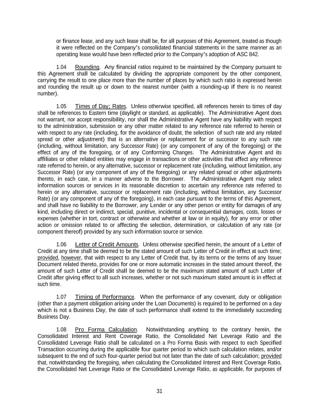 31 or finance lease, and any such lease shall be, for all purposes of this Agreement, treated as though it were reflected on the Company’s consolidated financial statements in the same manner as an operating lease would have been reflected prior to the Company’s adoption of ASC 842. 1.04 Rounding. Any financial ratios required to be maintained by the Company pursuant to this Agreement shall be calculated by dividing the appropriate component by the other component, carrying the result to one place more than the number of places by which such ratio is expressed herein and rounding the result up or down to the nearest number (with a rounding-up if there is no nearest number). 1.05 Times of Day; Rates. Unless otherwise specified, all references herein to times of day shall be references to Eastern time (daylight or standard, as applicable). The Administrative Agent does not warrant, nor accept responsibility, nor shall the Administrative Agent have any liability with respect to the administration, submission or any other matter related to any reference rate referred to herein or with respect to any rate (including, for the avoidance of doubt, the selection of such rate and any related spread or other adjustment) that is an alternative or replacement for or successor to any such rate (including, without limitation, any Successor Rate) (or any component of any of the foregoing) or the effect of any of the foregoing, or of any Conforming Changes. The Administrative Agent and its affiliates or other related entities may engage in transactions or other activities that affect any reference rate referred to herein, or any alternative, successor or replacement rate (including, without limitation, any Successor Rate) (or any component of any of the foregoing) or any related spread or other adjustments thereto, in each case, in a manner adverse to the Borrower. The Administrative Agent may select information sources or services in its reasonable discretion to ascertain any reference rate referred to herein or any alternative, successor or replacement rate (including, without limitation, any Successor Rate) (or any component of any of the foregoing), in each case pursuant to the terms of this Agreement, and shall have no liability to the Borrower, any Lender or any other person or entity for damages of any kind, including direct or indirect, special, punitive, incidental or consequential damages, costs, losses or expenses (whether in tort, contract or otherwise and whether at law or in equity), for any error or other action or omission related to or affecting the selection, determination, or calculation of any rate (or component thereof) provided by any such information source or service. 1.06 Letter of Credit Amounts. Unless otherwise specified herein, the amount of a Letter of Credit at any time shall be deemed to be the stated amount of such Letter of Credit in effect at such time; provided, however, that with respect to any Letter of Credit that, by its terms or the terms of any Issuer Document related thereto, provides for one or more automatic increases in the stated amount thereof, the amount of such Letter of Credit shall be deemed to be the maximum stated amount of such Letter of Credit after giving effect to all such increases, whether or not such maximum stated amount is in effect at such time. 1.07 Timing of Performance. When the performance of any covenant, duty or obligation (other than a payment obligation arising under the Loan Documents) is required to be performed on a day which is not a Business Day, the date of such performance shall extend to the immediately succeeding Business Day. 1.08 Pro Forma Calculation. Notwithstanding anything to the contrary herein, the Consolidated Interest and Rent Coverage Ratio, the Consolidated Net Leverage Ratio and the Consolidated Leverage Ratio shall be calculated on a Pro Forma Basis with respect to each Specified Transaction occurring during the applicable four quarter period to which such calculation relates, and/or subsequent to the end of such four-quarter period but not later than the date of such calculation; provided that, notwithstanding the foregoing, when calculating the Consolidated Interest and Rent Coverage Ratio, the Consolidated Net Leverage Ratio or the Consolidated Leverage Ratio, as applicable, for purposes of