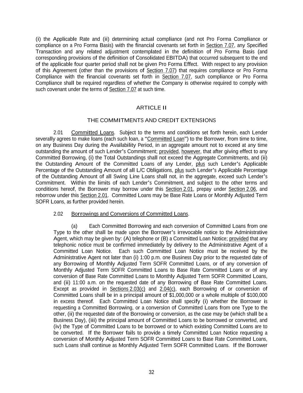 32 (i) the Applicable Rate and (ii) determining actual compliance (and not Pro Forma Compliance or compliance on a Pro Forma Basis) with the financial covenants set forth in Section 7.07, any Specified Transaction and any related adjustment contemplated in the definition of Pro Forma Basis (and corresponding provisions of the definition of Consolidated EBITDA) that occurred subsequent to the end of the applicable four quarter period shall not be given Pro Forma Effect. With respect to any provision of this Agreement (other than the provisions of Section 7.07) that requires compliance or Pro Forma Compliance with the financial covenants set forth in Section 7.07, such compliance or Pro Forma Compliance shall be required regardless of whether the Company is otherwise required to comply with such covenant under the terms of Section 7.07 at such time. ARTICLE II THE COMMITMENTS AND CREDIT EXTENSIONS 2.01 Committed Loans. Subject to the terms and conditions set forth herein, each Lender severally agrees to make loans (each such loan, a “Committed Loan”) to the Borrower, from time to time, on any Business Day during the Availability Period, in an aggregate amount not to exceed at any time outstanding the amount of such Lender’s Commitment; provided, however, that after giving effect to any Committed Borrowing, (i) the Total Outstandings shall not exceed the Aggregate Commitments, and (ii) the Outstanding Amount of the Committed Loans of any Lender, plus such Lender’s Applicable Percentage of the Outstanding Amount of all L/C Obligations, plus such Lender’s Applicable Percentage of the Outstanding Amount of all Swing Line Loans shall not, in the aggregate, exceed such Lender’s Commitment. Within the limits of each Lender’s Commitment, and subject to the other terms and conditions hereof, the Borrower may borrow under this Section 2.01, prepay under Section 2.06, and reborrow under this Section 2.01. Committed Loans may be Base Rate Loans or Monthly Adjusted Term SOFR Loans, as further provided herein. 2.02 Borrowings and Conversions of Committed Loans. (a) Each Committed Borrowing and each conversion of Committed Loans from one Type to the other shall be made upon the Borrower’s irrevocable notice to the Administrative Agent, which may be given by: (A) telephone or (B) a Committed Loan Notice; provided that any telephonic notice must be confirmed immediately by delivery to the Administrative Agent of a Committed Loan Notice. Each such Committed Loan Notice must be received by the Administrative Agent not later than (i) 1:00 p.m. one Business Day prior to the requested date of any Borrowing of Monthly Adjusted Term SOFR Committed Loans, or of any conversion of Monthly Adjusted Term SOFR Committed Loans to Base Rate Committed Loans or of any conversion of Base Rate Committed Loans to Monthly Adjusted Term SOFR Committed Loans, and (ii) 11:00 a.m. on the requested date of any Borrowing of Base Rate Committed Loans. Except as provided in Sections 2.03(c) and 2.04(c), each Borrowing of or conversion of Committed Loans shall be in a principal amount of $1,000,000 or a whole multiple of $100,000 in excess thereof. Each Committed Loan Notice shall specify (i) whether the Borrower is requesting a Committed Borrowing, or a conversion of Committed Loans from one Type to the other, (ii) the requested date of the Borrowing or conversion, as the case may be (which shall be a Business Day), (iii) the principal amount of Committed Loans to be borrowed or converted, and (iv) the Type of Committed Loans to be borrowed or to which existing Committed Loans are to be converted. If the Borrower fails to provide a timely Committed Loan Notice requesting a conversion of Monthly Adjusted Term SOFR Committed Loans to Base Rate Committed Loans, such Loans shall continue as Monthly Adjusted Term SOFR Committed Loans. If the Borrower
