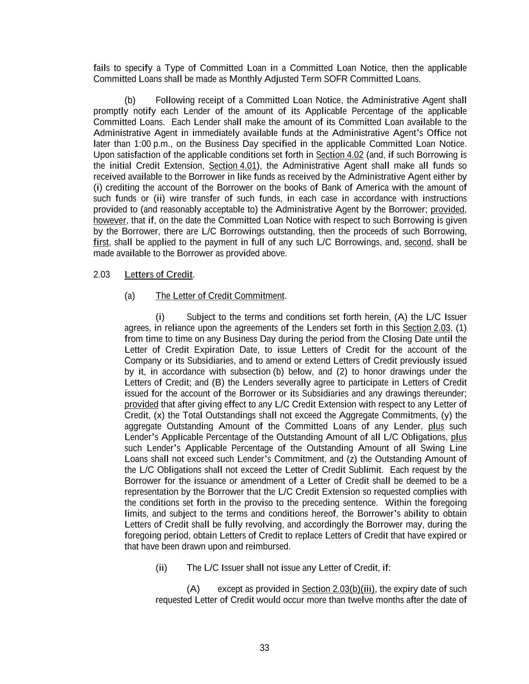 33 fails to specify a Type of Committed Loan in a Committed Loan Notice, then the applicable Committed Loans shall be made as Monthly Adjusted Term SOFR Committed Loans. (b) Following receipt of a Committed Loan Notice, the Administrative Agent shall promptly notify each Lender of the amount of its Applicable Percentage of the applicable Committed Loans. Each Lender shall make the amount of its Committed Loan available to the Administrative Agent in immediately available funds at the Administrative Agent’s Office not later than 1:00 p.m., on the Business Day specified in the applicable Committed Loan Notice. Upon satisfaction of the applicable conditions set forth in Section 4.02 (and, if such Borrowing is the initial Credit Extension, Section 4.01), the Administrative Agent shall make all funds so received available to the Borrower in like funds as received by the Administrative Agent either by (i) crediting the account of the Borrower on the books of Bank of America with the amount of such funds or (ii) wire transfer of such funds, in each case in accordance with instructions provided to (and reasonably acceptable to) the Administrative Agent by the Borrower; provided, however, that if, on the date the Committed Loan Notice with respect to such Borrowing is given by the Borrower, there are L/C Borrowings outstanding, then the proceeds of such Borrowing, first, shall be applied to the payment in full of any such L/C Borrowings, and, second, shall be made available to the Borrower as provided above. 2.03 Letters of Credit. (a) The Letter of Credit Commitment. (i) Subject to the terms and conditions set forth herein, (A) the L/C Issuer agrees, in reliance upon the agreements of the Lenders set forth in this Section 2.03, (1) from time to time on any Business Day during the period from the Closing Date until the Letter of Credit Expiration Date, to issue Letters of Credit for the account of the Company or its Subsidiaries, and to amend or extend Letters of Credit previously issued by it, in accordance with subsection (b) below, and (2) to honor drawings under the Letters of Credit; and (B) the Lenders severally agree to participate in Letters of Credit issued for the account of the Borrower or its Subsidiaries and any drawings thereunder; provided that after giving effect to any L/C Credit Extension with respect to any Letter of Credit, (x) the Total Outstandings shall not exceed the Aggregate Commitments, (y) the aggregate Outstanding Amount of the Committed Loans of any Lender, plus such Lender’s Applicable Percentage of the Outstanding Amount of all L/C Obligations, plus such Lender’s Applicable Percentage of the Outstanding Amount of all Swing Line Loans shall not exceed such Lender’s Commitment, and (z) the Outstanding Amount of the L/C Obligations shall not exceed the Letter of Credit Sublimit. Each request by the Borrower for the issuance or amendment of a Letter of Credit shall be deemed to be a representation by the Borrower that the L/C Credit Extension so requested complies with the conditions set forth in the proviso to the preceding sentence. Within the foregoing limits, and subject to the terms and conditions hereof, the Borrower’s ability to obtain Letters of Credit shall be fully revolving, and accordingly the Borrower may, during the foregoing period, obtain Letters of Credit to replace Letters of Credit that have expired or that have been drawn upon and reimbursed. (ii) The L/C Issuer shall not issue any Letter of Credit, if: (A) except as provided in Section 2.03(b)(iii), the expiry date of such requested Letter of Credit would occur more than twelve months after the date of