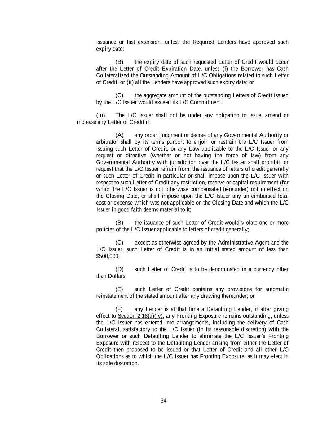 34 issuance or last extension, unless the Required Lenders have approved such expiry date; (B) the expiry date of such requested Letter of Credit would occur after the Letter of Credit Expiration Date, unless (i) the Borrower has Cash Collateralized the Outstanding Amount of L/C Obligations related to such Letter of Credit, or (ii) all the Lenders have approved such expiry date; or (C) the aggregate amount of the outstanding Letters of Credit issued by the L/C Issuer would exceed its L/C Commitment. (iii) The L/C Issuer shall not be under any obligation to issue, amend or increase any Letter of Credit if: (A) any order, judgment or decree of any Governmental Authority or arbitrator shall by its terms purport to enjoin or restrain the L/C Issuer from issuing such Letter of Credit, or any Law applicable to the L/C Issuer or any request or directive (whether or not having the force of law) from any Governmental Authority with jurisdiction over the L/C Issuer shall prohibit, or request that the L/C Issuer refrain from, the issuance of letters of credit generally or such Letter of Credit in particular or shall impose upon the L/C Issuer with respect to such Letter of Credit any restriction, reserve or capital requirement (for which the L/C Issuer is not otherwise compensated hereunder) not in effect on the Closing Date, or shall impose upon the L/C Issuer any unreimbursed loss, cost or expense which was not applicable on the Closing Date and which the L/C Issuer in good faith deems material to it; (B) the issuance of such Letter of Credit would violate one or more policies of the L/C Issuer applicable to letters of credit generally; (C) except as otherwise agreed by the Administrative Agent and the L/C Issuer, such Letter of Credit is in an initial stated amount of less than $500,000; (D) such Letter of Credit is to be denominated in a currency other than Dollars; (E) such Letter of Credit contains any provisions for automatic reinstatement of the stated amount after any drawing thereunder; or (F) any Lender is at that time a Defaulting Lender, if after giving effect to Section 2.18(a)(iv), any Fronting Exposure remains outstanding, unless the L/C Issuer has entered into arrangements, including the delivery of Cash Collateral, satisfactory to the L/C Issuer (in its reasonable discretion) with the Borrower or such Defaulting Lender to eliminate the L/C Issuer’s Fronting Exposure with respect to the Defaulting Lender arising from either the Letter of Credit then proposed to be issued or that Letter of Credit and all other L/C Obligations as to which the L/C Issuer has Fronting Exposure, as it may elect in its sole discretion.