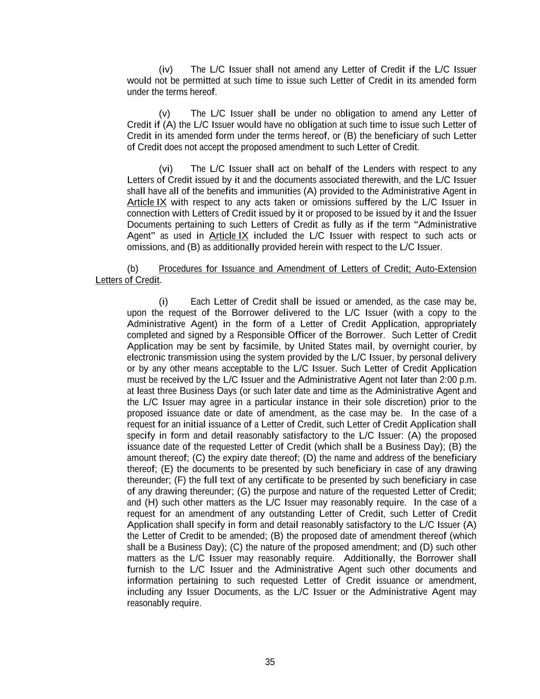 35 (iv) The L/C Issuer shall not amend any Letter of Credit if the L/C Issuer would not be permitted at such time to issue such Letter of Credit in its amended form under the terms hereof. (v) The L/C Issuer shall be under no obligation to amend any Letter of Credit if (A) the L/C Issuer would have no obligation at such time to issue such Letter of Credit in its amended form under the terms hereof, or (B) the beneficiary of such Letter of Credit does not accept the proposed amendment to such Letter of Credit. (vi) The L/C Issuer shall act on behalf of the Lenders with respect to any Letters of Credit issued by it and the documents associated therewith, and the L/C Issuer shall have all of the benefits and immunities (A) provided to the Administrative Agent in Article IX with respect to any acts taken or omissions suffered by the L/C Issuer in connection with Letters of Credit issued by it or proposed to be issued by it and the Issuer Documents pertaining to such Letters of Credit as fully as if the term “Administrative Agent” as used in Article IX included the L/C Issuer with respect to such acts or omissions, and (B) as additionally provided herein with respect to the L/C Issuer. (b) Procedures for Issuance and Amendment of Letters of Credit; Auto-Extension Letters of Credit. (i) Each Letter of Credit shall be issued or amended, as the case may be, upon the request of the Borrower delivered to the L/C Issuer (with a copy to the Administrative Agent) in the form of a Letter of Credit Application, appropriately completed and signed by a Responsible Officer of the Borrower. Such Letter of Credit Application may be sent by facsimile, by United States mail, by overnight courier, by electronic transmission using the system provided by the L/C Issuer, by personal delivery or by any other means acceptable to the L/C Issuer. Such Letter of Credit Application must be received by the L/C Issuer and the Administrative Agent not later than 2:00 p.m. at least three Business Days (or such later date and time as the Administrative Agent and the L/C Issuer may agree in a particular instance in their sole discretion) prior to the proposed issuance date or date of amendment, as the case may be. In the case of a request for an initial issuance of a Letter of Credit, such Letter of Credit Application shall specify in form and detail reasonably satisfactory to the L/C Issuer: (A) the proposed issuance date of the requested Letter of Credit (which shall be a Business Day); (B) the amount thereof; (C) the expiry date thereof; (D) the name and address of the beneficiary thereof; (E) the documents to be presented by such beneficiary in case of any drawing thereunder; (F) the full text of any certificate to be presented by such beneficiary in case of any drawing thereunder; (G) the purpose and nature of the requested Letter of Credit; and (H) such other matters as the L/C Issuer may reasonably require. In the case of a request for an amendment of any outstanding Letter of Credit, such Letter of Credit Application shall specify in form and detail reasonably satisfactory to the L/C Issuer (A) the Letter of Credit to be amended; (B) the proposed date of amendment thereof (which shall be a Business Day); (C) the nature of the proposed amendment; and (D) such other matters as the L/C Issuer may reasonably require. Additionally, the Borrower shall furnish to the L/C Issuer and the Administrative Agent such other documents and information pertaining to such requested Letter of Credit issuance or amendment, including any Issuer Documents, as the L/C Issuer or the Administrative Agent may reasonably require.