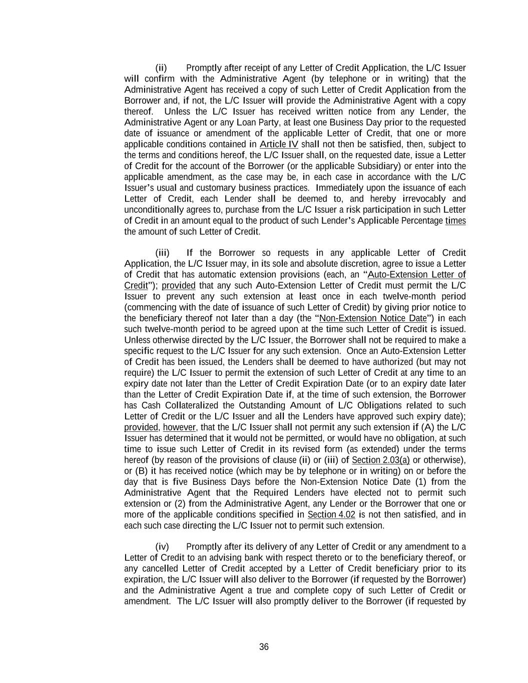 36 (ii) Promptly after receipt of any Letter of Credit Application, the L/C Issuer will confirm with the Administrative Agent (by telephone or in writing) that the Administrative Agent has received a copy of such Letter of Credit Application from the Borrower and, if not, the L/C Issuer will provide the Administrative Agent with a copy thereof. Unless the L/C Issuer has received written notice from any Lender, the Administrative Agent or any Loan Party, at least one Business Day prior to the requested date of issuance or amendment of the applicable Letter of Credit, that one or more applicable conditions contained in Article IV shall not then be satisfied, then, subject to the terms and conditions hereof, the L/C Issuer shall, on the requested date, issue a Letter of Credit for the account of the Borrower (or the applicable Subsidiary) or enter into the applicable amendment, as the case may be, in each case in accordance with the L/C Issuer’s usual and customary business practices. Immediately upon the issuance of each Letter of Credit, each Lender shall be deemed to, and hereby irrevocably and unconditionally agrees to, purchase from the L/C Issuer a risk participation in such Letter of Credit in an amount equal to the product of such Lender’s Applicable Percentage times the amount of such Letter of Credit. (iii) If the Borrower so requests in any applicable Letter of Credit Application, the L/C Issuer may, in its sole and absolute discretion, agree to issue a Letter of Credit that has automatic extension provisions (each, an “Auto-Extension Letter of Credit”); provided that any such Auto-Extension Letter of Credit must permit the L/C Issuer to prevent any such extension at least once in each twelve-month period (commencing with the date of issuance of such Letter of Credit) by giving prior notice to the beneficiary thereof not later than a day (the “Non-Extension Notice Date”) in each such twelve-month period to be agreed upon at the time such Letter of Credit is issued. Unless otherwise directed by the L/C Issuer, the Borrower shall not be required to make a specific request to the L/C Issuer for any such extension. Once an Auto-Extension Letter of Credit has been issued, the Lenders shall be deemed to have authorized (but may not require) the L/C Issuer to permit the extension of such Letter of Credit at any time to an expiry date not later than the Letter of Credit Expiration Date (or to an expiry date later than the Letter of Credit Expiration Date if, at the time of such extension, the Borrower has Cash Collateralized the Outstanding Amount of L/C Obligations related to such Letter of Credit or the L/C Issuer and all the Lenders have approved such expiry date); provided, however, that the L/C Issuer shall not permit any such extension if (A) the L/C Issuer has determined that it would not be permitted, or would have no obligation, at such time to issue such Letter of Credit in its revised form (as extended) under the terms hereof (by reason of the provisions of clause (ii) or (iii) of Section 2.03(a) or otherwise), or (B) it has received notice (which may be by telephone or in writing) on or before the day that is five Business Days before the Non-Extension Notice Date (1) from the Administrative Agent that the Required Lenders have elected not to permit such extension or (2) from the Administrative Agent, any Lender or the Borrower that one or more of the applicable conditions specified in Section 4.02 is not then satisfied, and in each such case directing the L/C Issuer not to permit such extension. (iv) Promptly after its delivery of any Letter of Credit or any amendment to a Letter of Credit to an advising bank with respect thereto or to the beneficiary thereof, or any cancelled Letter of Credit accepted by a Letter of Credit beneficiary prior to its expiration, the L/C Issuer will also deliver to the Borrower (if requested by the Borrower) and the Administrative Agent a true and complete copy of such Letter of Credit or amendment. The L/C Issuer will also promptly deliver to the Borrower (if requested by