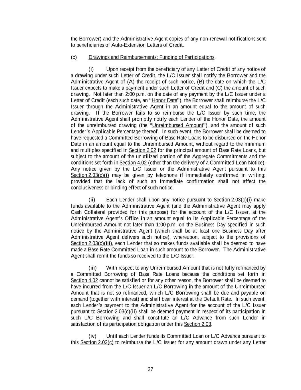 37 the Borrower) and the Administrative Agent copies of any non-renewal notifications sent to beneficiaries of Auto-Extension Letters of Credit. (c) Drawings and Reimbursements; Funding of Participations. (i) Upon receipt from the beneficiary of any Letter of Credit of any notice of a drawing under such Letter of Credit, the L/C Issuer shall notify the Borrower and the Administrative Agent of (A) the receipt of such notice, (B) the date on which the L/C Issuer expects to make a payment under such Letter of Credit and (C) the amount of such drawing. Not later than 2:00 p.m. on the date of any payment by the L/C Issuer under a Letter of Credit (each such date, an “Honor Date”), the Borrower shall reimburse the L/C Issuer through the Administrative Agent in an amount equal to the amount of such drawing. If the Borrower fails to so reimburse the L/C Issuer by such time, the Administrative Agent shall promptly notify each Lender of the Honor Date, the amount of the unreimbursed drawing (the “Unreimbursed Amount”), and the amount of such Lender’s Applicable Percentage thereof. In such event, the Borrower shall be deemed to have requested a Committed Borrowing of Base Rate Loans to be disbursed on the Honor Date in an amount equal to the Unreimbursed Amount, without regard to the minimum and multiples specified in Section 2.02 for the principal amount of Base Rate Loans, but subject to the amount of the unutilized portion of the Aggregate Commitments and the conditions set forth in Section 4.02 (other than the delivery of a Committed Loan Notice). Any notice given by the L/C Issuer or the Administrative Agent pursuant to this Section 2.03(c)(i) may be given by telephone if immediately confirmed in writing; provided that the lack of such an immediate confirmation shall not affect the conclusiveness or binding effect of such notice. (ii) Each Lender shall upon any notice pursuant to Section 2.03(c)(i) make funds available to the Administrative Agent (and the Administrative Agent may apply Cash Collateral provided for this purpose) for the account of the L/C Issuer, at the Administrative Agent’s Office in an amount equal to its Applicable Percentage of the Unreimbursed Amount not later than 1:00 p.m. on the Business Day specified in such notice by the Administrative Agent (which shall be at least one Business Day after Administrative Agent delivers such notice), whereupon, subject to the provisions of Section 2.03(c)(iii), each Lender that so makes funds available shall be deemed to have made a Base Rate Committed Loan in such amount to the Borrower. The Administrative Agent shall remit the funds so received to the L/C Issuer. (iii) With respect to any Unreimbursed Amount that is not fully refinanced by a Committed Borrowing of Base Rate Loans because the conditions set forth in Section 4.02 cannot be satisfied or for any other reason, the Borrower shall be deemed to have incurred from the L/C Issuer an L/C Borrowing in the amount of the Unreimbursed Amount that is not so refinanced, which L/C Borrowing shall be due and payable on demand (together with interest) and shall bear interest at the Default Rate. In such event, each Lender’s payment to the Administrative Agent for the account of the L/C Issuer pursuant to Section 2.03(c)(ii) shall be deemed payment in respect of its participation in such L/C Borrowing and shall constitute an L/C Advance from such Lender in satisfaction of its participation obligation under this Section 2.03. (iv) Until each Lender funds its Committed Loan or L/C Advance pursuant to this Section 2.03(c) to reimburse the L/C Issuer for any amount drawn under any Letter