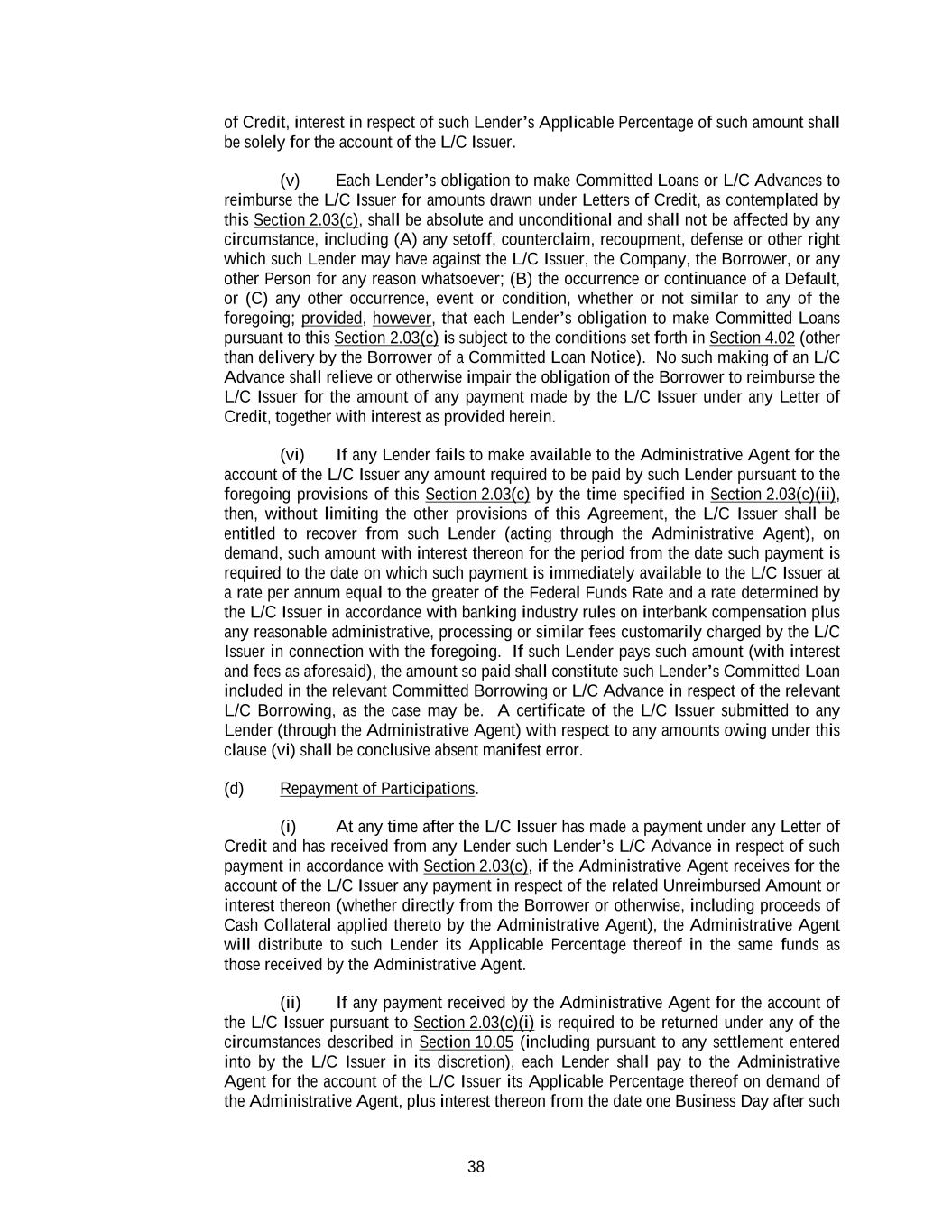 38 of Credit, interest in respect of such Lender’s Applicable Percentage of such amount shall be solely for the account of the L/C Issuer. (v) Each Lender’s obligation to make Committed Loans or L/C Advances to reimburse the L/C Issuer for amounts drawn under Letters of Credit, as contemplated by this Section 2.03(c), shall be absolute and unconditional and shall not be affected by any circumstance, including (A) any setoff, counterclaim, recoupment, defense or other right which such Lender may have against the L/C Issuer, the Company, the Borrower, or any other Person for any reason whatsoever; (B) the occurrence or continuance of a Default, or (C) any other occurrence, event or condition, whether or not similar to any of the foregoing; provided, however, that each Lender’s obligation to make Committed Loans pursuant to this Section 2.03(c) is subject to the conditions set forth in Section 4.02 (other than delivery by the Borrower of a Committed Loan Notice). No such making of an L/C Advance shall relieve or otherwise impair the obligation of the Borrower to reimburse the L/C Issuer for the amount of any payment made by the L/C Issuer under any Letter of Credit, together with interest as provided herein. (vi) If any Lender fails to make available to the Administrative Agent for the account of the L/C Issuer any amount required to be paid by such Lender pursuant to the foregoing provisions of this Section 2.03(c) by the time specified in Section 2.03(c)(ii), then, without limiting the other provisions of this Agreement, the L/C Issuer shall be entitled to recover from such Lender (acting through the Administrative Agent), on demand, such amount with interest thereon for the period from the date such payment is required to the date on which such payment is immediately available to the L/C Issuer at a rate per annum equal to the greater of the Federal Funds Rate and a rate determined by the L/C Issuer in accordance with banking industry rules on interbank compensation plus any reasonable administrative, processing or similar fees customarily charged by the L/C Issuer in connection with the foregoing. If such Lender pays such amount (with interest and fees as aforesaid), the amount so paid shall constitute such Lender’s Committed Loan included in the relevant Committed Borrowing or L/C Advance in respect of the relevant L/C Borrowing, as the case may be. A certificate of the L/C Issuer submitted to any Lender (through the Administrative Agent) with respect to any amounts owing under this clause (vi) shall be conclusive absent manifest error. (d) Repayment of Participations. (i) At any time after the L/C Issuer has made a payment under any Letter of Credit and has received from any Lender such Lender’s L/C Advance in respect of such payment in accordance with Section 2.03(c), if the Administrative Agent receives for the account of the L/C Issuer any payment in respect of the related Unreimbursed Amount or interest thereon (whether directly from the Borrower or otherwise, including proceeds of Cash Collateral applied thereto by the Administrative Agent), the Administrative Agent will distribute to such Lender its Applicable Percentage thereof in the same funds as those received by the Administrative Agent. (ii) If any payment received by the Administrative Agent for the account of the L/C Issuer pursuant to Section 2.03(c)(i) is required to be returned under any of the circumstances described in Section 10.05 (including pursuant to any settlement entered into by the L/C Issuer in its discretion), each Lender shall pay to the Administrative Agent for the account of the L/C Issuer its Applicable Percentage thereof on demand of the Administrative Agent, plus interest thereon from the date one Business Day after such