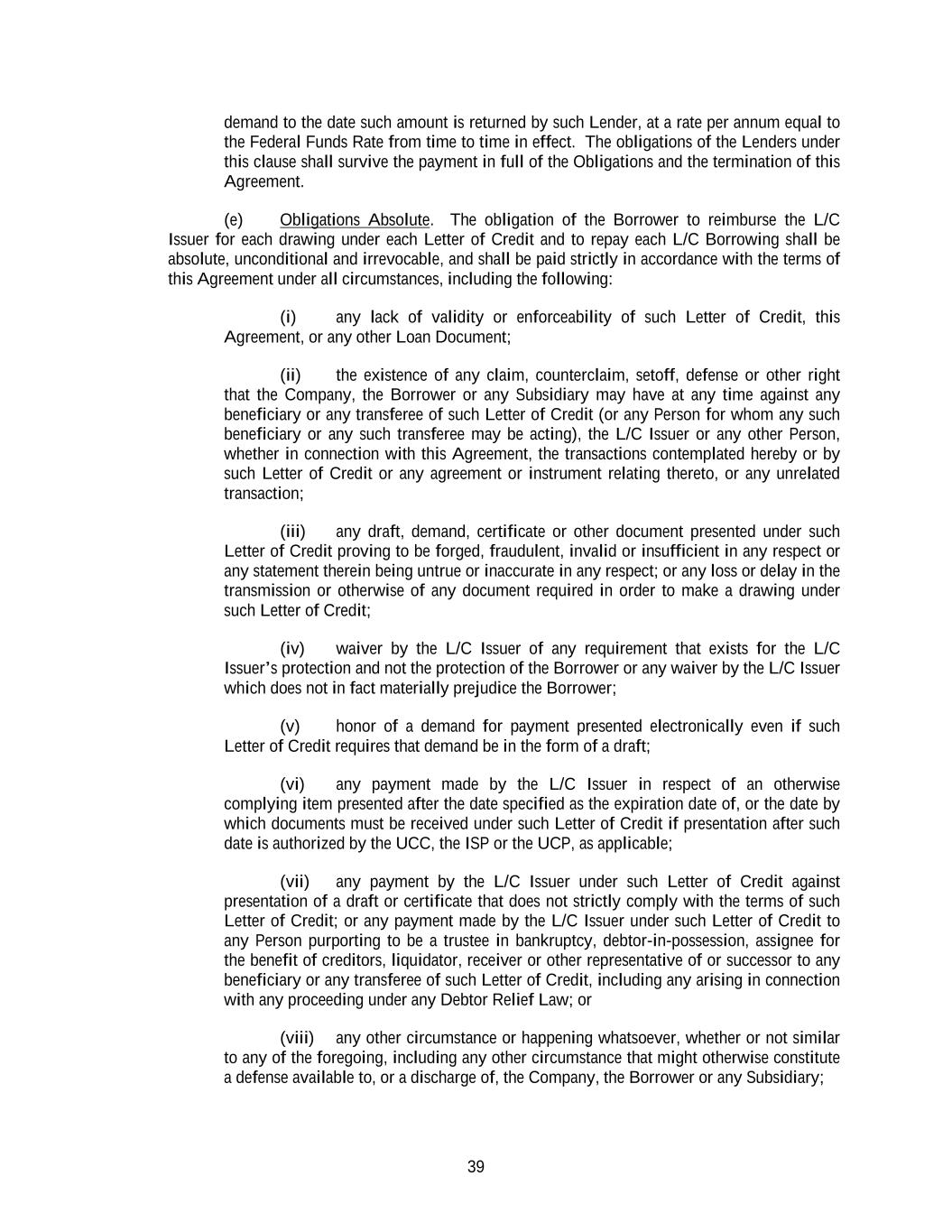 39 demand to the date such amount is returned by such Lender, at a rate per annum equal to the Federal Funds Rate from time to time in effect. The obligations of the Lenders under this clause shall survive the payment in full of the Obligations and the termination of this Agreement. (e) Obligations Absolute. The obligation of the Borrower to reimburse the L/C Issuer for each drawing under each Letter of Credit and to repay each L/C Borrowing shall be absolute, unconditional and irrevocable, and shall be paid strictly in accordance with the terms of this Agreement under all circumstances, including the following: (i) any lack of validity or enforceability of such Letter of Credit, this Agreement, or any other Loan Document; (ii) the existence of any claim, counterclaim, setoff, defense or other right that the Company, the Borrower or any Subsidiary may have at any time against any beneficiary or any transferee of such Letter of Credit (or any Person for whom any such beneficiary or any such transferee may be acting), the L/C Issuer or any other Person, whether in connection with this Agreement, the transactions contemplated hereby or by such Letter of Credit or any agreement or instrument relating thereto, or any unrelated transaction; (iii) any draft, demand, certificate or other document presented under such Letter of Credit proving to be forged, fraudulent, invalid or insufficient in any respect or any statement therein being untrue or inaccurate in any respect; or any loss or delay in the transmission or otherwise of any document required in order to make a drawing under such Letter of Credit; (iv) waiver by the L/C Issuer of any requirement that exists for the L/C Issuer’s protection and not the protection of the Borrower or any waiver by the L/C Issuer which does not in fact materially prejudice the Borrower; (v) honor of a demand for payment presented electronically even if such Letter of Credit requires that demand be in the form of a draft; (vi) any payment made by the L/C Issuer in respect of an otherwise complying item presented after the date specified as the expiration date of, or the date by which documents must be received under such Letter of Credit if presentation after such date is authorized by the UCC, the ISP or the UCP, as applicable; (vii) any payment by the L/C Issuer under such Letter of Credit against presentation of a draft or certificate that does not strictly comply with the terms of such Letter of Credit; or any payment made by the L/C Issuer under such Letter of Credit to any Person purporting to be a trustee in bankruptcy, debtor-in-possession, assignee for the benefit of creditors, liquidator, receiver or other representative of or successor to any beneficiary or any transferee of such Letter of Credit, including any arising in connection with any proceeding under any Debtor Relief Law; or (viii) any other circumstance or happening whatsoever, whether or not similar to any of the foregoing, including any other circumstance that might otherwise constitute a defense available to, or a discharge of, the Company, the Borrower or any Subsidiary;