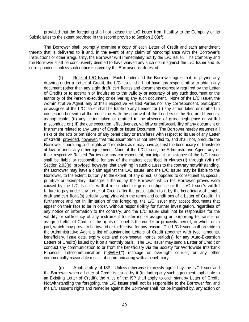 40 provided that the foregoing shall not excuse the L/C Issuer from liability to the Company or its Subsidiaries to the extent provided in the second proviso to Section 2.03(f). The Borrower shall promptly examine a copy of each Letter of Credit and each amendment thereto that is delivered to it and, in the event of any claim of noncompliance with the Borrower’s instructions or other irregularity, the Borrower will immediately notify the L/C Issuer. The Company and the Borrower shall be conclusively deemed to have waived any such claim against the L/C Issuer and its correspondents unless such notice is given by the Borrower as aforesaid. (f) Role of L/C Issuer. Each Lender and the Borrower agree that, in paying any drawing under a Letter of Credit, the L/C Issuer shall not have any responsibility to obtain any document (other than any sight draft, certificates and documents expressly required by the Letter of Credit) or to ascertain or inquire as to the validity or accuracy of any such document or the authority of the Person executing or delivering any such document. None of the L/C Issuer, the Administrative Agent, any of their respective Related Parties nor any correspondent, participant or assignee of the L/C Issuer shall be liable to any Lender for (i) any action taken or omitted in connection herewith at the request or with the approval of the Lenders or the Required Lenders, as applicable; (ii) any action taken or omitted in the absence of gross negligence or willful misconduct; or (iii) the due execution, effectiveness, validity or enforceability of any document or instrument related to any Letter of Credit or Issuer Document. The Borrower hereby assumes all risks of the acts or omissions of any beneficiary or transferee with respect to its use of any Letter of Credit; provided, however, that this assumption is not intended to, and shall not, preclude the Borrower’s pursuing such rights and remedies as it may have against the beneficiary or transferee at law or under any other agreement. None of the L/C Issuer, the Administrative Agent, any of their respective Related Parties nor any correspondent, participant or assignee of the L/C Issuer shall be liable or responsible for any of the matters described in clauses (i) through (viii) of Section 2.03(e); provided, however, that anything in such clauses to the contrary notwithstanding, the Borrower may have a claim against the L/C Issuer, and the L/C Issuer may be liable to the Borrower, to the extent, but only to the extent, of any direct, as opposed to consequential, special, punitive or exemplary, damages suffered by the Borrower which the Borrower proves were caused by the L/C Issuer’s willful misconduct or gross negligence or the L/C Issuer’s willful failure to pay under any Letter of Credit after the presentation to it by the beneficiary of a sight draft and certificate(s) strictly complying with the terms and conditions of a Letter of Credit. In furtherance and not in limitation of the foregoing, the L/C Issuer may accept documents that appear on their face to be in order, without responsibility for further investigation, regardless of any notice or information to the contrary, and the L/C Issuer shall not be responsible for the validity or sufficiency of any instrument transferring or assigning or purporting to transfer or assign a Letter of Credit or the rights or benefits thereunder or proceeds thereof, in whole or in part, which may prove to be invalid or ineffective for any reason. The L/C Issuer shall provide to the Administrative Agent a list of outstanding Letters of Credit (together with type, amounts, beneficiary, issue date, expiry date and non-renewal notice period(s) for any Auto-Extension Letters of Credit)) issued by it on a monthly basis. The L/C Issuer may send a Letter of Credit or conduct any communication to or from the beneficiary via the Society for Worldwide Interbank Financial Telecommunication (“SWIFT”) message or overnight courier, or any other commercially reasonable means of communicating with a beneficiary. (g) Applicability of ISP. Unless otherwise expressly agreed by the L/C Issuer and the Borrower when a Letter of Credit is issued by it (including any such agreement applicable to an Existing Letter of Credit), the rules of the ISP shall apply to each standby Letter of Credit. Notwithstanding the foregoing, the L/C Issuer shall not be responsible to the Borrower for, and the L/C Issuer’s rights and remedies against the Borrower shall not be impaired by, any action or