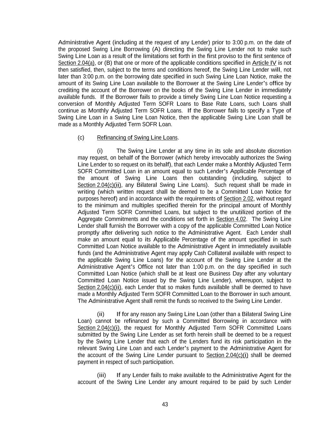 43 Administrative Agent (including at the request of any Lender) prior to 3:00 p.m. on the date of the proposed Swing Line Borrowing (A) directing the Swing Line Lender not to make such Swing Line Loan as a result of the limitations set forth in the first proviso to the first sentence of Section 2.04(a), or (B) that one or more of the applicable conditions specified in Article IV is not then satisfied, then, subject to the terms and conditions hereof, the Swing Line Lender will, not later than 3:00 p.m. on the borrowing date specified in such Swing Line Loan Notice, make the amount of its Swing Line Loan available to the Borrower at the Swing Line Lender’s office by crediting the account of the Borrower on the books of the Swing Line Lender in immediately available funds. If the Borrower fails to provide a timely Swing Line Loan Notice requesting a conversion of Monthly Adjusted Term SOFR Loans to Base Rate Loans, such Loans shall continue as Monthly Adjusted Term SOFR Loans. If the Borrower fails to specify a Type of Swing Line Loan in a Swing Line Loan Notice, then the applicable Swing Line Loan shall be made as a Monthly Adjusted Term SOFR Loan. (c) Refinancing of Swing Line Loans. (i) The Swing Line Lender at any time in its sole and absolute discretion may request, on behalf of the Borrower (which hereby irrevocably authorizes the Swing Line Lender to so request on its behalf), that each Lender make a Monthly Adjusted Term SOFR Committed Loan in an amount equal to such Lender’s Applicable Percentage of the amount of Swing Line Loans then outstanding (including, subject to Section 2.04(c)(ii), any Bilateral Swing Line Loans). Such request shall be made in writing (which written request shall be deemed to be a Committed Loan Notice for purposes hereof) and in accordance with the requirements of Section 2.02, without regard to the minimum and multiples specified therein for the principal amount of Monthly Adjusted Term SOFR Committed Loans, but subject to the unutilized portion of the Aggregate Commitments and the conditions set forth in Section 4.02. The Swing Line Lender shall furnish the Borrower with a copy of the applicable Committed Loan Notice promptly after delivering such notice to the Administrative Agent. Each Lender shall make an amount equal to its Applicable Percentage of the amount specified in such Committed Loan Notice available to the Administrative Agent in immediately available funds (and the Administrative Agent may apply Cash Collateral available with respect to the applicable Swing Line Loans) for the account of the Swing Line Lender at the Administrative Agent’s Office not later than 1:00 p.m. on the day specified in such Committed Loan Notice (which shall be at least one Business Day after any voluntary Committed Loan Notice issued by the Swing Line Lender), whereupon, subject to Section 2.04(c)(ii), each Lender that so makes funds available shall be deemed to have made a Monthly Adjusted Term SOFR Committed Loan to the Borrower in such amount. The Administrative Agent shall remit the funds so received to the Swing Line Lender. (ii) If for any reason any Swing Line Loan (other than a Bilateral Swing Line Loan) cannot be refinanced by such a Committed Borrowing in accordance with Section 2.04(c)(i), the request for Monthly Adjusted Term SOFR Committed Loans submitted by the Swing Line Lender as set forth herein shall be deemed to be a request by the Swing Line Lender that each of the Lenders fund its risk participation in the relevant Swing Line Loan and each Lender’s payment to the Administrative Agent for the account of the Swing Line Lender pursuant to Section 2.04(c)(i) shall be deemed payment in respect of such participation. (iii) If any Lender fails to make available to the Administrative Agent for the account of the Swing Line Lender any amount required to be paid by such Lender