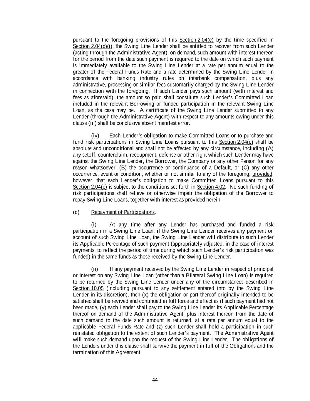 44 pursuant to the foregoing provisions of this Section 2.04(c) by the time specified in Section 2.04(c)(i), the Swing Line Lender shall be entitled to recover from such Lender (acting through the Administrative Agent), on demand, such amount with interest thereon for the period from the date such payment is required to the date on which such payment is immediately available to the Swing Line Lender at a rate per annum equal to the greater of the Federal Funds Rate and a rate determined by the Swing Line Lender in accordance with banking industry rules on interbank compensation, plus any administrative, processing or similar fees customarily charged by the Swing Line Lender in connection with the foregoing. If such Lender pays such amount (with interest and fees as aforesaid), the amount so paid shall constitute such Lender’s Committed Loan included in the relevant Borrowing or funded participation in the relevant Swing Line Loan, as the case may be. A certificate of the Swing Line Lender submitted to any Lender (through the Administrative Agent) with respect to any amounts owing under this clause (iii) shall be conclusive absent manifest error. (iv) Each Lender’s obligation to make Committed Loans or to purchase and fund risk participations in Swing Line Loans pursuant to this Section 2.04(c) shall be absolute and unconditional and shall not be affected by any circumstance, including (A) any setoff, counterclaim, recoupment, defense or other right which such Lender may have against the Swing Line Lender, the Borrower, the Company or any other Person for any reason whatsoever, (B) the occurrence or continuance of a Default, or (C) any other occurrence, event or condition, whether or not similar to any of the foregoing; provided, however, that each Lender’s obligation to make Committed Loans pursuant to this Section 2.04(c) is subject to the conditions set forth in Section 4.02. No such funding of risk participations shall relieve or otherwise impair the obligation of the Borrower to repay Swing Line Loans, together with interest as provided herein. (d) Repayment of Participations. (i) At any time after any Lender has purchased and funded a risk participation in a Swing Line Loan, if the Swing Line Lender receives any payment on account of such Swing Line Loan, the Swing Line Lender will distribute to such Lender its Applicable Percentage of such payment (appropriately adjusted, in the case of interest payments, to reflect the period of time during which such Lender’s risk participation was funded) in the same funds as those received by the Swing Line Lender. (ii) If any payment received by the Swing Line Lender in respect of principal or interest on any Swing Line Loan (other than a Bilateral Swing Line Loan) is required to be returned by the Swing Line Lender under any of the circumstances described in Section 10.05 (including pursuant to any settlement entered into by the Swing Line Lender in its discretion), then (x) the obligation or part thereof originally intended to be satisfied shall be revived and continued in full force and effect as if such payment had not been made, (y) each Lender shall pay to the Swing Line Lender its Applicable Percentage thereof on demand of the Administrative Agent, plus interest thereon from the date of such demand to the date such amount is returned, at a rate per annum equal to the applicable Federal Funds Rate and (z) such Lender shall hold a participation in such reinstated obligation to the extent of such Lender’s payment. The Administrative Agent will make such demand upon the request of the Swing Line Lender. The obligations of the Lenders under this clause shall survive the payment in full of the Obligations and the termination of this Agreement.
