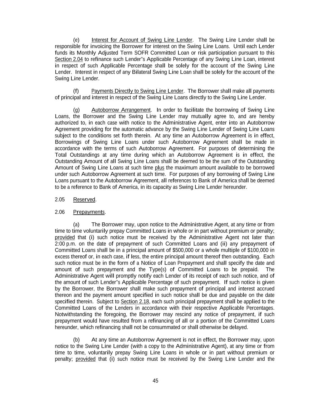 45 (e) Interest for Account of Swing Line Lender. The Swing Line Lender shall be responsible for invoicing the Borrower for interest on the Swing Line Loans. Until each Lender funds its Monthly Adjusted Term SOFR Committed Loan or risk participation pursuant to this Section 2.04 to refinance such Lender’s Applicable Percentage of any Swing Line Loan, interest in respect of such Applicable Percentage shall be solely for the account of the Swing Line Lender. Interest in respect of any Bilateral Swing Line Loan shall be solely for the account of the Swing Line Lender. (f) Payments Directly to Swing Line Lender. The Borrower shall make all payments of principal and interest in respect of the Swing Line Loans directly to the Swing Line Lender. (g) Autoborrow Arrangement. In order to facilitate the borrowing of Swing Line Loans, the Borrower and the Swing Line Lender may mutually agree to, and are hereby authorized to, in each case with notice to the Administrative Agent, enter into an Autoborrow Agreement providing for the automatic advance by the Swing Line Lender of Swing Line Loans subject to the conditions set forth therein. At any time an Autoborrow Agreement is in effect, Borrowings of Swing Line Loans under such Autoborrow Agreement shall be made in accordance with the terms of such Autoborrow Agreement. For purposes of determining the Total Outstandings at any time during which an Autoborrow Agreement is in effect, the Outstanding Amount of all Swing Line Loans shall be deemed to be the sum of the Outstanding Amount of Swing Line Loans at such time plus the maximum amount available to be borrowed under such Autoborrow Agreement at such time. For purposes of any borrowing of Swing Line Loans pursuant to the Autoborrow Agreement, all references to Bank of America shall be deemed to be a reference to Bank of America, in its capacity as Swing Line Lender hereunder. 2.05 Reserved. 2.06 Prepayments. (a) The Borrower may, upon notice to the Administrative Agent, at any time or from time to time voluntarily prepay Committed Loans in whole or in part without premium or penalty; provided that (i) such notice must be received by the Administrative Agent not later than 2:00 p.m. on the date of prepayment of such Committed Loans and (ii) any prepayment of Committed Loans shall be in a principal amount of $500,000 or a whole multiple of $100,000 in excess thereof or, in each case, if less, the entire principal amount thereof then outstanding. Each such notice must be in the form of a Notice of Loan Prepayment and shall specify the date and amount of such prepayment and the Type(s) of Committed Loans to be prepaid. The Administrative Agent will promptly notify each Lender of its receipt of each such notice, and of the amount of such Lender’s Applicable Percentage of such prepayment. If such notice is given by the Borrower, the Borrower shall make such prepayment of principal and interest accrued thereon and the payment amount specified in such notice shall be due and payable on the date specified therein. Subject to Section 2.18, each such principal prepayment shall be applied to the Committed Loans of the Lenders in accordance with their respective Applicable Percentages. Notwithstanding the foregoing, the Borrower may rescind any notice of prepayment, if such prepayment would have resulted from a refinancing of all or a portion of the Committed Loans hereunder, which refinancing shall not be consummated or shall otherwise be delayed. (b) At any time an Autoborrow Agreement is not in effect, the Borrower may, upon notice to the Swing Line Lender (with a copy to the Administrative Agent), at any time or from time to time, voluntarily prepay Swing Line Loans in whole or in part without premium or penalty; provided that (i) such notice must be received by the Swing Line Lender and the