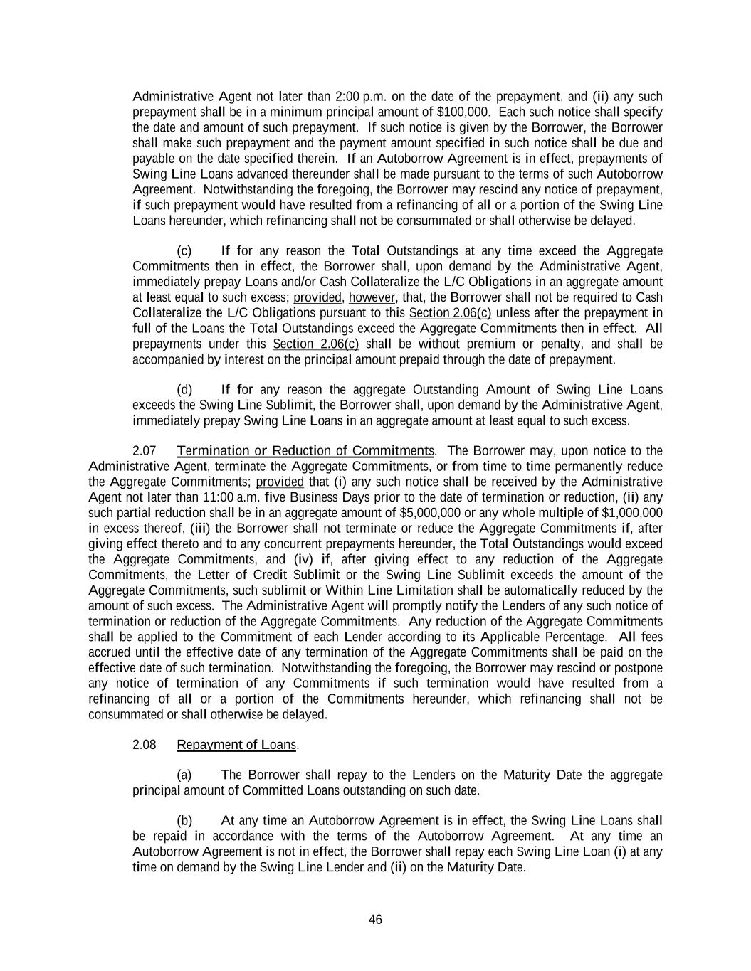 46 Administrative Agent not later than 2:00 p.m. on the date of the prepayment, and (ii) any such prepayment shall be in a minimum principal amount of $100,000. Each such notice shall specify the date and amount of such prepayment. If such notice is given by the Borrower, the Borrower shall make such prepayment and the payment amount specified in such notice shall be due and payable on the date specified therein. If an Autoborrow Agreement is in effect, prepayments of Swing Line Loans advanced thereunder shall be made pursuant to the terms of such Autoborrow Agreement. Notwithstanding the foregoing, the Borrower may rescind any notice of prepayment, if such prepayment would have resulted from a refinancing of all or a portion of the Swing Line Loans hereunder, which refinancing shall not be consummated or shall otherwise be delayed. (c) If for any reason the Total Outstandings at any time exceed the Aggregate Commitments then in effect, the Borrower shall, upon demand by the Administrative Agent, immediately prepay Loans and/or Cash Collateralize the L/C Obligations in an aggregate amount at least equal to such excess; provided, however, that, the Borrower shall not be required to Cash Collateralize the L/C Obligations pursuant to this Section 2.06(c) unless after the prepayment in full of the Loans the Total Outstandings exceed the Aggregate Commitments then in effect. All prepayments under this Section 2.06(c) shall be without premium or penalty, and shall be accompanied by interest on the principal amount prepaid through the date of prepayment. (d) If for any reason the aggregate Outstanding Amount of Swing Line Loans exceeds the Swing Line Sublimit, the Borrower shall, upon demand by the Administrative Agent, immediately prepay Swing Line Loans in an aggregate amount at least equal to such excess. 2.07 Termination or Reduction of Commitments. The Borrower may, upon notice to the Administrative Agent, terminate the Aggregate Commitments, or from time to time permanently reduce the Aggregate Commitments; provided that (i) any such notice shall be received by the Administrative Agent not later than 11:00 a.m. five Business Days prior to the date of termination or reduction, (ii) any such partial reduction shall be in an aggregate amount of $5,000,000 or any whole multiple of $1,000,000 in excess thereof, (iii) the Borrower shall not terminate or reduce the Aggregate Commitments if, after giving effect thereto and to any concurrent prepayments hereunder, the Total Outstandings would exceed the Aggregate Commitments, and (iv) if, after giving effect to any reduction of the Aggregate Commitments, the Letter of Credit Sublimit or the Swing Line Sublimit exceeds the amount of the Aggregate Commitments, such sublimit or Within Line Limitation shall be automatically reduced by the amount of such excess. The Administrative Agent will promptly notify the Lenders of any such notice of termination or reduction of the Aggregate Commitments. Any reduction of the Aggregate Commitments shall be applied to the Commitment of each Lender according to its Applicable Percentage. All fees accrued until the effective date of any termination of the Aggregate Commitments shall be paid on the effective date of such termination. Notwithstanding the foregoing, the Borrower may rescind or postpone any notice of termination of any Commitments if such termination would have resulted from a refinancing of all or a portion of the Commitments hereunder, which refinancing shall not be consummated or shall otherwise be delayed. 2.08 Repayment of Loans. (a) The Borrower shall repay to the Lenders on the Maturity Date the aggregate principal amount of Committed Loans outstanding on such date. (b) At any time an Autoborrow Agreement is in effect, the Swing Line Loans shall be repaid in accordance with the terms of the Autoborrow Agreement. At any time an Autoborrow Agreement is not in effect, the Borrower shall repay each Swing Line Loan (i) at any time on demand by the Swing Line Lender and (ii) on the Maturity Date.